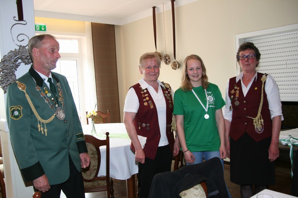Die Siegerehrung der Kreismeister 2014 wurde vom Sportleiterteam Andreas Pohl, Klaus Bollhorst, Karin Unruh und Ulla Müske vorgenommen. Andreas Pohl äußerte anschließend den Wunsch, doch im nächsten Jahr mehr Kreismeister aus den Vereinen zu mobilisieren, ihre Meisterschaftsehrung persönlich in Empfang zu nehmen. Für die jugendlichen Sportschützen gab es dann für erste bis dritte Plätze bei der Landesverbandsmeisterschaft und Deutschen Meisterschaft, sowie für weitere Platzierungen und Teilnahmen an den Lichtpunktmeisterschaften des NWSDB „Flachgeschenke“. Auf dem Foto steht zwischen Ulla Müske und Karin Unruh unsere stellvertretende BZ-Jugendsprecherin Lena Reuter.