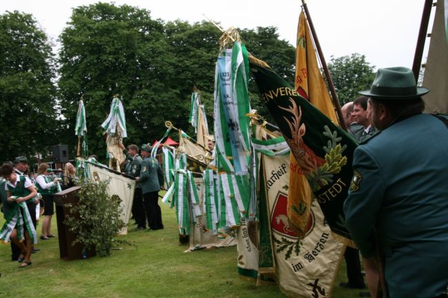 Dann begann der Festakt zum 100 jährigen Jubiläum des Schützenvereins Blockwinkel. Bei gutem Wetter, sprich trocken, konnte Vereinspräsident Helmut Riedemann gut 650 Schützen und Ehrengäste, sowie Ehrenmitglieder des Vereins, auf das Herzlichste begrüssen. Namentlich begrüsste er auch Hans Schwenn, nun schon 91 jährig, als den Mann, der 1949 den Verein erneut ins Leben gerufen hatte, sowie Ehrenpräsident Horst Schröder und Günter Herzig als Ehrenschießwart. Die Vereine hatten sich von Spielmannszügen begleitet, in Hufeisenform auf dem Blockwinkler Sportplatz aufgestellt. Es war schon ein imposantes Bild, mit den vielen Fahnen. Diese örtlichen Vereine waren mit vertreten: die Feuerwehren Scholen u. Blockwinkel, der Heimatverein sowie das DRK. Die Ansprachen von Jubiläumskönigin Sabine Prochazka, Ortsbürgermeister Karl-Heinz Schwenn, Samtgemeindebürgermeister Helmut Denker, die stellvertretende Landrätin Ulrike Schröder u. stellvertretender Landtagspräsident Karl-Heinz Klare waren zur Freude aller, recht kurz. Bezirksschützenpräsident Karl-Friedrich Scharrelmann überreichte Präsident Helmut Riedemann den Ehrenteller des Bezirks und die Ehrenmedaille des Deutschen Schützenbundes mit den besten Wünschen für die Zukunft des Vereins, und dem Wunsch, das Vereinsleben weiterhin interessant und lebendig zu gestalten. KV III-Präsident Dieter Lüdeke dankte bei seiner Ansprache aber auch den Fahnenträgern für ihre schwere Arbeit bei "Wind und Wetter". Die befreundeten Schützenvereine sparten nicht mit launigen Worten und "Flachgeschenken". Präsdent Helmut Riedemann, ließ noch einmal kurz das vergangene 100 jährige Vereinsleben revuepassieren. 1913 gab es Unstimmigkeiten im damaligen Schützenverein Scholen-Blockwinkel, wo das Schützenfest stattfinden sollte, denn der Schützenball wurde immer in Scholen durchgeführt, nun wollten die Blockwinkler, dass das Schützenfest auch immer in Blockwinkel stattfindet, nicht im Wechsel mit Scholen. Es wurde bei der Versammlung im Januar 1913 aber gegen den Blockwinkler Antrag gestimmt, so verliessen einige Blockwinkler die Versammlung und gründeten noch am selben Abend im Gasthaus Hörmann den Schützenverein Blockwinkel, der nun 100 Jahre ist. 2 Weltkriege waren überstanden, es gab die Fahnenweihen 1924 und 1996, Jubiläumsfeiern und sportliche Erfolge. Seit 1967 hat der Verein auch eine Damenschießgruppe, sie stellte bis heute 10 Vereinsköniginnen. Ab 1983 machten sich auch die Jugendlichen im Verein "stark". In dieser vergangenen Zeit gab es für den Verein einige Höhepunkte, sei es der Bau des Schießstandes, nutzbar für viele Veranstaltungen des Dorfes mit ihren Vereinen. Von 1993 an gab es viele Königs-, Ritter u. Prinzessinnentitel bei Landeskönigsschießen in verschiedenen Altersklassen, ebenso einen Kreiskönig, einmal und zwar 2001, errang Sabine Prochazka auch den Titel einer Bundesschützenkönigin in Wiesbaden. Viele Kreis-, Bezirks- und Landesmeistertitel wurden ebenfalls in den Jahren von den Sportschützen errungen. Den Verein führten bis heute 6 Präsidenten an. Der Verein war und ist noch immer ein Treffpunkt von Traditions- und Sportschützen.