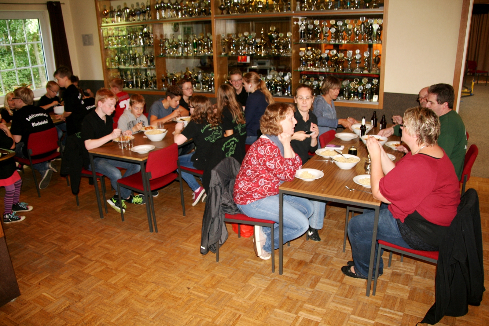 Im Aussenbereich wurden beim Cricket-Spiel die Schläge gezählt, das „Flaschendrehen“ erforderte viel Gefühl, den die Flaschen mussten sich beim Wurf einmal in der Luft “überschlagen“ und nach Möglichkeit auf dem Tisch stehen- oder liegenbleiben. Einen Tennisball mit einem auf dem Rücken befestigten Eimer auffangen, war auch nicht leicht. Das Dosenwerfen erforderte auch ein gewisses Maß an „Zielgenauigkeit“. Die Suche nach bestimmten Buchstaben in der richtigen Reihenfolge, im Aussenbereich, wurde mit „Geduld“ geschafft. Das Mikado-Spiel und der „Heiße Draht“, ist in der Schützenhalle absolviert worden. Unterbrochen wurden die Spiele leider durch ein Regenschauer, die Zeit wurde aber ausgenutzt um zu Essen, „Spaghetti Bolognese“.