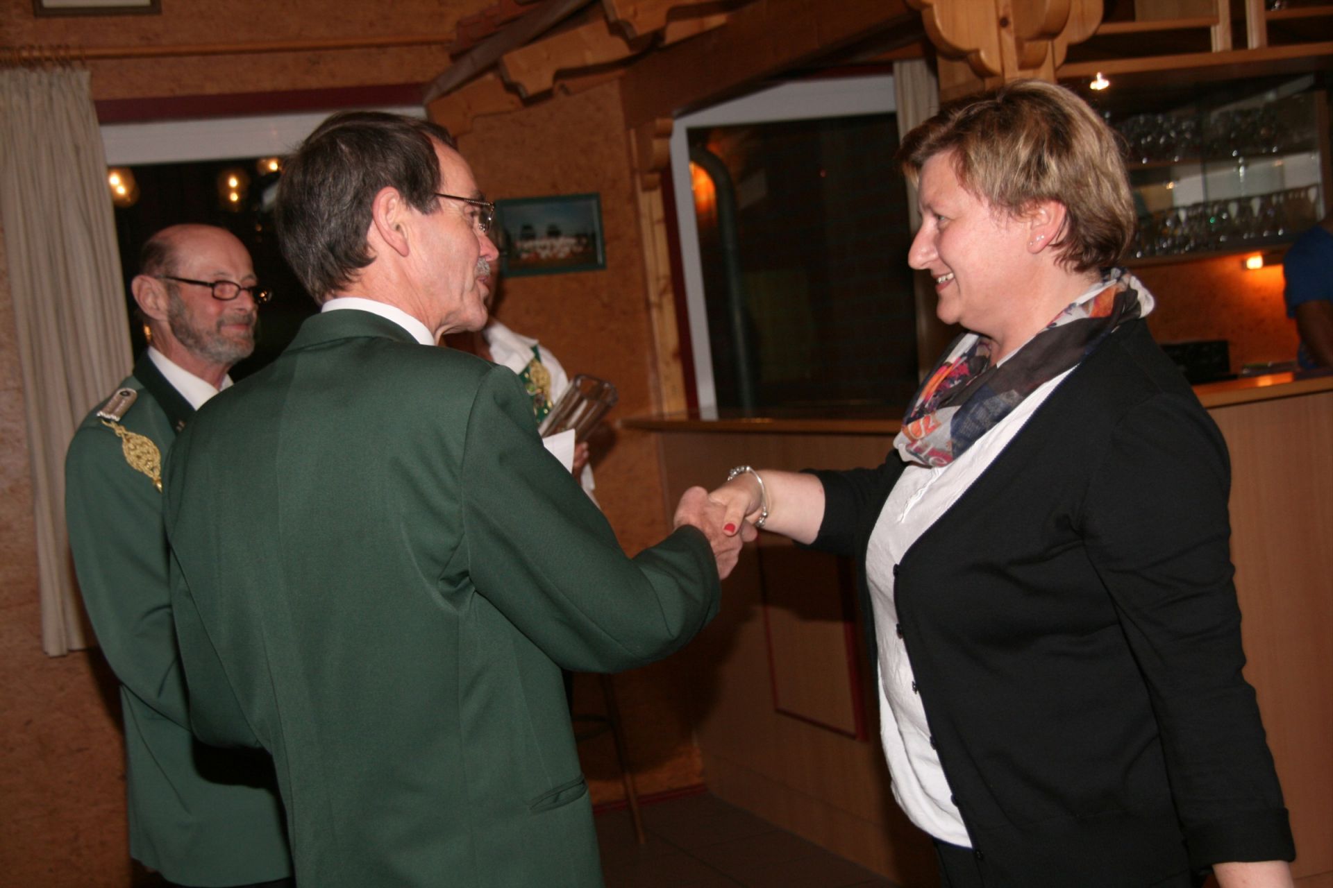 Nach dem Verkünden der Ergebnisse des Königsschießens, nahm Hella Denker den herzlichen Glückwunsch von KV-Präsident Dieter Lüdeke, glücklich entgegen, 98 Ringe war schon eine Spitzenleistung! Hermann Schoof vom SV von 1848 Sulingen, nahm Rang zwei mit 94 Ring ein, es folgten Frank Ruröde vom SV Brake mit 93 und Bärbel Müller von der SG von 1896 Sulingen mit 90 Ringen.