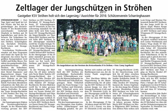 Zum Abschluss des Zeltlagers fand dann die Siegerehrung statt. In der Mannschaftswertung bis 11 Jahre lag der KSV Ströhen (2:31 Min.) knapp vor dem SV Strange-Buchhorst (2:40 Min.) und dem SV Dörrieloh (3:02 Min.). In der Altersgruppe 12 bis 14 Jahren lag die Mannschaft des KSV Ströhen (1:46 Min.) vor dem BSV Ströhen (2:02 Min.). In der Altersgruppe 15 bis 18 Jahren siegte der KSV Ströhen (1:35 Min.) wiederholt vor dem SV Dörrieloh (1:45 Min.) und dem SV Strange-Buchhorst (2:00 Min.). In der Einzelwertung weiblich bis 11 Jahre konnten Neele Marie Hadeler (SV Strange-Buchhorst), Lea-Sophie Stahlhofen (SV Strange-Buchhorst) und Okka Zierden (SV Scharringhausen) beste Ergebnisse erzielen. In der Altersgruppe männlich bis 11 Jahren sicherte sich Maximilian Harlaß (KSV Ströhen) vor Felix Lohmeier (SV Scharringhausen) und Milo Pätzold (SV Scharringhausen) den Sieg. In der Altersgruppe 12 bis 14 Jahren weiblich siegte Melina Meyer (KSV Ströhen) vor Merle Hilgemeier (BSV Ströhen). Den dritten Platz teilten sich Leah Dröge und Maxime Finkenstedt(beide KSV Ströhen). Bei den männlichen Teilnehmern 12 bis 14 Jahren siegte Matteo Kropp (KSV Ströhen) vor Robin Wenzel (KSV Ströhen) und Lukas Wiegmann (SV Strange-Buchhorst). In der Altersgruppe 15 bis 18 Jahren weiblich sicherten sich Carina Worthmann und Danica Wege (beide SV Dörrieloh) den ersten Platz vor Janika Schur (SV Dörrieloh) und Angy Gómez (SV Strange-Buchhorst). Bei den männlichen Teilnehmern 15 bis 18 Jahren gab es eine Sensation, denn es gab 3 Erstplazierte: Malte Dammeier und Mathis Wiegmann (beide SV Strange-Buchhorst) und Kai Lorch (KSV Ströhen). Platz 2 sicherte sich Jan Segelhorst (KSV Ströhen) und Platz 3 ging an Marvin Henkel (SV Strange-Buchhorst).