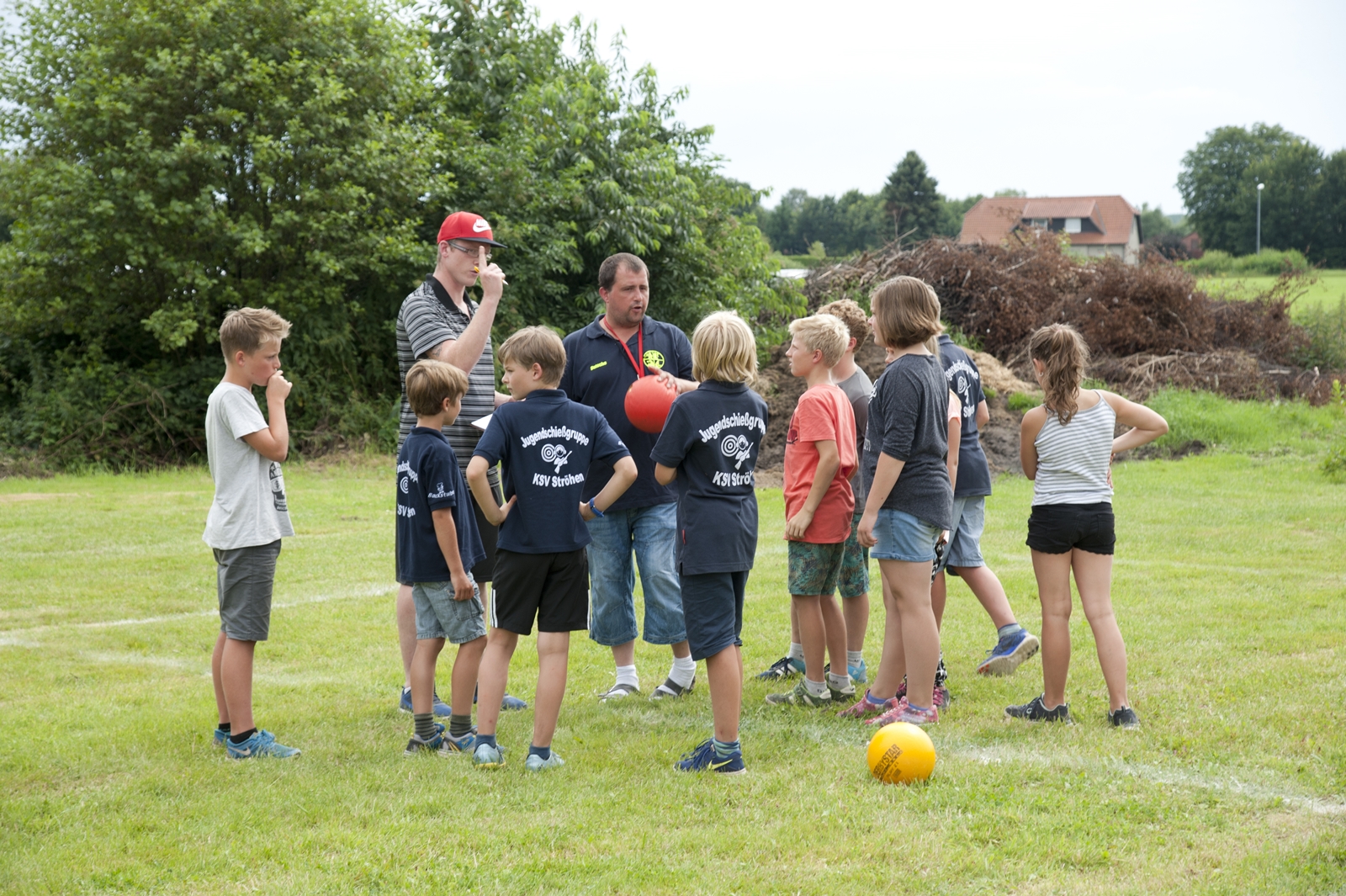 Der Freitagnachmittag stand im Zeichen der Anreise und des Zeltaufbaus beim Schießstand des KSV Ströhen, allerdings auf einem Nebenplatz, den ein Landwirt zur Verfügung gestellt hatte. So stand auf dem eigentlichen Schützenplatz genügend Raum zur Verfügung für ein großes Ess-Zelt, Umkleide- und Waschmöglichkeiten, verschiedene Spiel-Parcours sowie ein Pool-Becken, dass bei den teilweise tropischen Temperaturen zum Abkühlen einlud.
