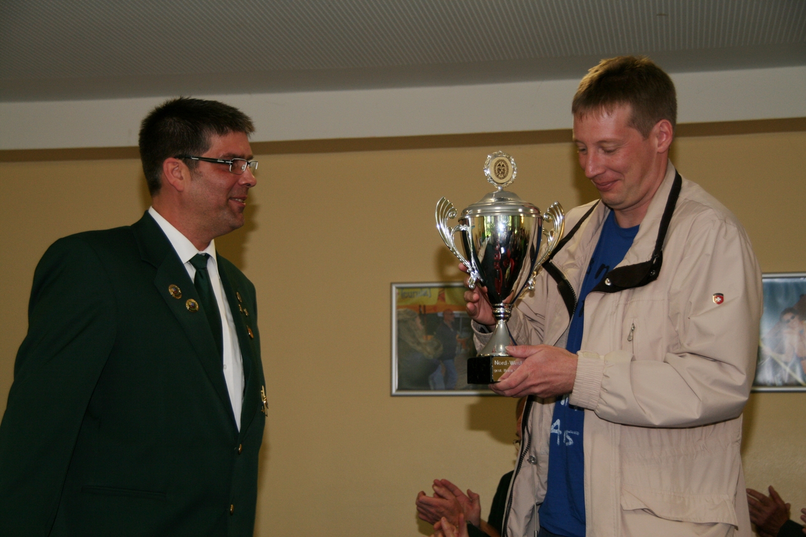 Jugendsportleiter Torsten Meinking überreichte Rainer Gaumann die Urkunde und Ehrennadel der Schützenjugend des NWDSB, stolz nahm Rainer sie in Empfang.