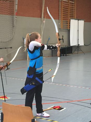 Jessika Emker als „Newcomerin“ im Bogensport vom Schützenverein Dörrieloh, erzielte in der weiblichen Schülerklasse B mit dem Recurve-Bogen 445 Ringe, dieses „reichte“ für einen tollen „Bronzeplatz“. Erst im Sommer 2014 hatte sie mit dem Bogensport begonnen, ihr Trainingsfleiß brachte sie nun nach Kreismeister- und Bezirksmeisterschaft erstmals aufs „Treppchen“ bei der Landesverbandsmeisterschaft.