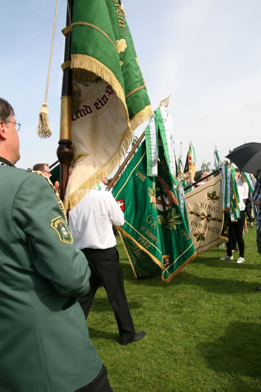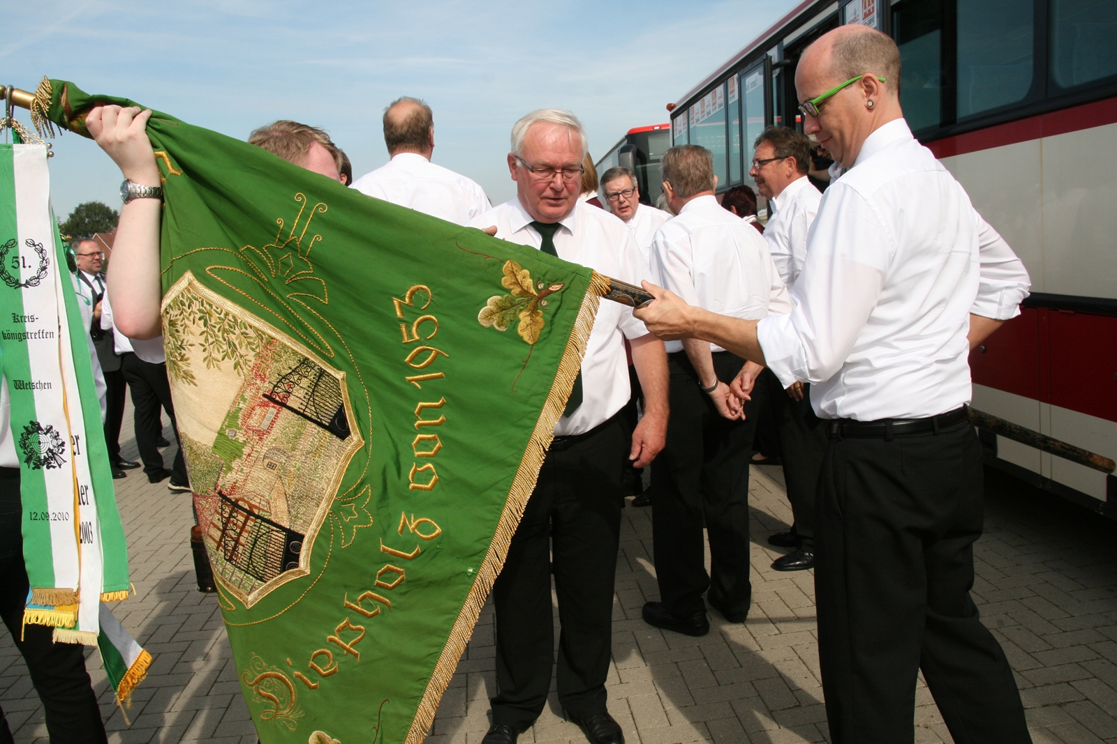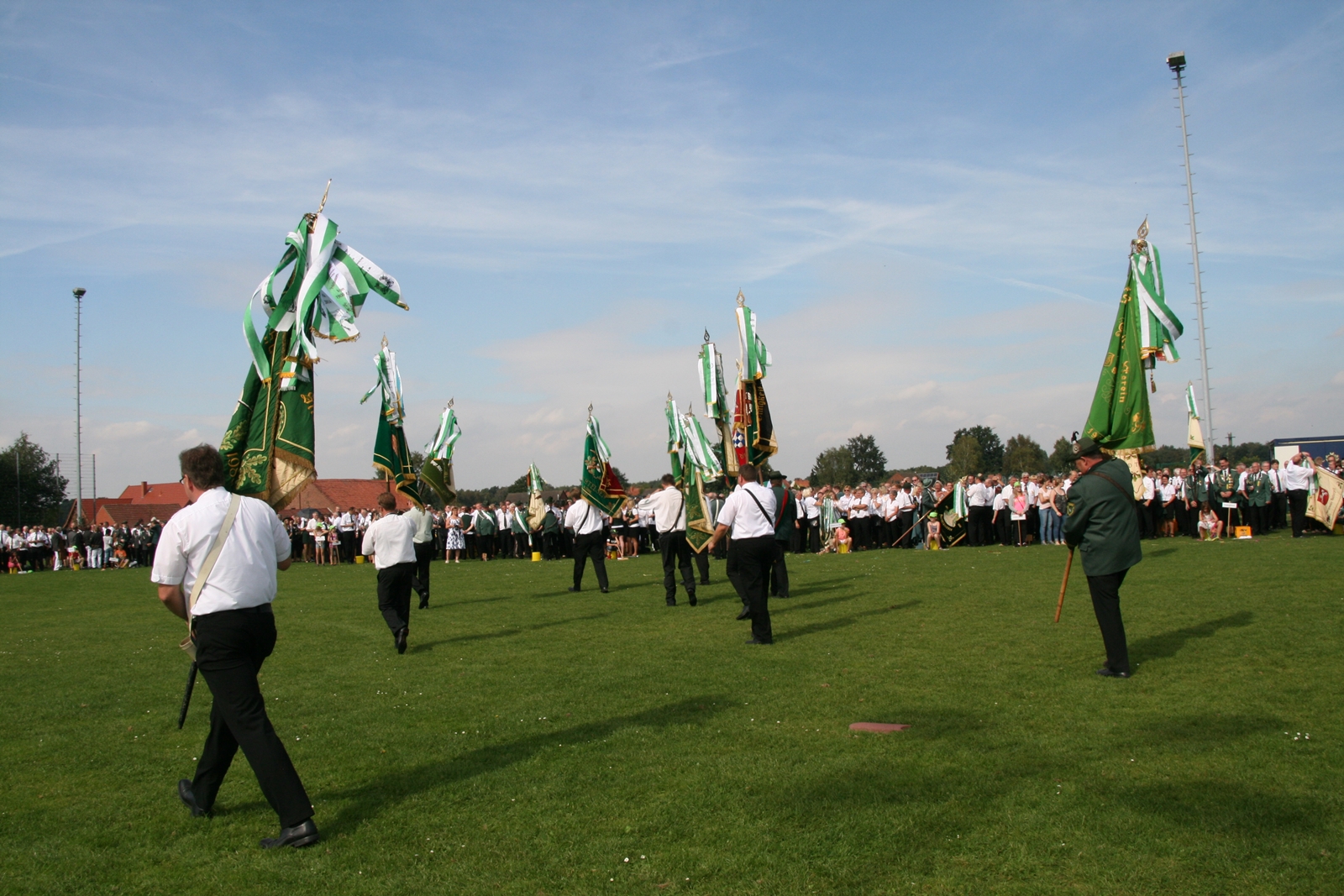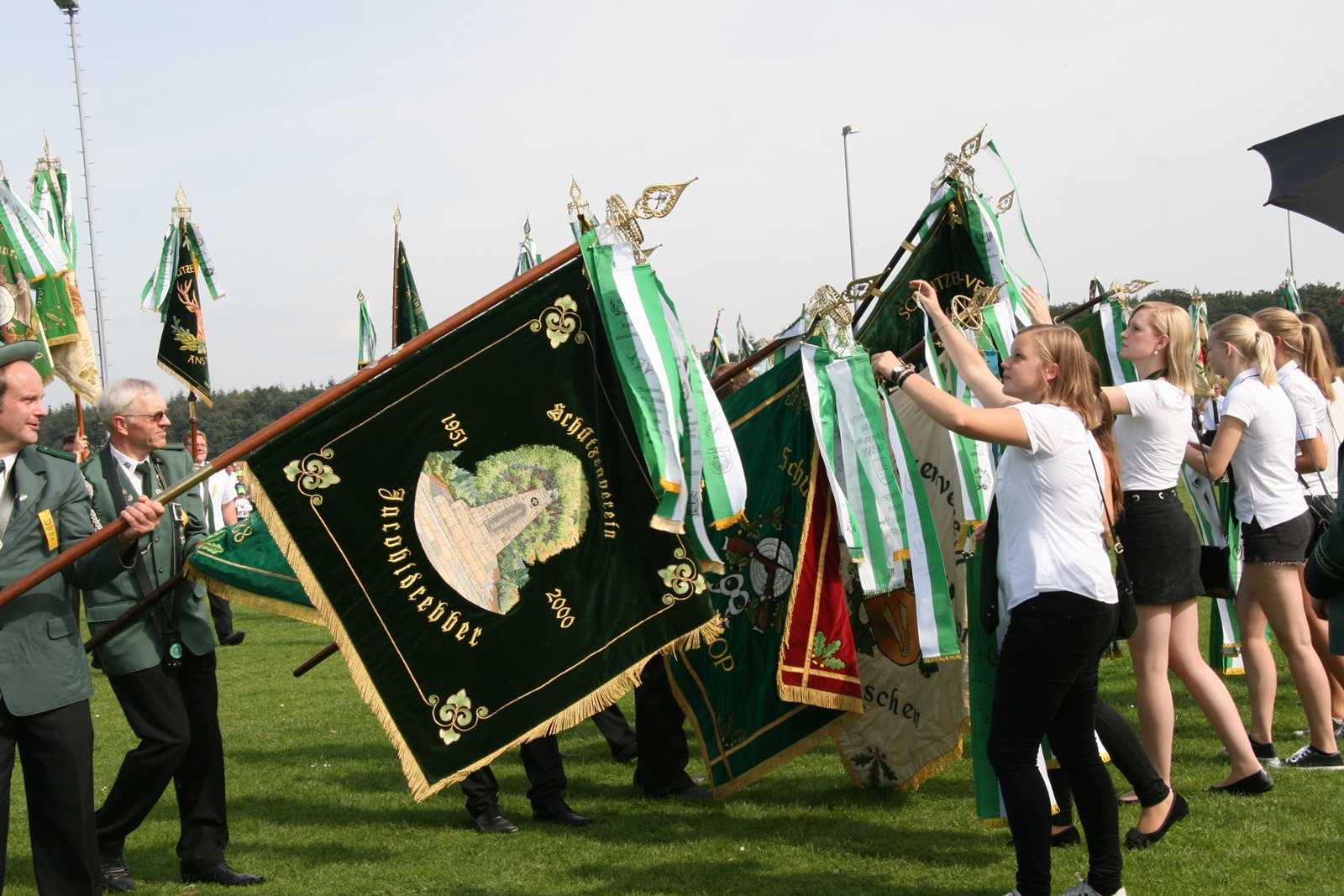 Dann waren die Fahnenträger gefragt, schnellen Schrittes kamen sie heran und erhielten von den jungen Schützendamen des Vereins Rehden die Fahnenbänder...