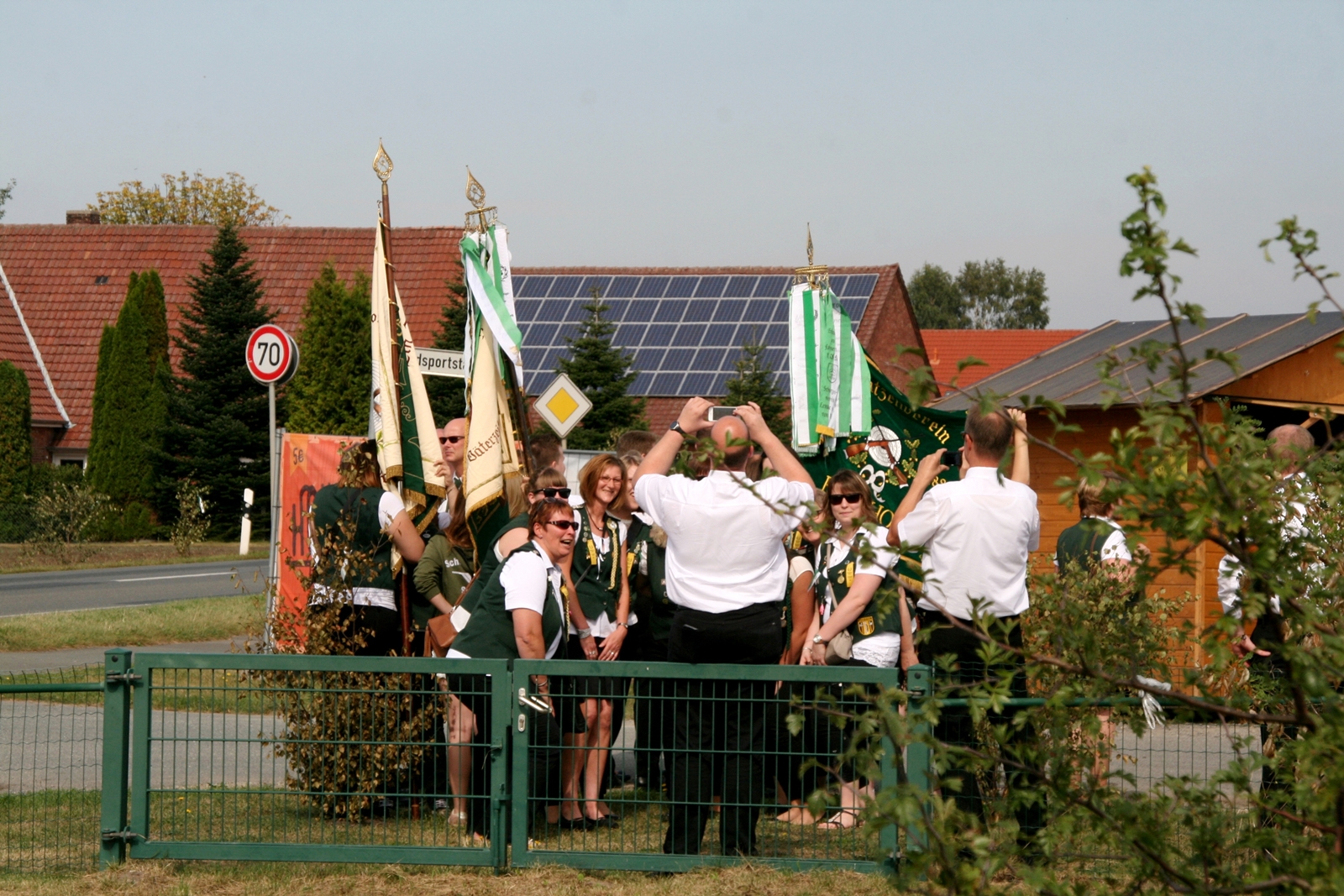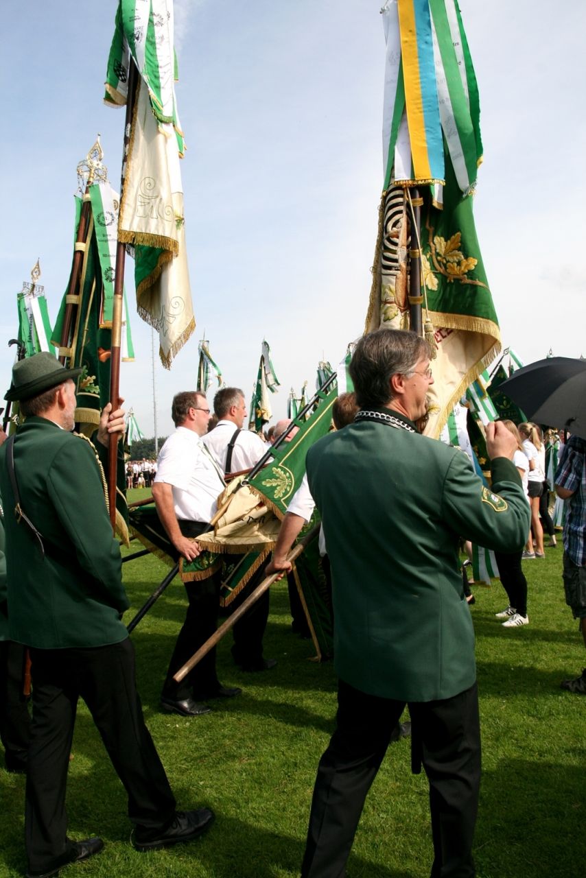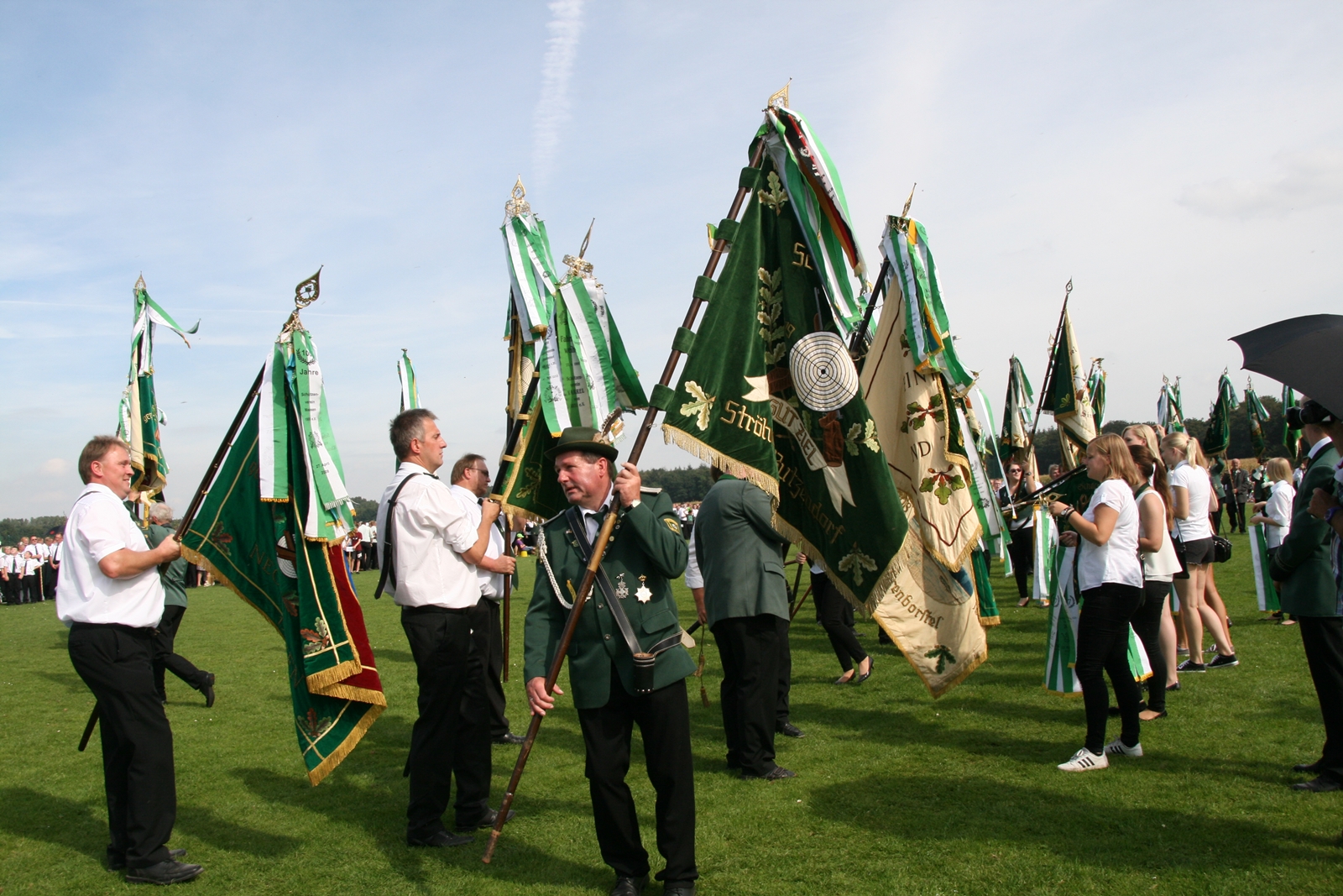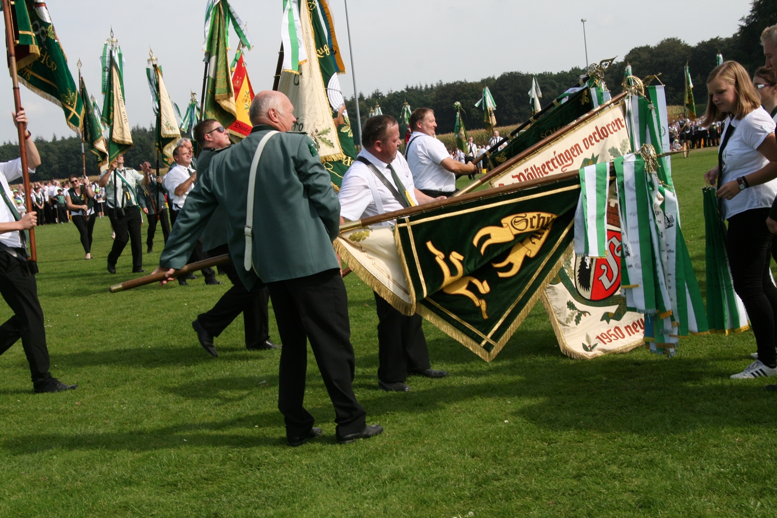 Dann waren die Fahnenträger gefragt, schnellen Schrittes kamen sie heran und erhielten von den jungen Schützendamen des Vereins Rehden die Fahnenbänder...