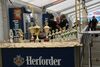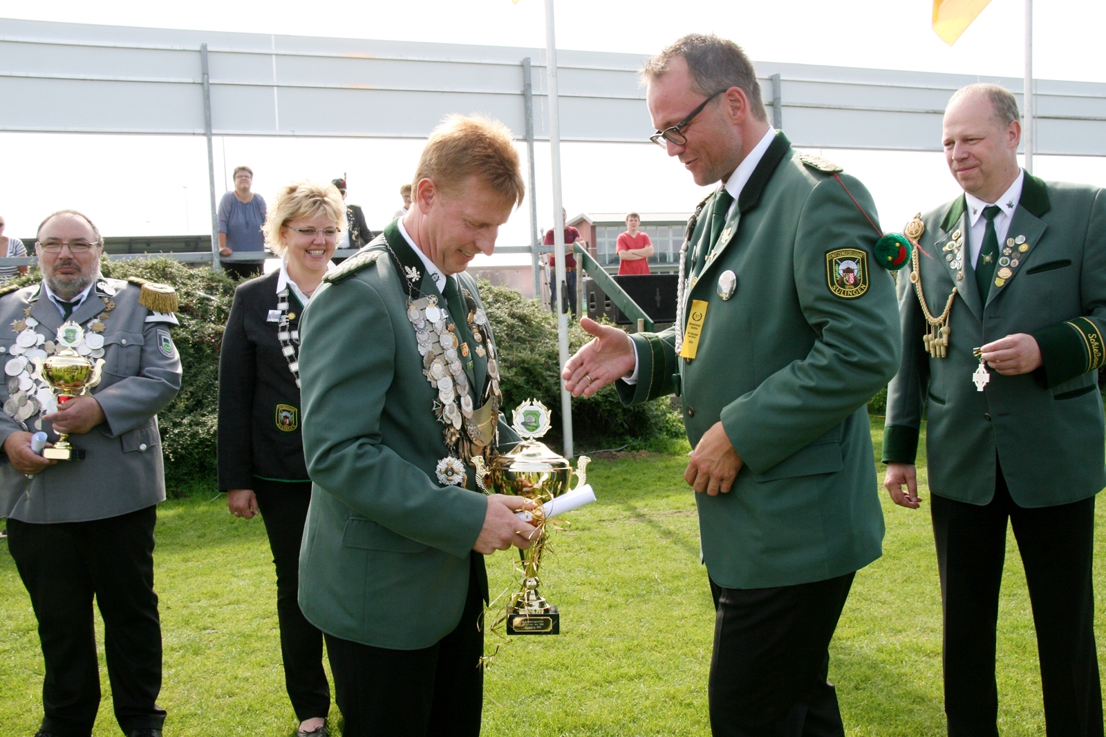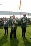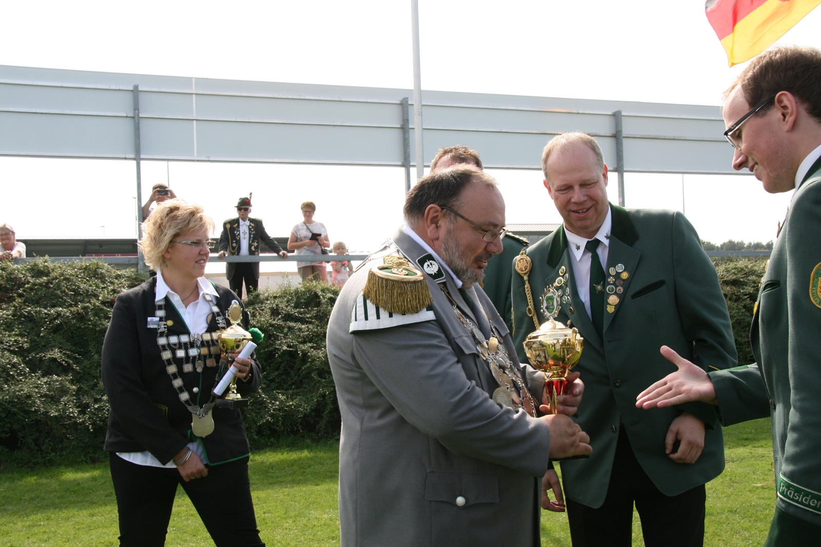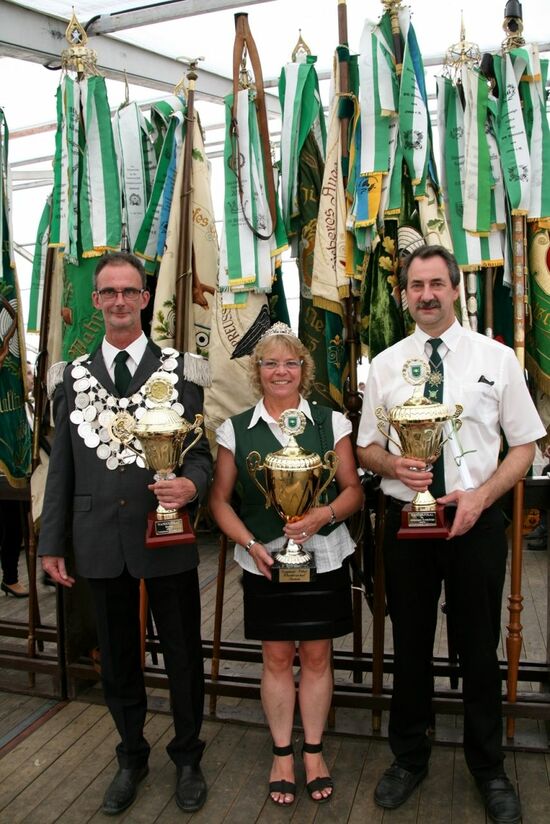 Die Empfänger der Wanderpokale v.l.: König Uwe Wilker für die Herren der Maifeier St. Hülfe-Heede, Königin Jutta Bruns für die Damen vom SV Hemsloh, sowie der Gewinner des Pokals ehemaliger Kreiskönige Rüdiger Hahn vom SV Rehden