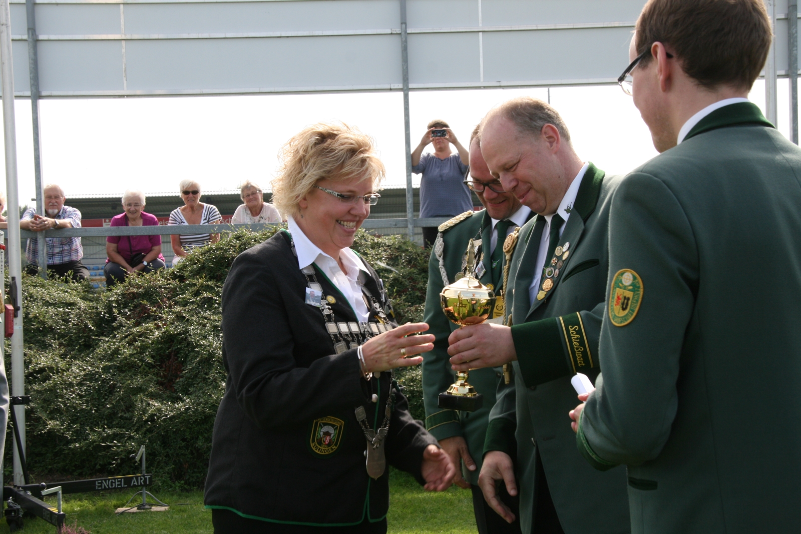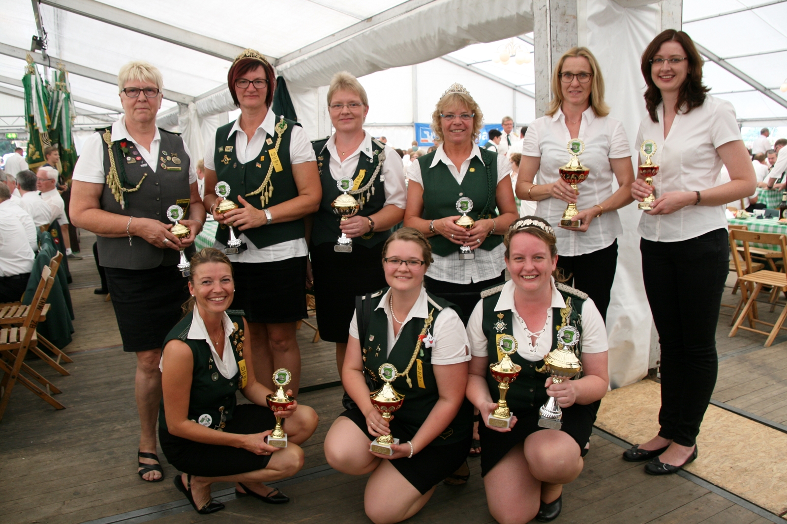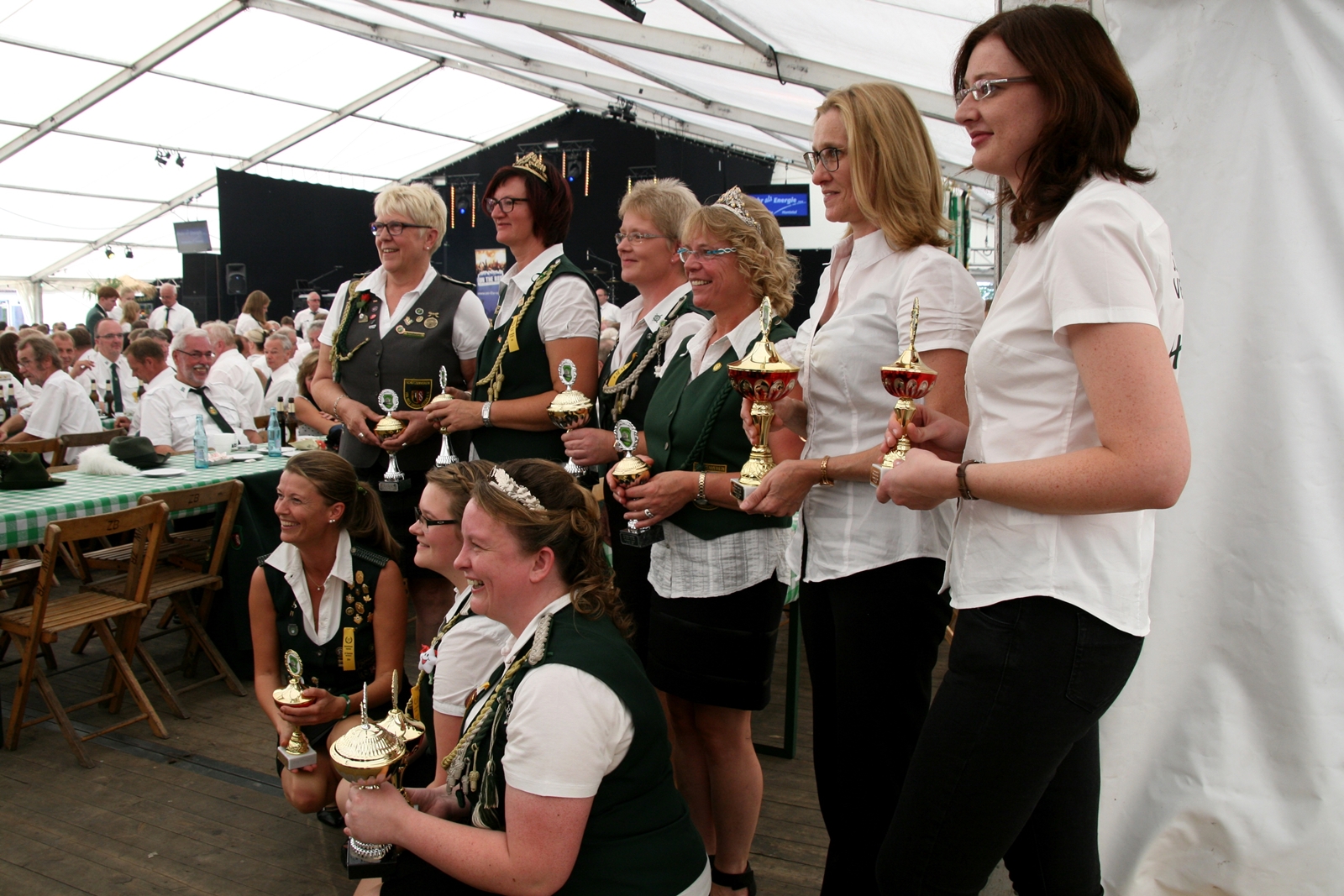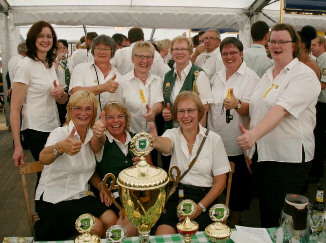 Freude pur bei den Damen vom SV Hemsloh mit ihrer Königin Jutta Bruns, sie halten die Daumen natürlich zurecht stolz nach oben. Solch einen großen Wanderpokal gewinnt man ja nicht alle Tage, 36 Damen-Mannschaften waren angetreten diesen "Pott" zu gewinnen, um ihn für ein Jahr bei sich im Vereinsheim zur "Schau" zu stellen.