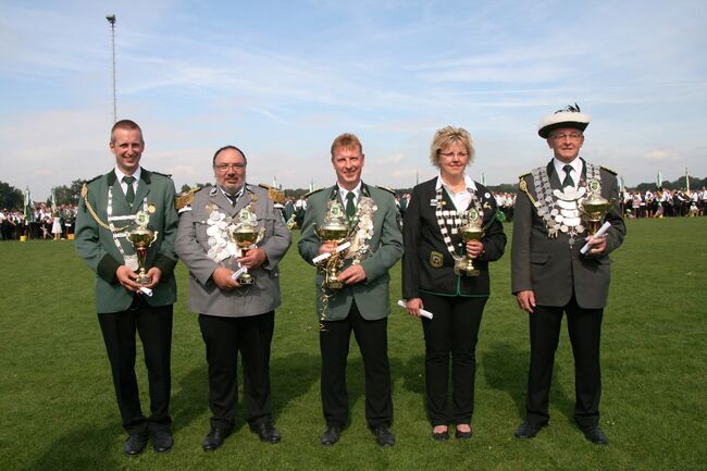 Ein Gesamtfoto mit den fünf Majestäten und von hinten links: 2. Vorsitzender Tobias Winkelmann-Bünte, Exkreiskönig Andreas Albers und 1. Schießwart Thomas Langhorst vom SV Rehden.