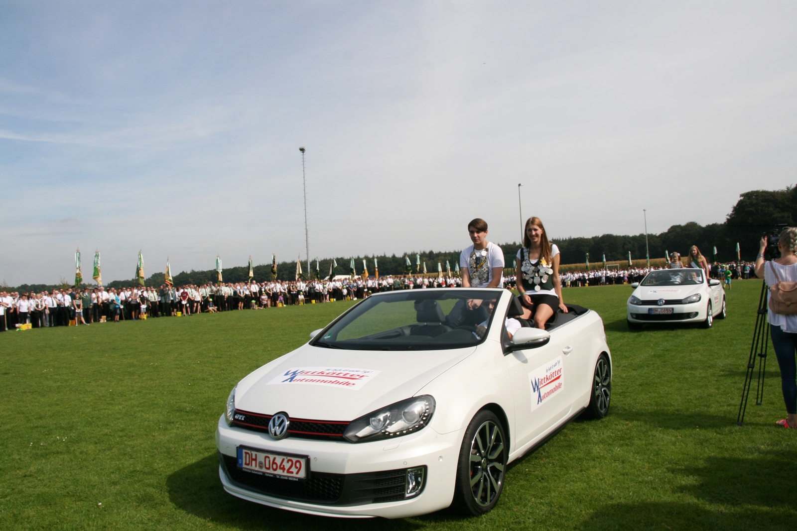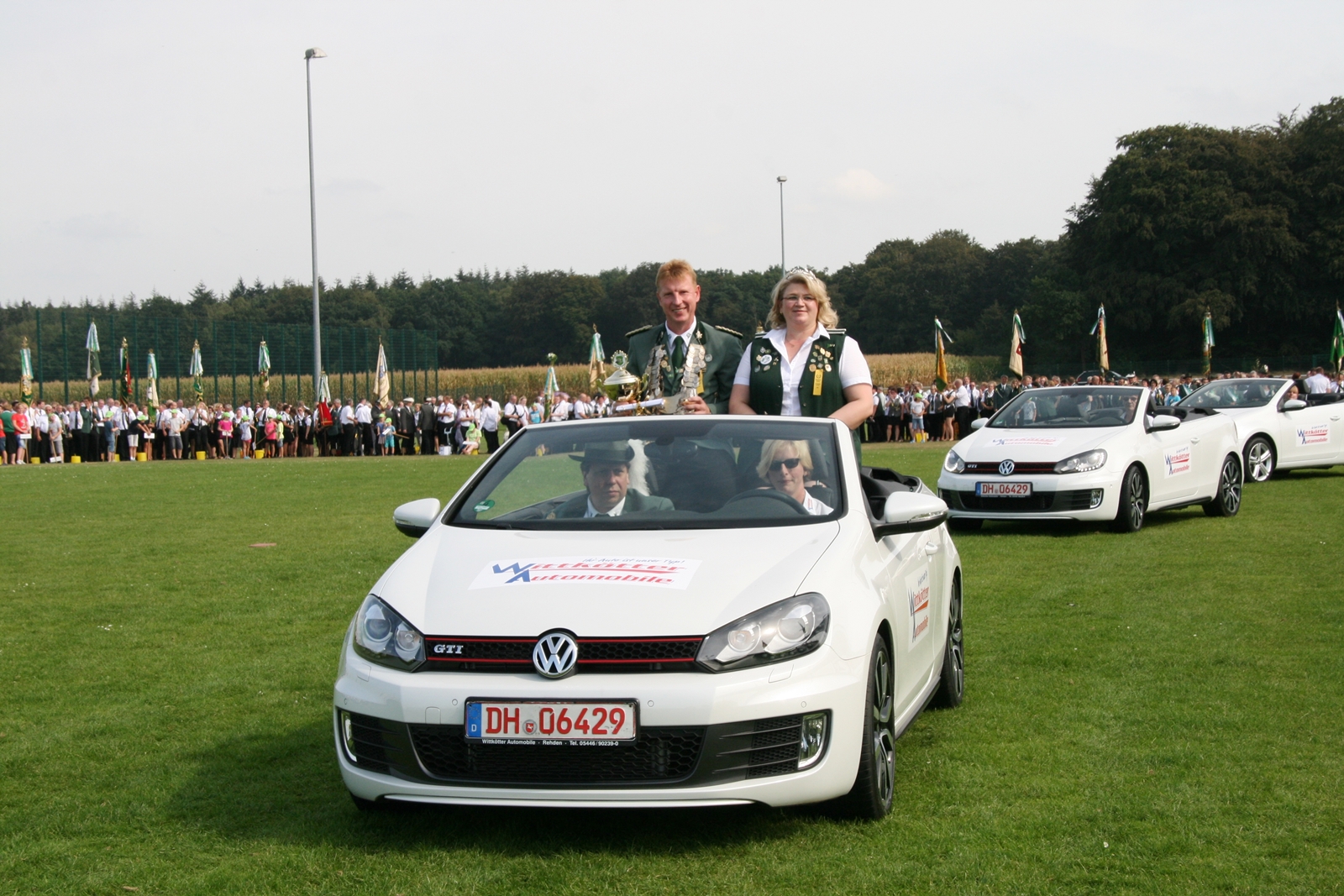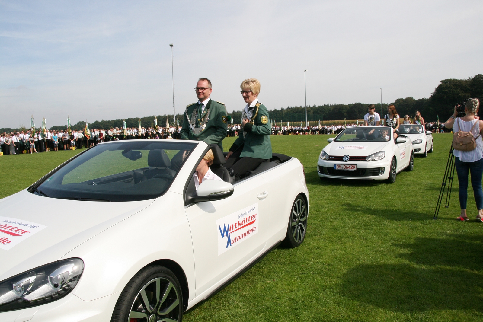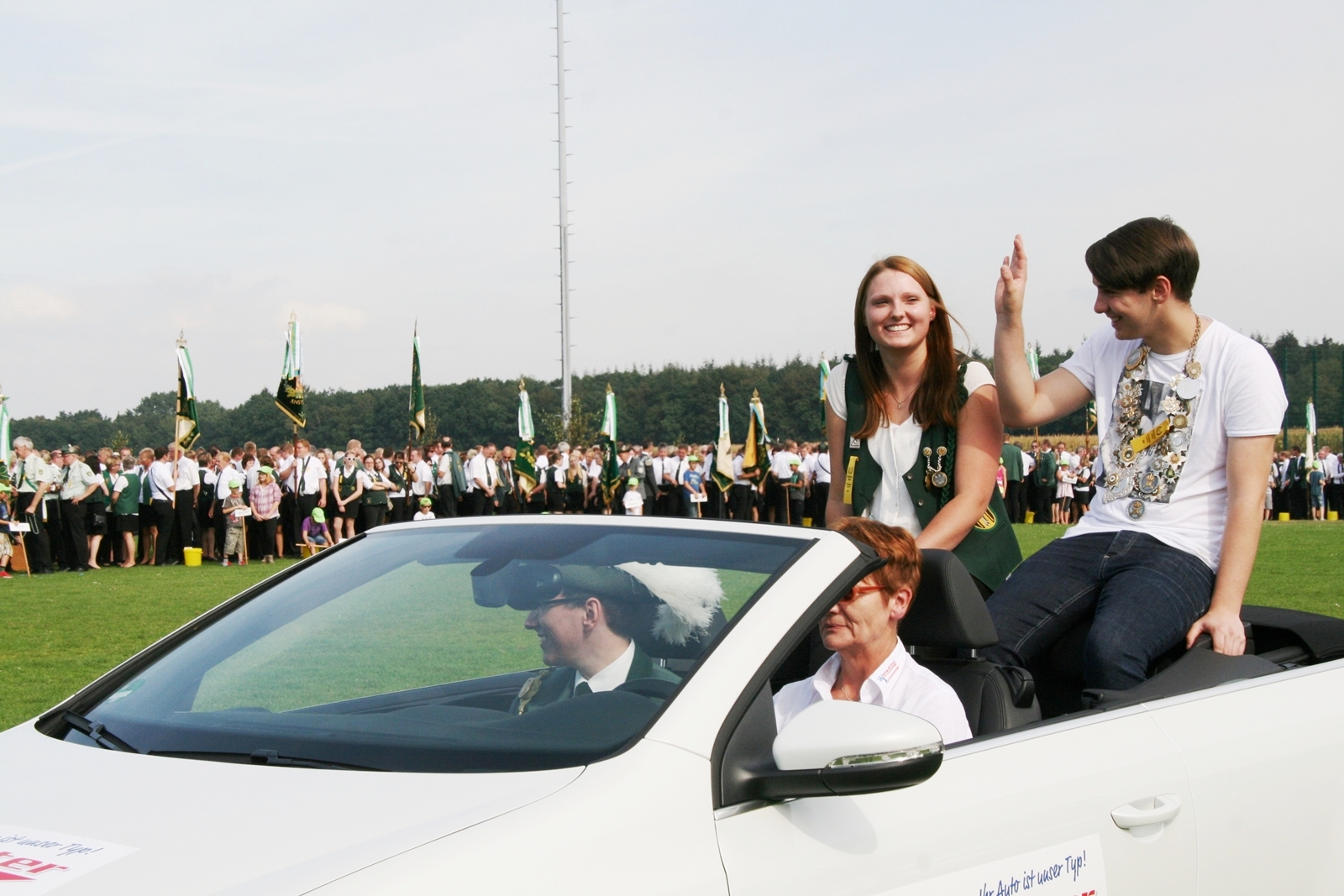 Dann "durfte" die noch amtierende Kreis-Majestät Andreas Albers mit der amtierenden Schützenkönigin des SV Rehden, Marion Bollhorst im Cabrio Platz nehmen. So nahmen sie gemeinsam mit den jugendlichen Majestäten unter großem Jubel die Front ab.