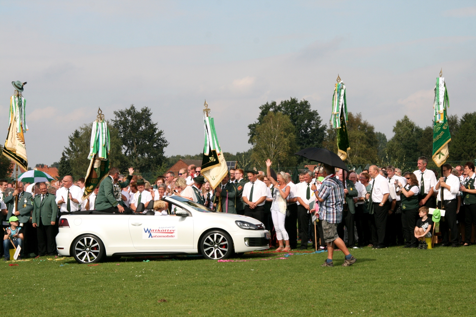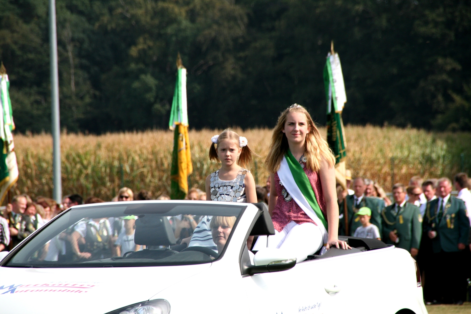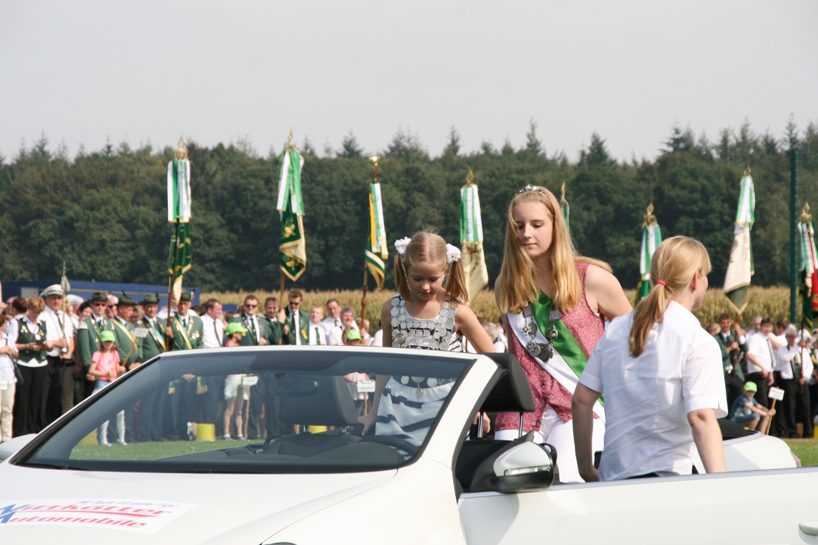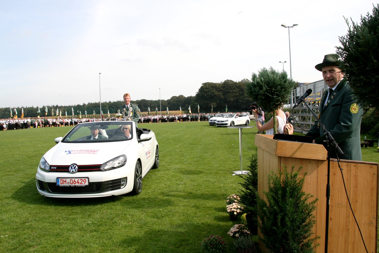 Dann "durfte" die noch amtierende Kreis-Majestät Andreas Albers mit der amtierenden Schützenkönigin des SV Rehden, Marion Bollhorst im Cabrio Platz nehmen. So nahmen sie gemeinsam mit den jugendlichen Majestäten unter großem Jubel die Front ab.