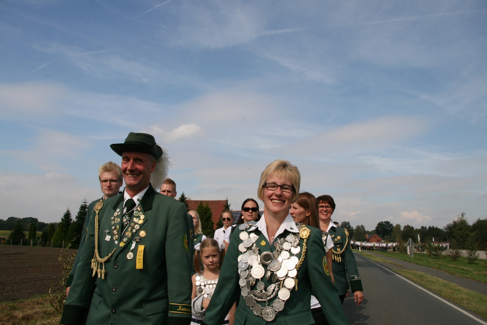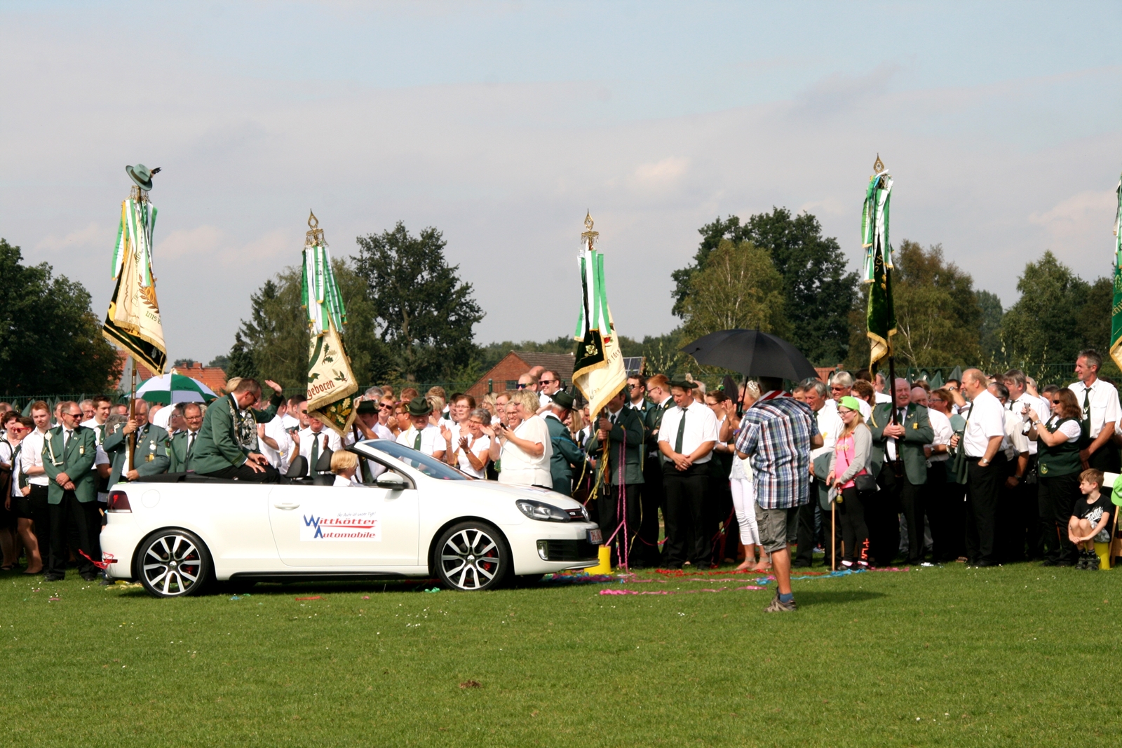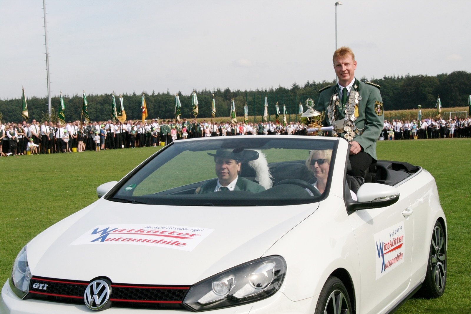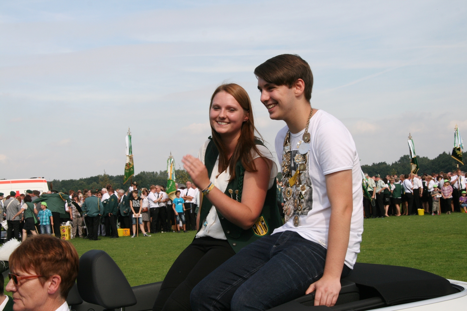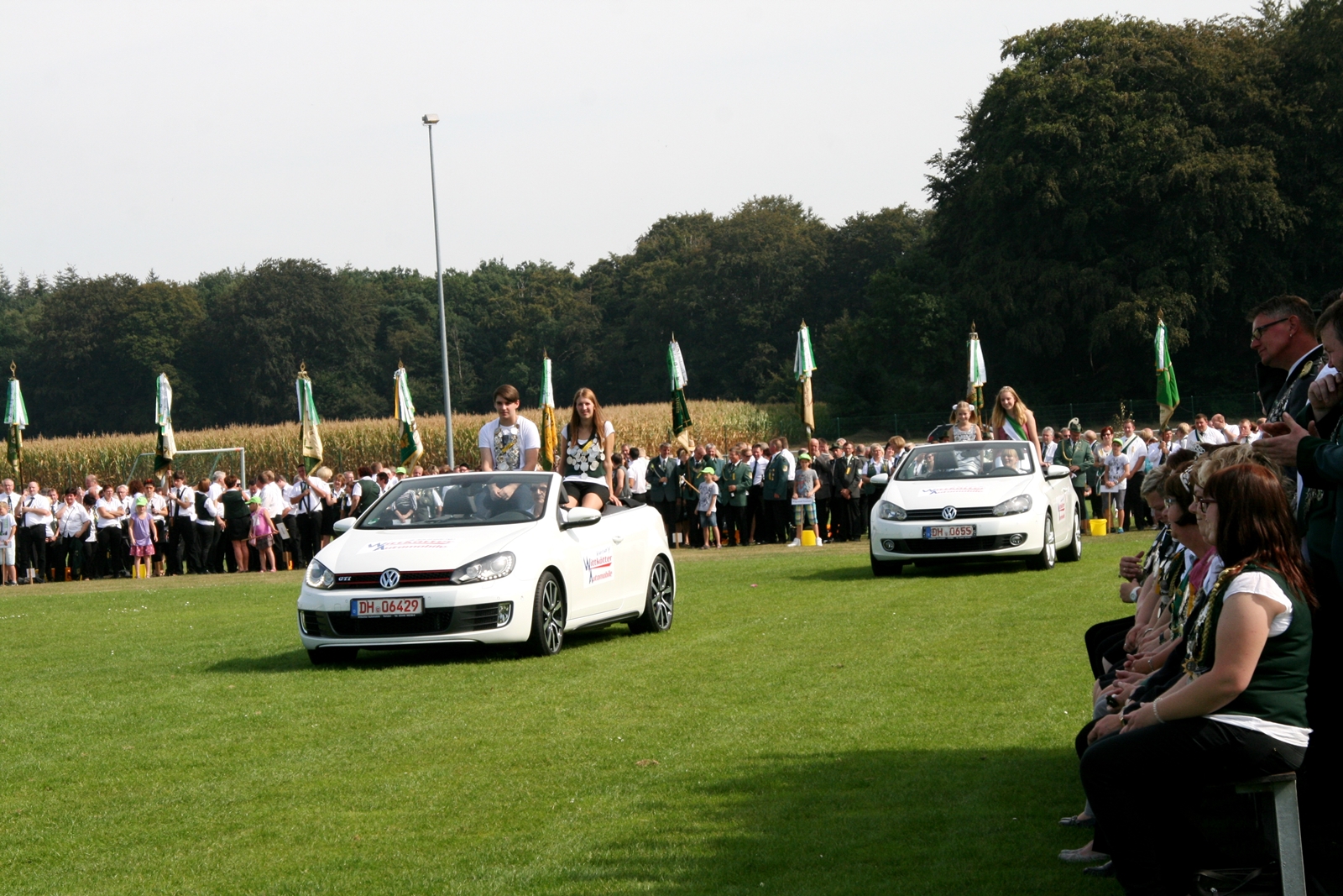 Dann "durfte" die noch amtierende Kreis-Majestät Andreas Albers mit der amtierenden Schützenkönigin des SV Rehden, Marion Bollhorst im Cabrio Platz nehmen. So nahmen sie gemeinsam mit den jugendlichen Majestäten unter großem Jubel die Front ab.