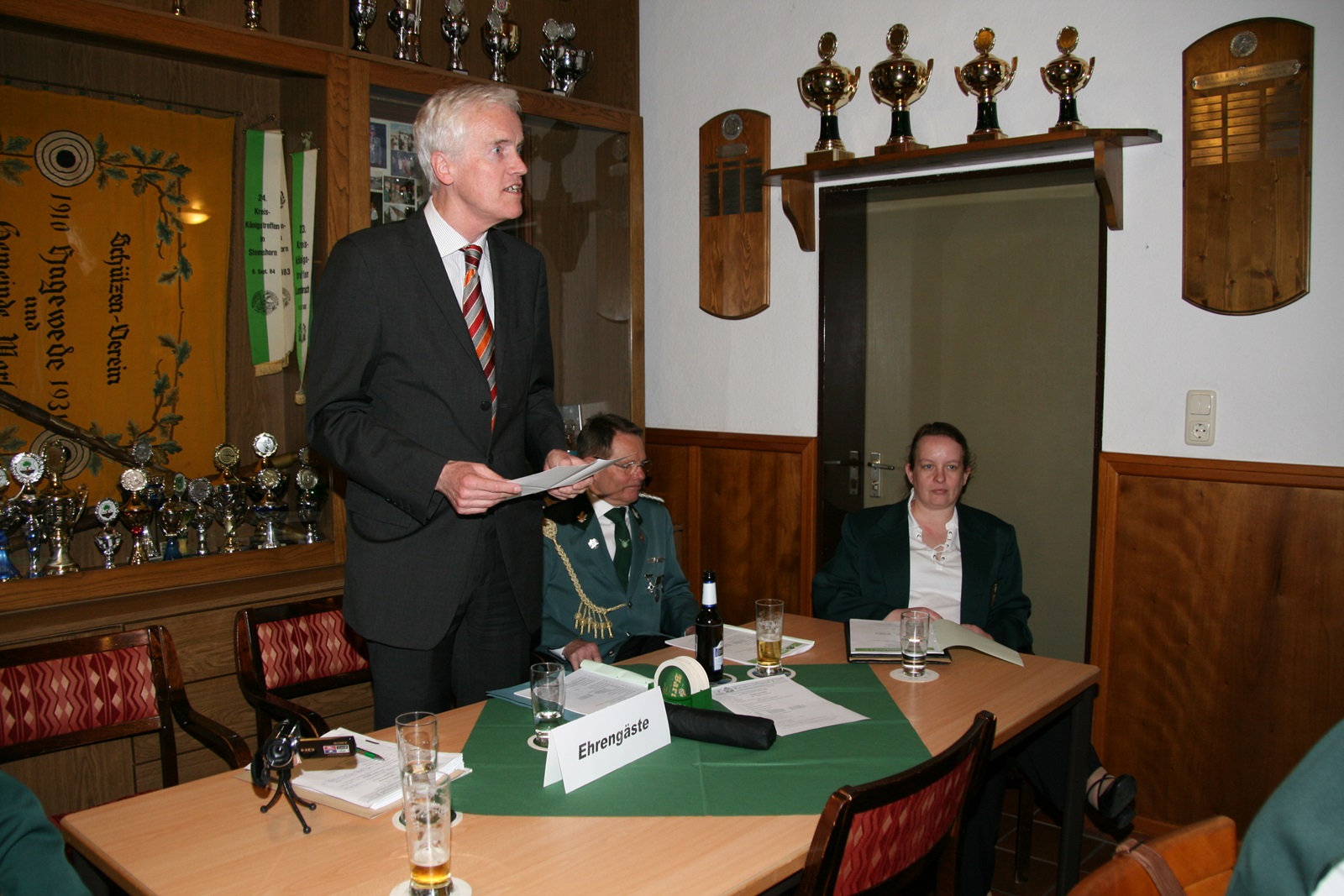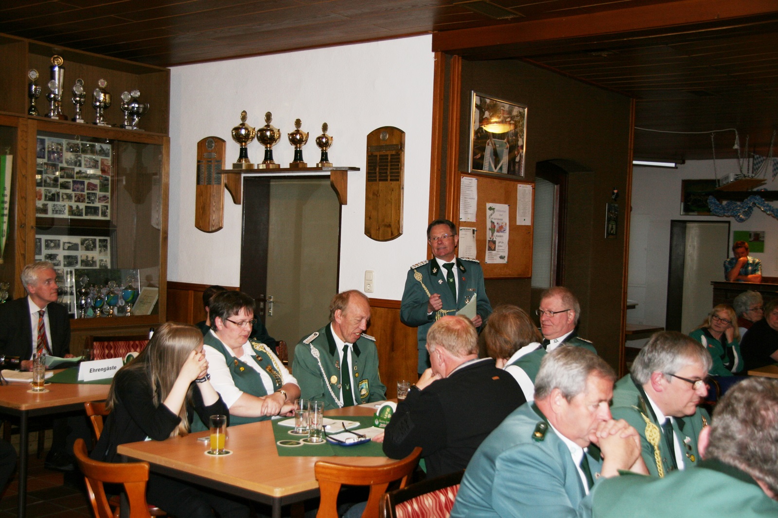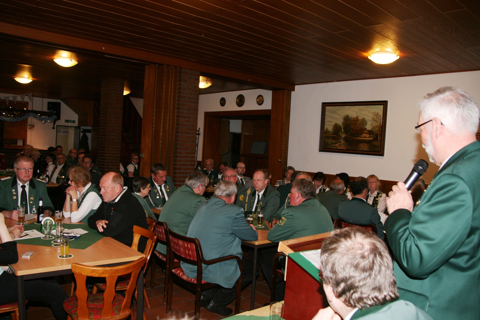 Friedrich Kelkenberg als Vizepräsident des Bezirks, übermittelte die herzlichsten Grüße des Bezirksvorstandes. Von den NWDSB-Schützentagen konnte er positiv berichten, dass es keine Beitragserhöhungen geben wird, dass dann wohl in Kürze auch mit der Fertigstellung der Kleinkaliberanlagen begonnen werden wird. Geklärt wird vorher noch, ob es nicht noch wieder neue Auflagen geben wird. Der Versammlung wünschte er einen guten Verlauf.