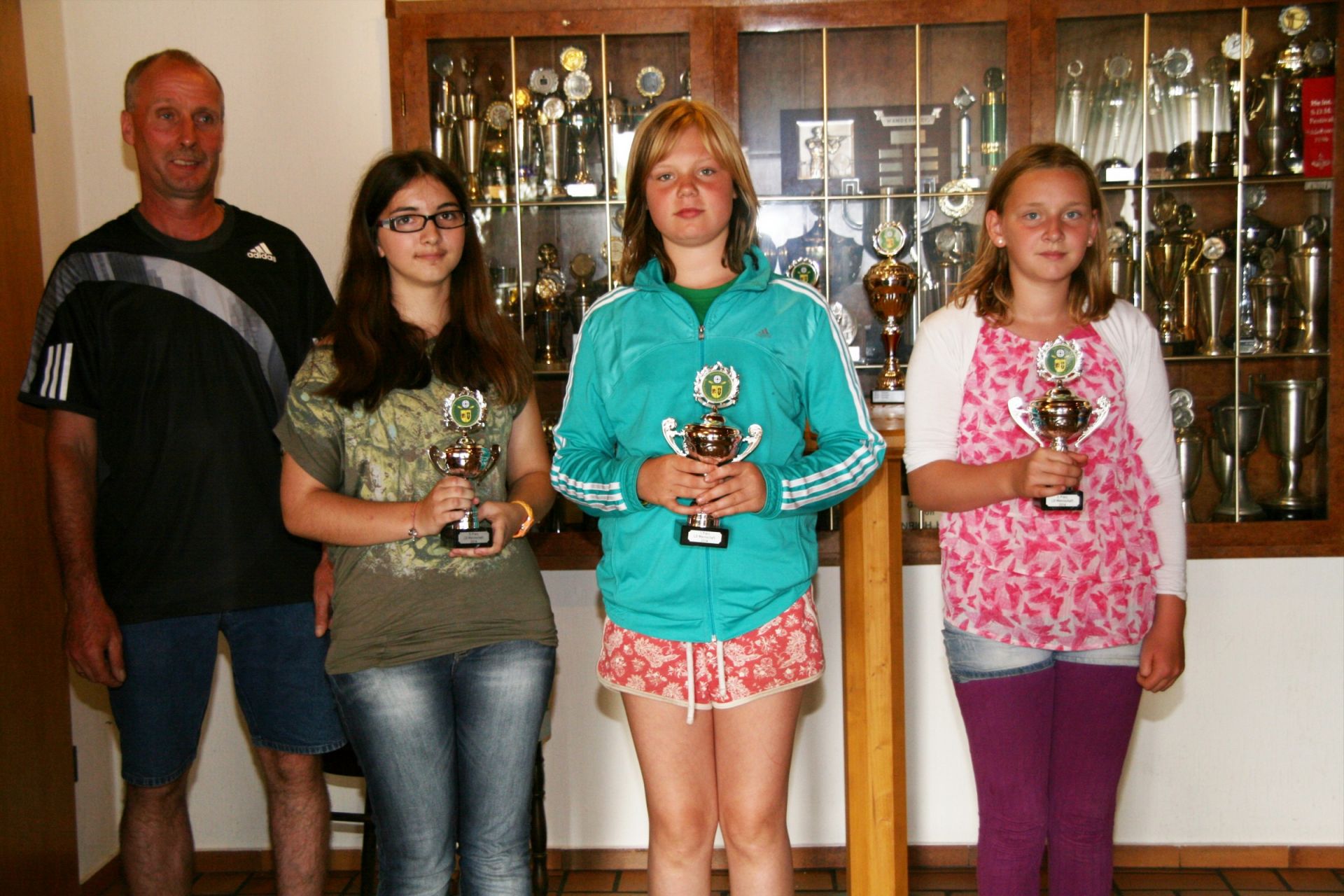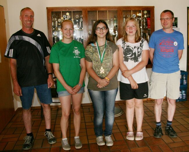 Stellvertretender Sportleiter Klaus Bollhorst und Jugendsportleiter des KV I Jörg Picker freuen sich mit den drei "Königsanwärterinnen": Ida Schmalge (106,6 R.) SV Brockum, Leonie Frommberger (107,2 R.) SV Rehden u. Ronja Finkenstädt (103,4 R.) SV Brockum. Ihre Ergebnisse lagen sehr knapp bei einander.