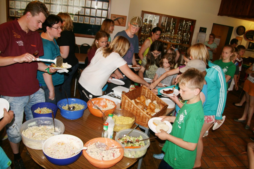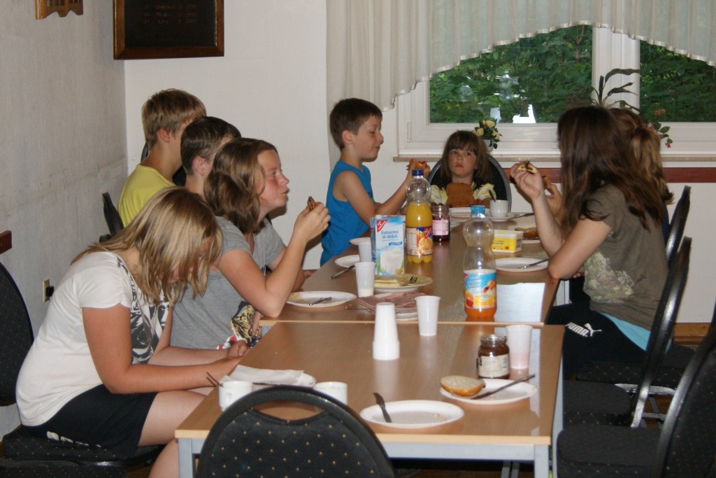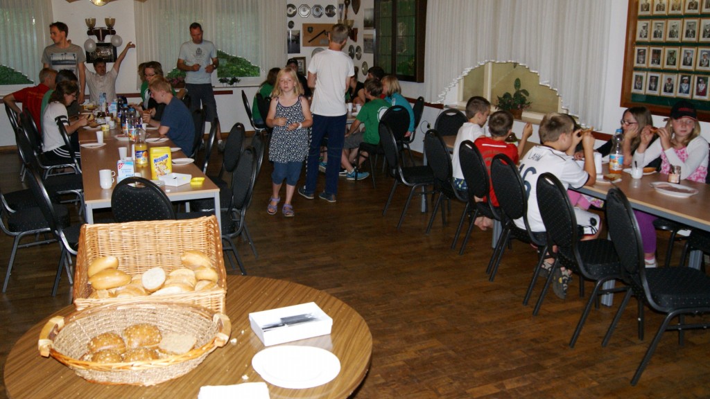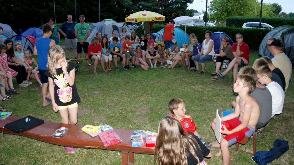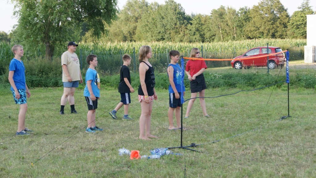 Der Nachtorientierungsmarsch stand um 21:30 Uhr auf dem Programm. 6 Gruppen, je 8 Kinder, ausgerüstet mit Karten und Taschenlampen, machten sich auf den Weg in Richtung Moorstraße und Baggersee. Unterwegs mussten Fragen beantwortet werden, unter anderen Spielen, fand auch ein "Flaschenkegeln" statt. Weit nach Mitternacht hatten alle 6 Gruppen ihre Aufgaben erfüllt. Die "Nachtruhe" trat zum Teil doch eher ein, als es sich die Kinder gedacht hatten, der heisse Tag mit fast 30° machte es möglich. Am Samstagmorgen um 7:30 Uhr war Wecken, und bis 9:00 Uhr hatten alle ausgiebig gefrühstückt. Der Staffellauf für alle, dauerte bis Mittag. Mittagessen und Mittagspause war dann bis 14.00 Uhr angesagt.Das Freibad war dann das "Highlight" des Tages, einige Kinder waren "Minigolfen". Nach dem Abendesssen (Grillen) von 18:00 bis 20:00 Uhr fand die Siegerehrung des Staffellaufes und der Nachtwanderung statt.