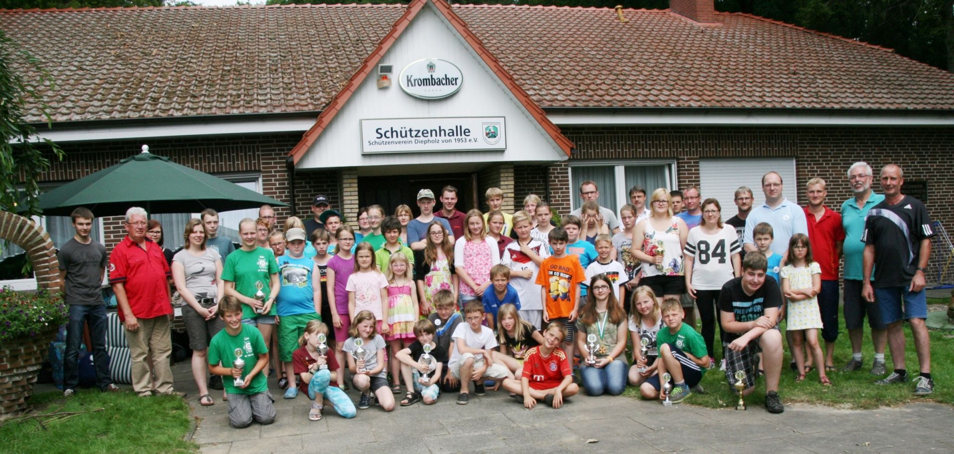 Nach der Siegerehrung der Luftgewehr und Lichtpunktwettkämpfe zum Abschluß des KV-Jugendtages, ließen sich am Sonntagmittag noch einmal die noch anwesenden Teilnehmer mit Siegern, Verantwortlichen und Betreuern für ein Erinnerungs-Foto "ablichten".