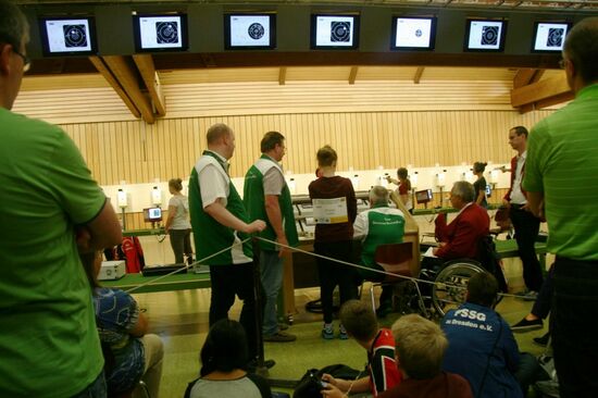 "Eingekreist" von Offiziellen des DSB, wird ihre Luftpistole noch einmal überprüft...