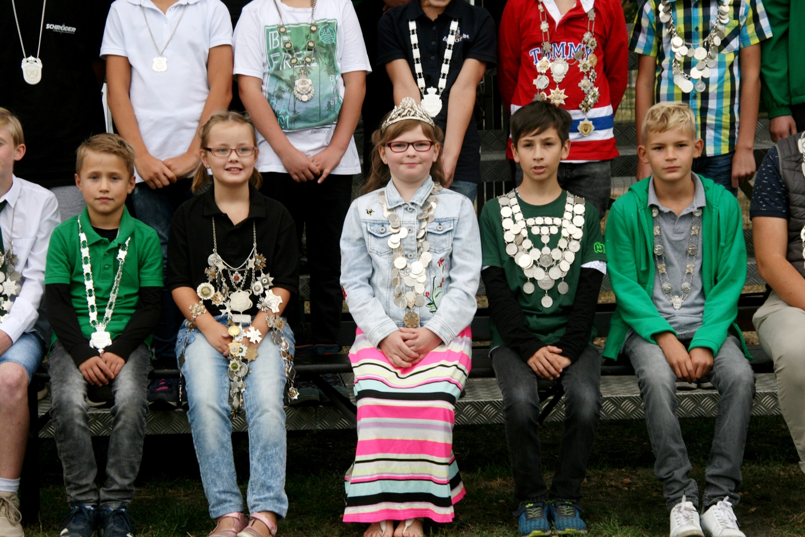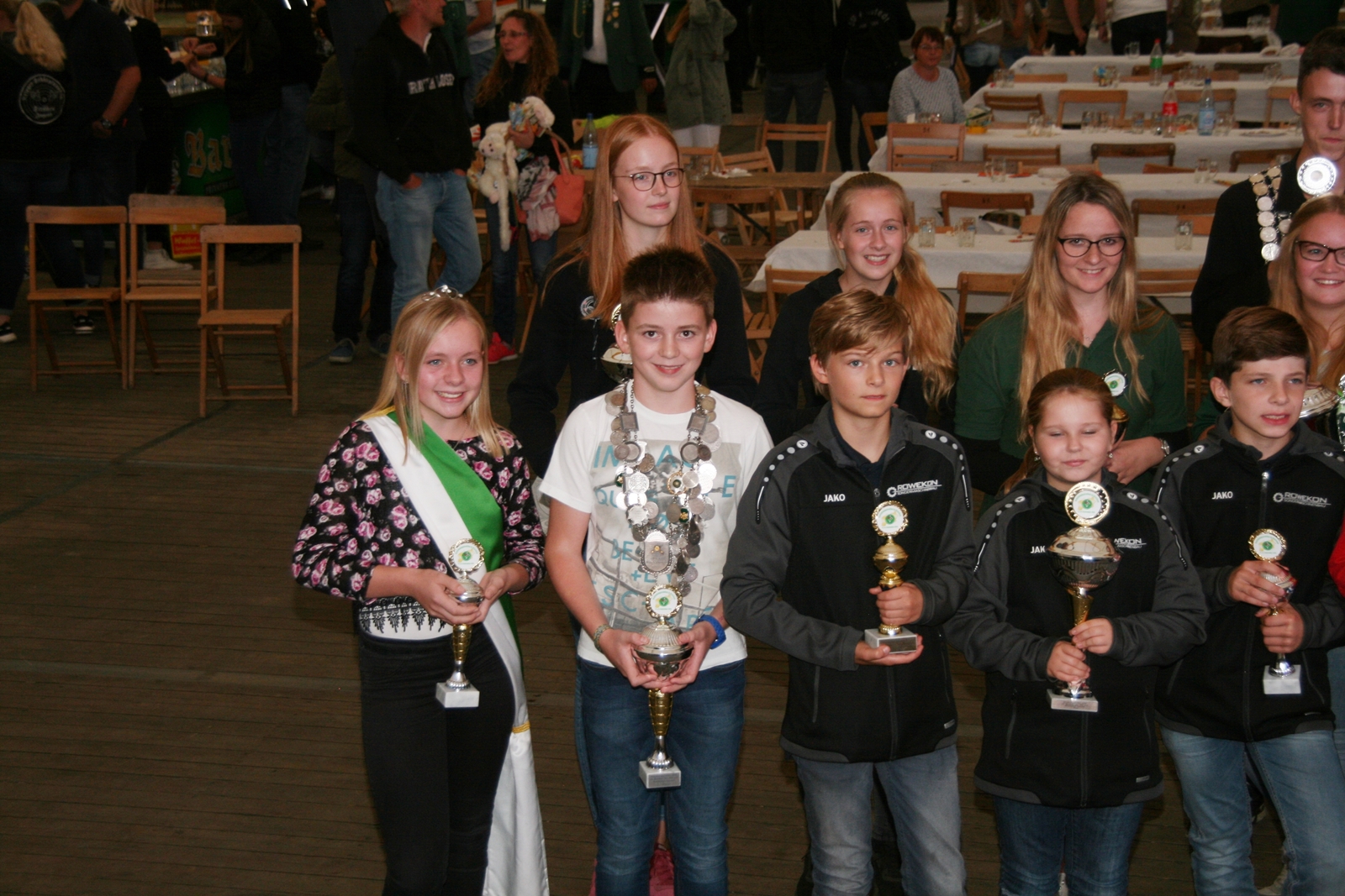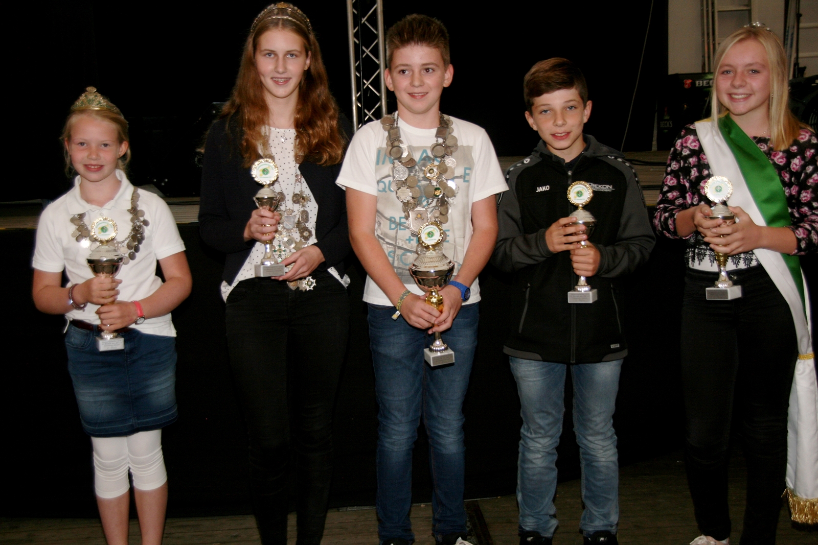 Kreiskinderkönig Jan-Malte Stein SV Brockum (in der Mitte), 2. Luisa-Marie Stamme SV Siedenburg, 3. Levin Cording KSV Ströhen, 4. Jenna Lynn Wolf SV Brockum, 5. Jule Benelling SV Barenburg.
