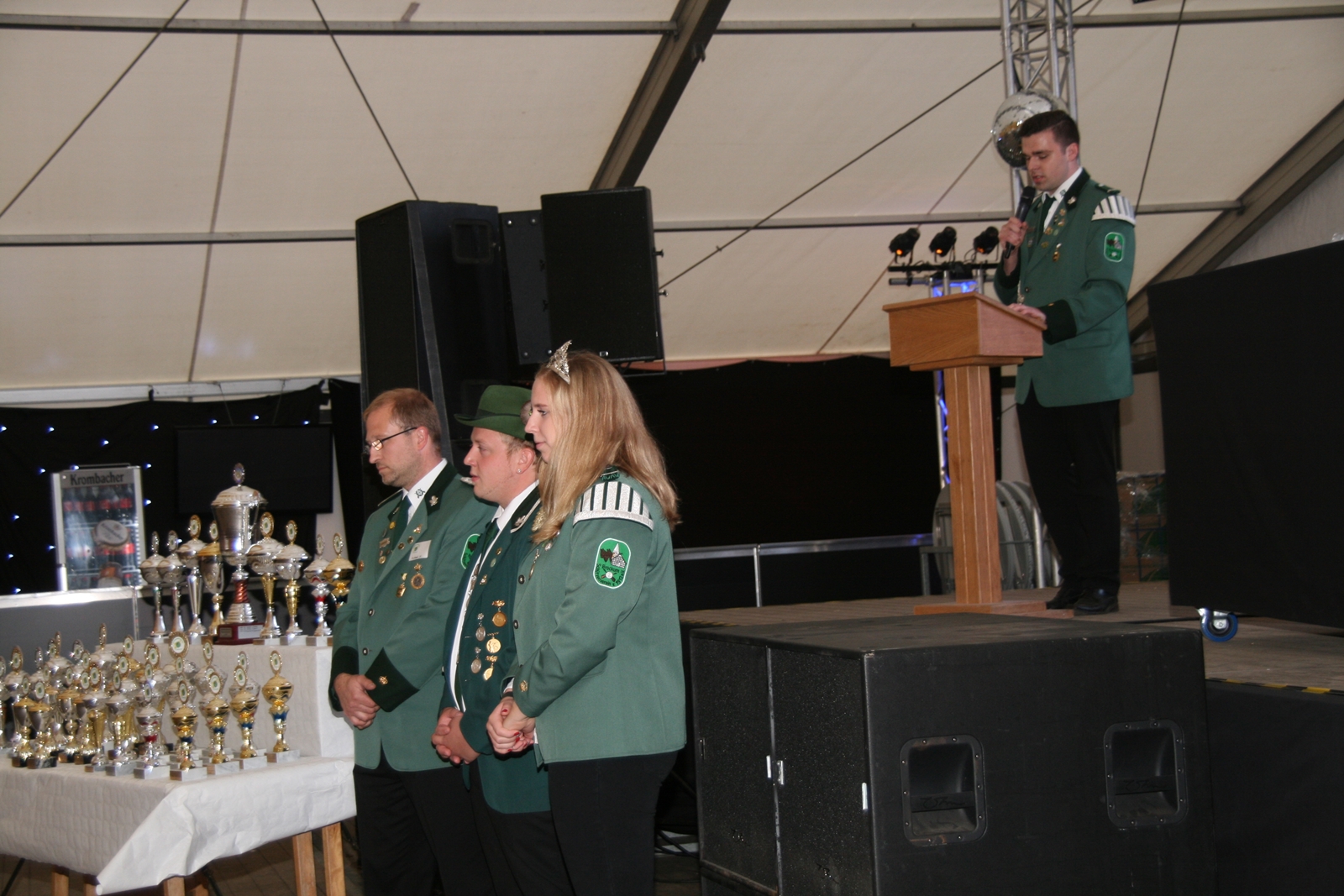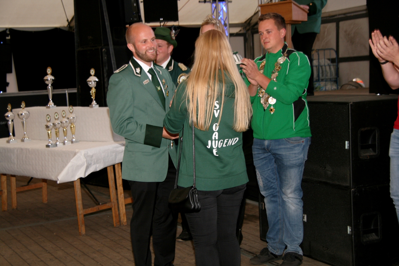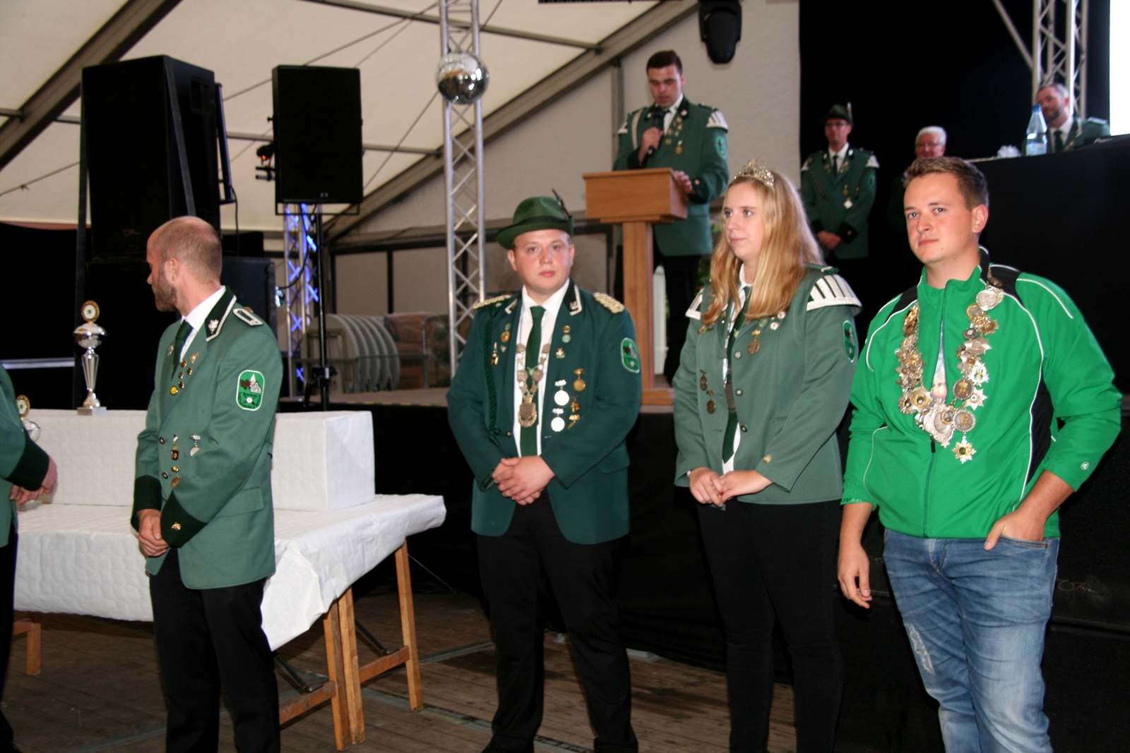 Friedel Kelkenberg, Bezirks-Vizepräsident gab in seinen Grußworten zum Ausdruck, dass er keine Sorge um die Zukunft des Schützenwesens habe, denn die Jugend sei super aufgestellt. Er überreichte den beiden neuen Kreismajestäten Kim-Tia Meyer und Jan-Malte Stein die Ehrengaben des Bezirks-Schützenverbandes Diepholz.