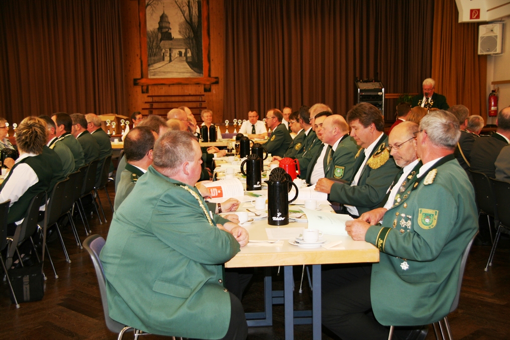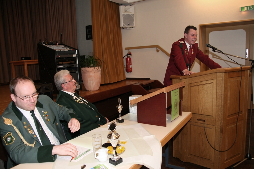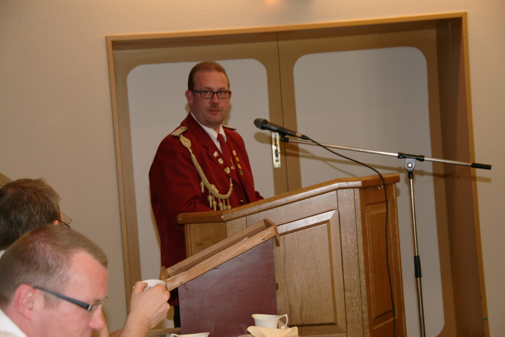 Thomas Nowak überbrachte die Grußworte des Bezirksschützenverbandes Grafschaft Diepholz. Er dankte auf diesem Wege allen für die Unterstützung beim NWDSB-Landesschützentag am 11. April in Rehden. Sei es bei der Feierstunde mit den Fahnen, dem Landesdelegiertentag, oder am Abend beim Feiern des Landeskönigsballes mit gut 720 Gästen bis in die frühen Morgenstunden. Der Versammlung wünschte er gute Beschlüsse die wegweisend sind für unsere Vereine, dass wir auch in 10 Jahren noch aktive Schützenvereine haben, wo Traditions- und Sportschützen gemeinsam Feiern und Wettkämpfe bestreiten.