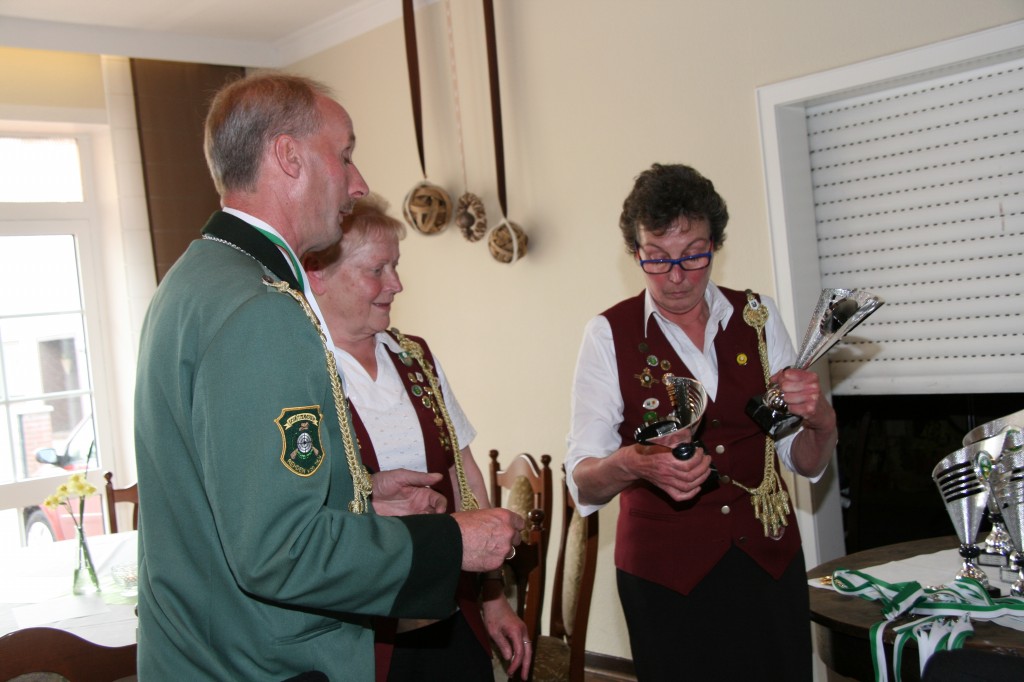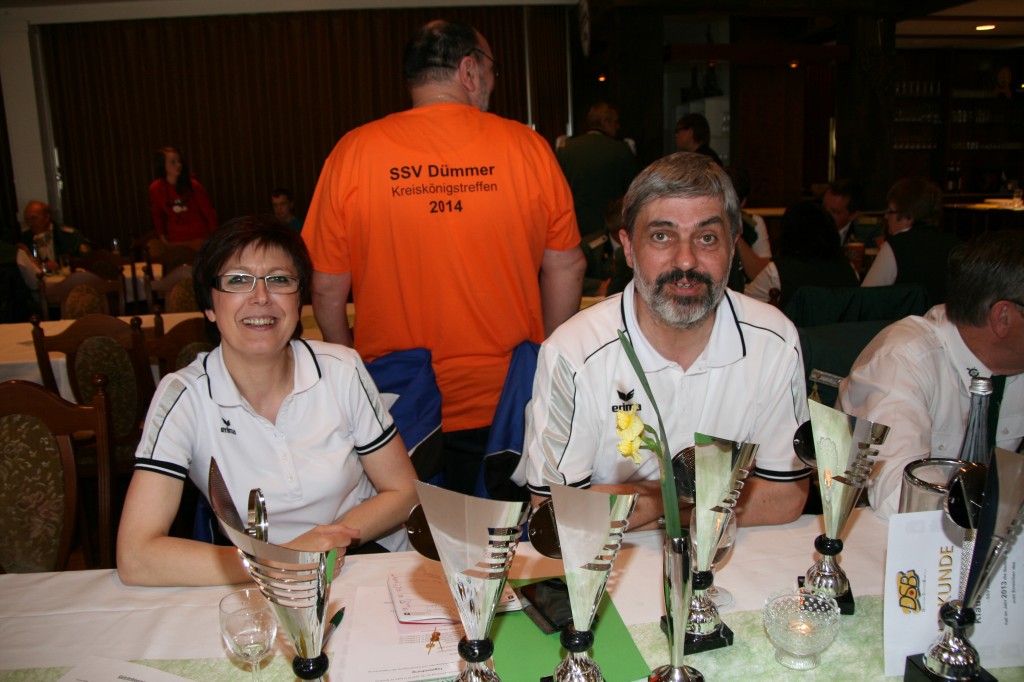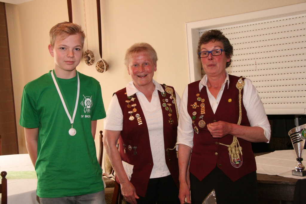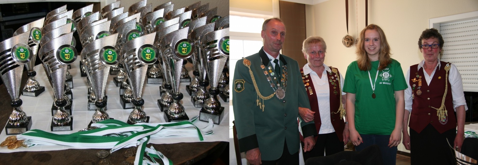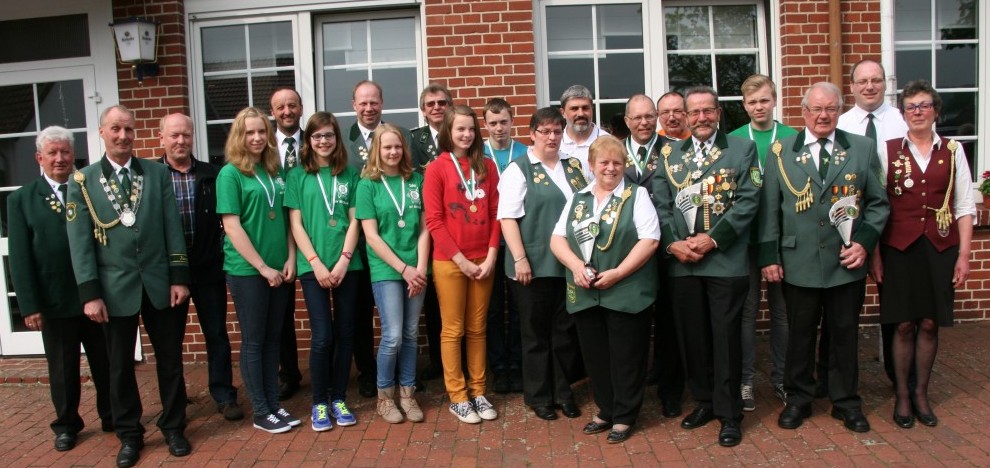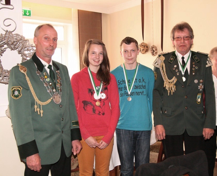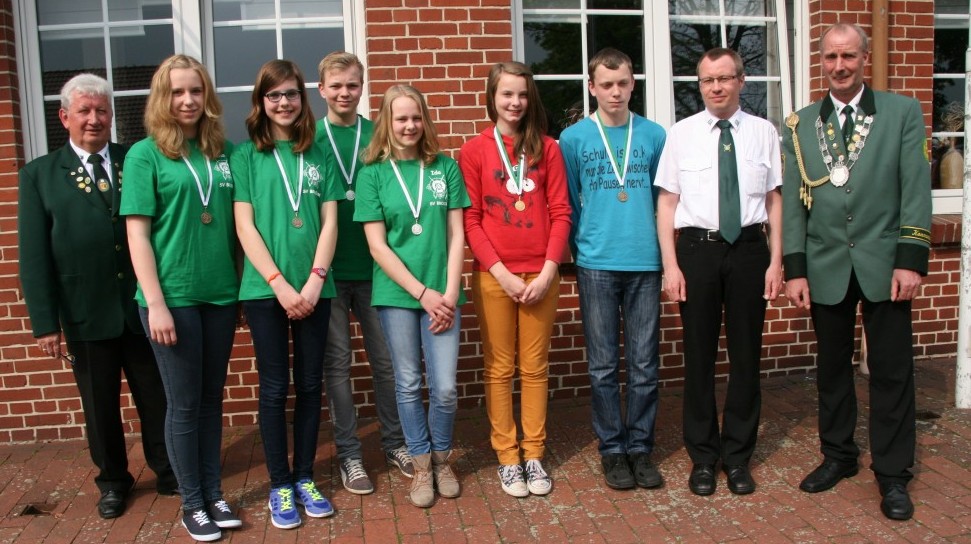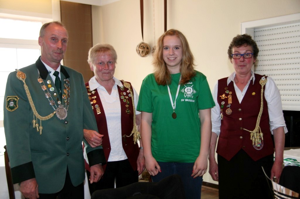 Die Siegerehrung der Kreismeister 2014 wurde vom Sportleiterteam Andreas Pohl, Klaus Bollhorst, Karin Unruh und Ulla Müske vorgenommen. Andreas Pohl äußerte anschließend den Wunsch, doch im nächsten Jahr mehr Kreismeister aus den Vereinen zu mobilisieren, ihre Meisterschaftsehrung persönlich in Empfang zu nehmen. Für die jugendlichen Sportschützen gab es dann für erste bis dritte Plätze bei der Landesverbandsmeisterschaft und Deutschen Meisterschaft, sowie für weitere Platzierungen und Teilnahmen an den Lichtpunktmeisterschaften des NWSDB „Flachgeschenke“. Auf dem Foto steht zwischen Ulla Müske und Karin Unruh unsere stellvertretende BZ-Jugendsprecherin Lena Reuter.