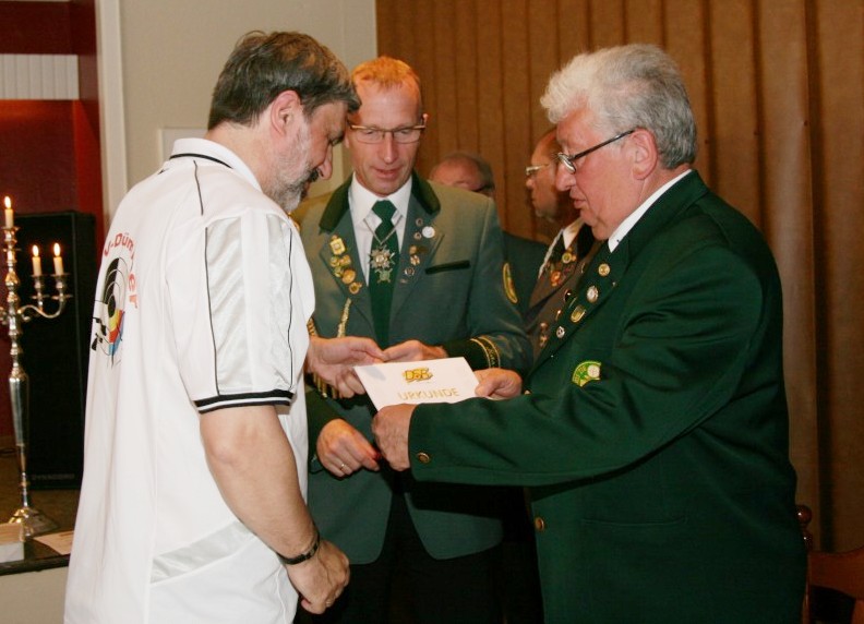 Besondere Ehrungen von verdienten Schützen, welche beim Bezirksdelegiertentag nicht anwesend waren, wurden nachträglich von Friedel Kelkenberg und Detlef Imsande geehrt. Dieses waren Karl-Heinz Ziegler SV Wetschen, Uwe Luzniack SSV Dümmer und Heiner Dringenberg SV Ossenbeck.(links KV-Präsident Manfred Rüffer)