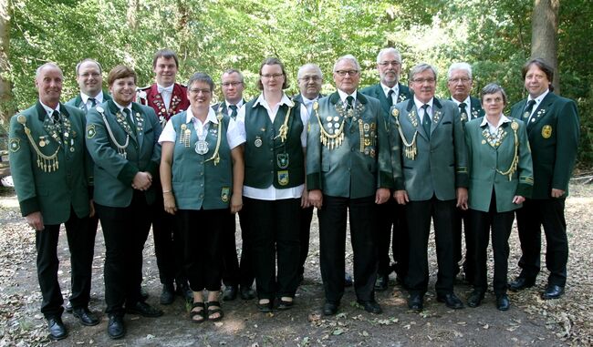 Nach der Proklamation ein Gesamtfoto mit KV I-Jubiläumskönigin Ulrike Büscher u. Präsident Manfred Rüffer (2. von links)