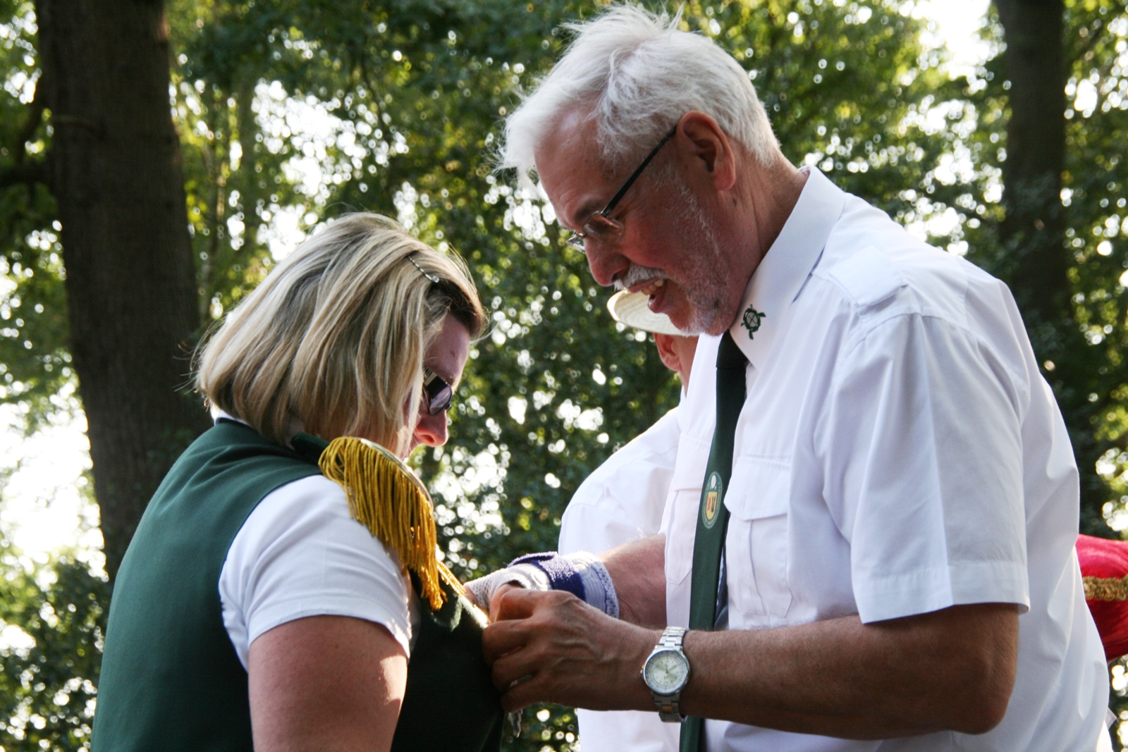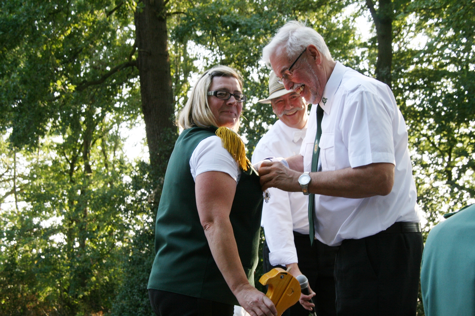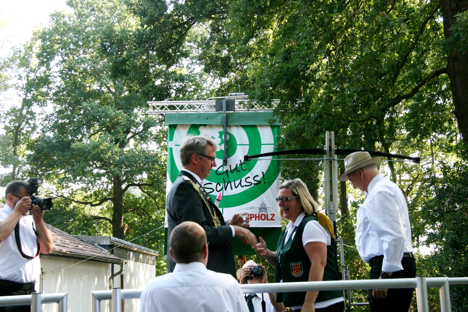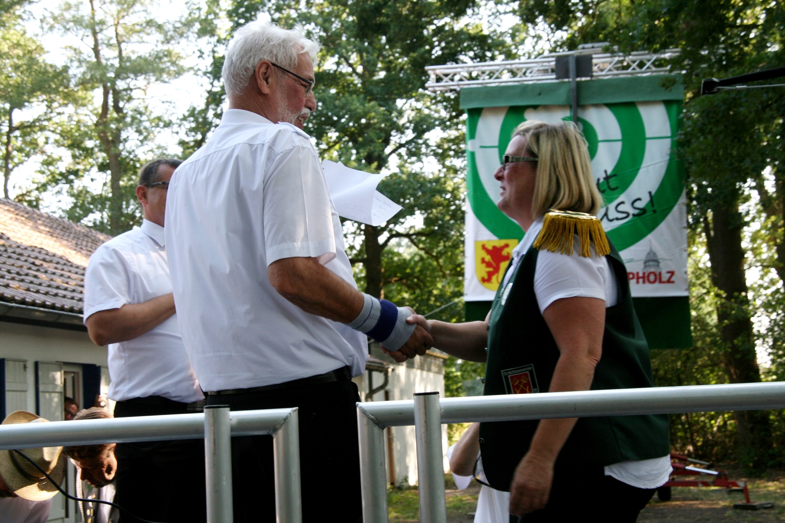 Kurz darauf war es geschehen: Königin Ulrike Büscher vom SV Stemshorn hatte den "Rest“ (Rumpf) weggeputzt! Sie ist nun die Jubiläumsmajestät des KV I, sie erhielt von Präsident Manfred Rüffer den „gefallenen“ Rumpf und dazu den Jubiläumsorden.