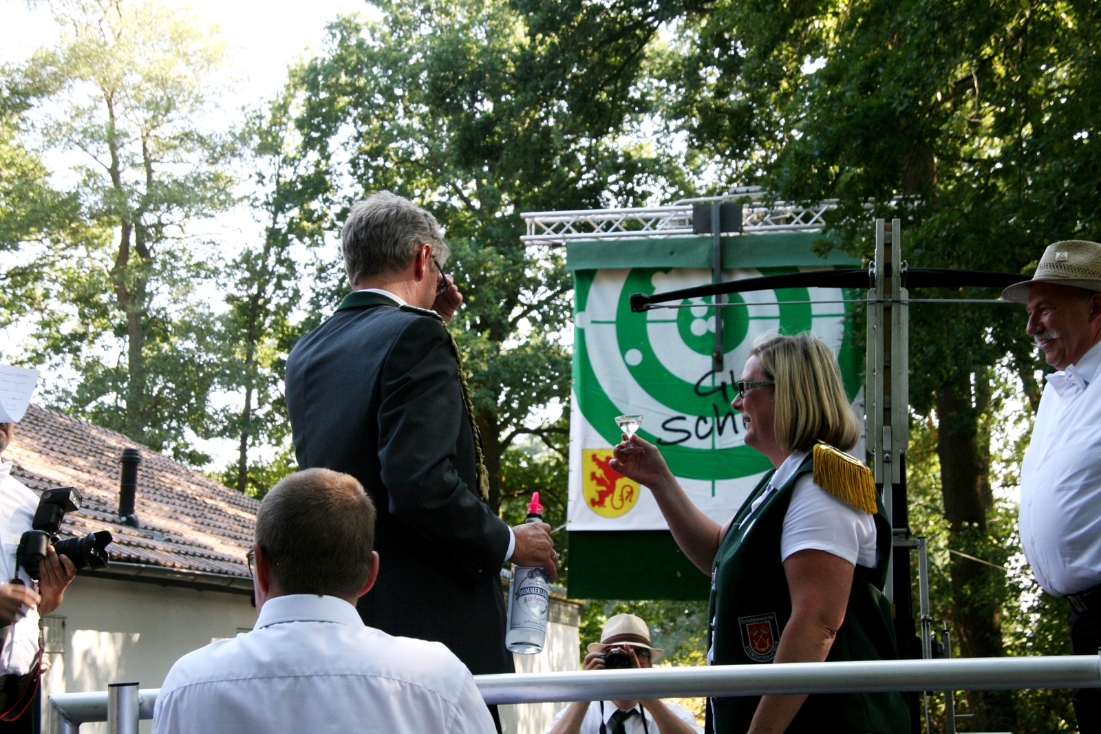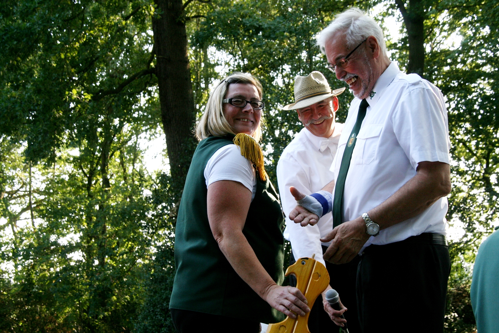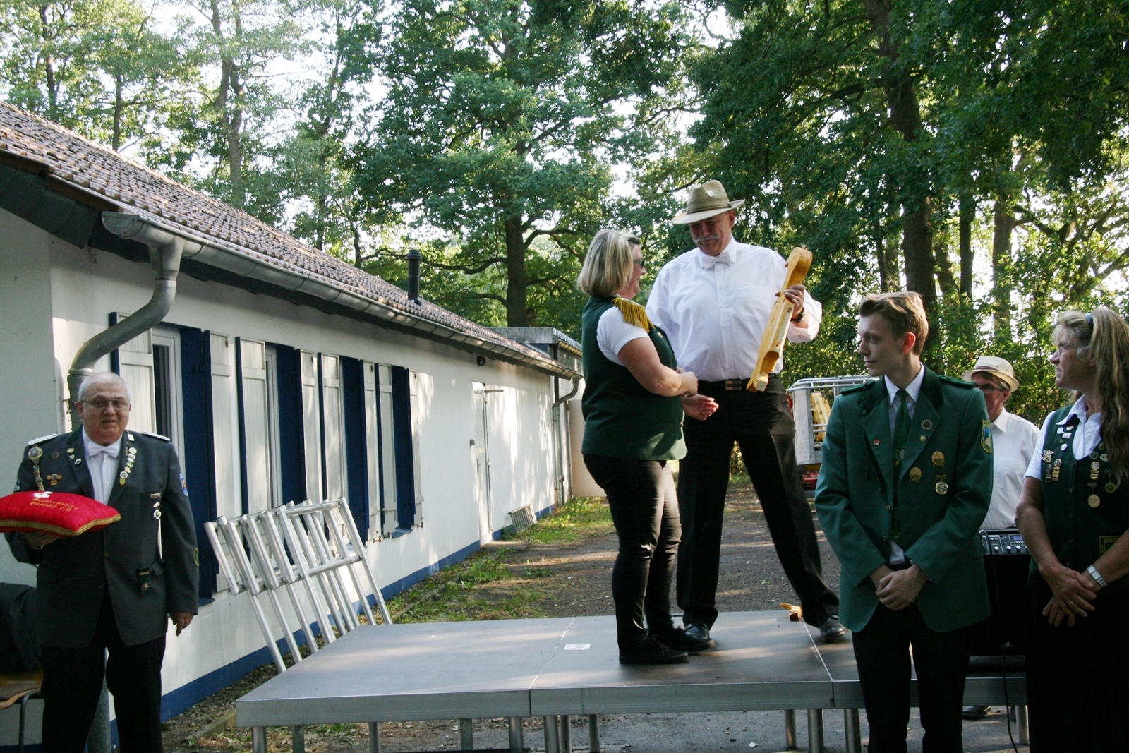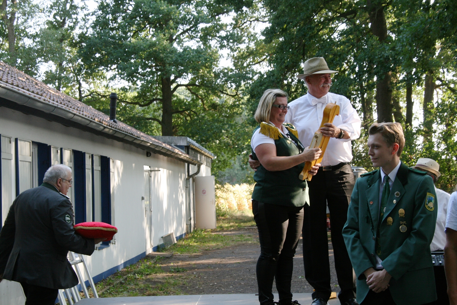 Kurz darauf war es geschehen: Königin Ulrike Büscher vom SV Stemshorn hatte den "Rest“ (Rumpf) weggeputzt! Sie ist nun die Jubiläumsmajestät des KV I, sie erhielt von Präsident Manfred Rüffer den „gefallenen“ Rumpf und dazu den Jubiläumsorden.