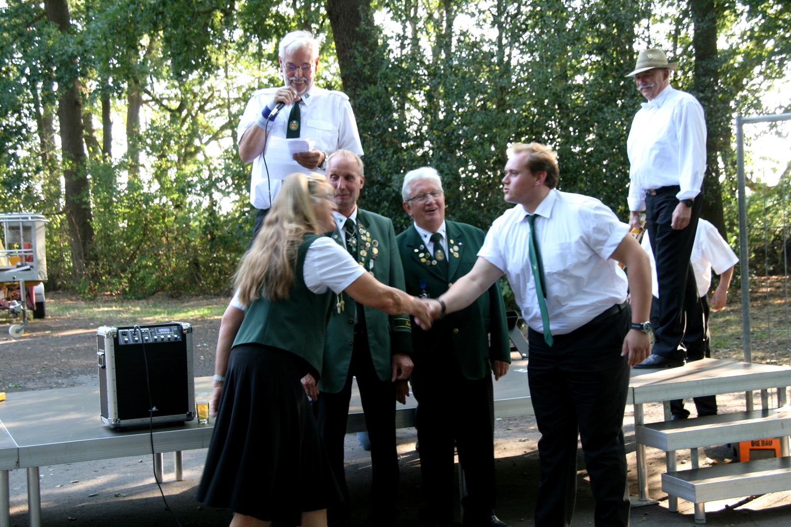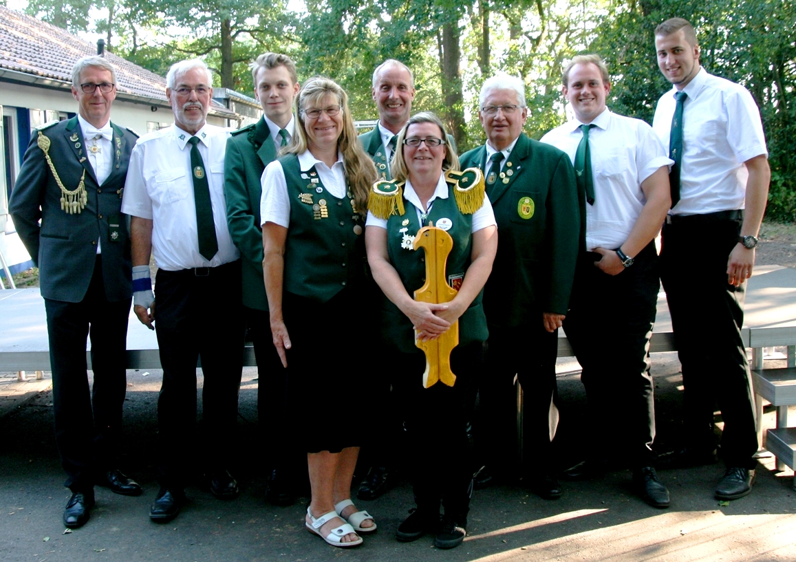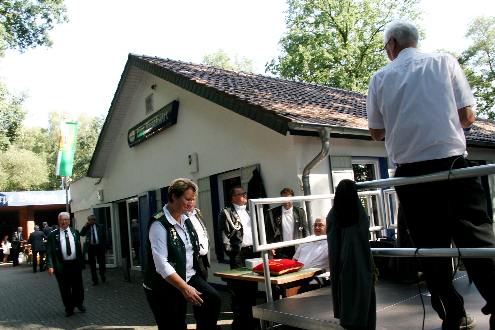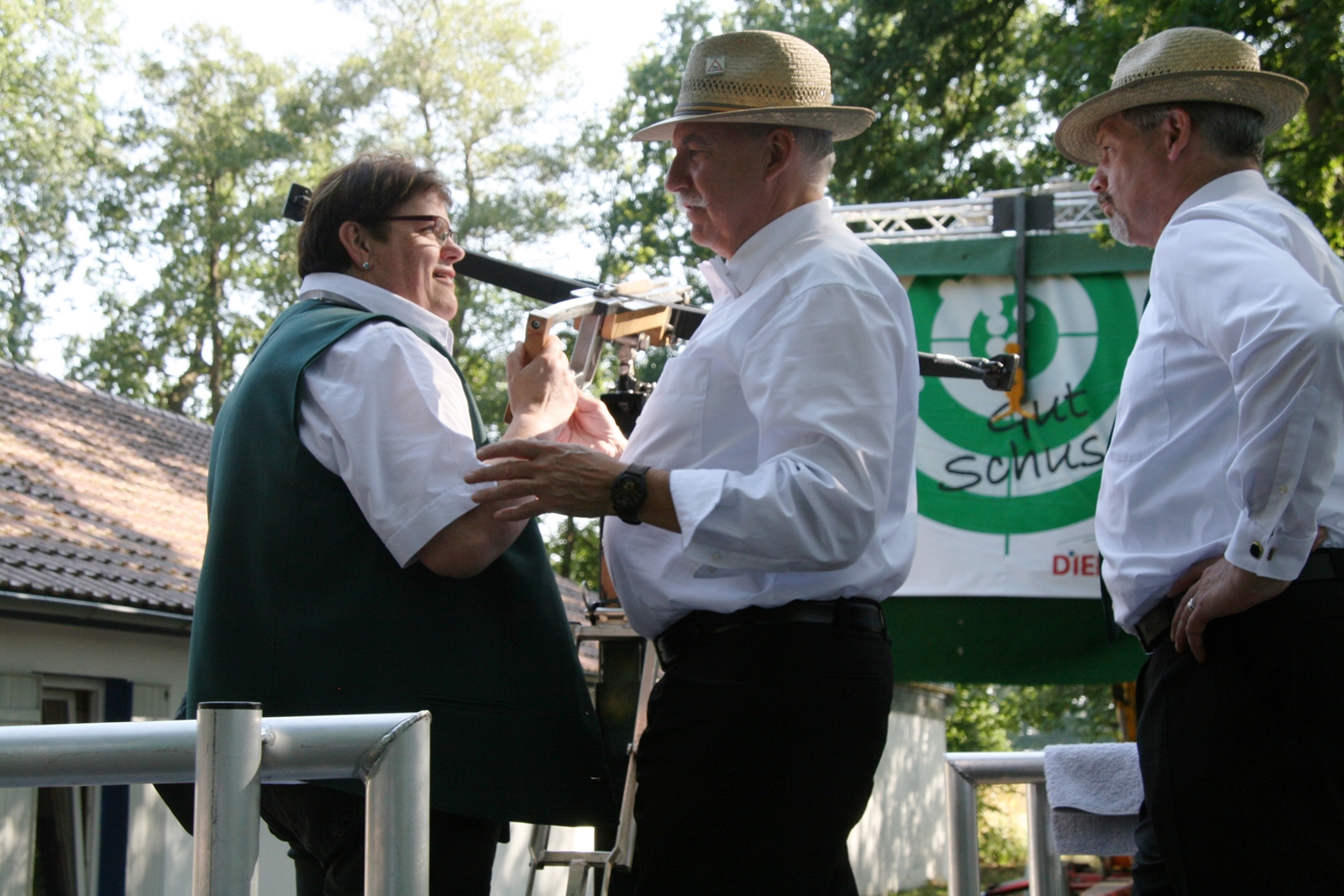 Kurz darauf war es geschehen: Königin Ulrike Büscher vom SV Stemshorn hatte den "Rest“ (Rumpf) weggeputzt! Sie ist nun die Jubiläumsmajestät des KV I, sie erhielt von Präsident Manfred Rüffer den „gefallenen“ Rumpf und dazu den Jubiläumsorden.