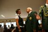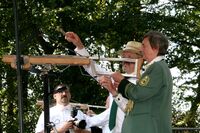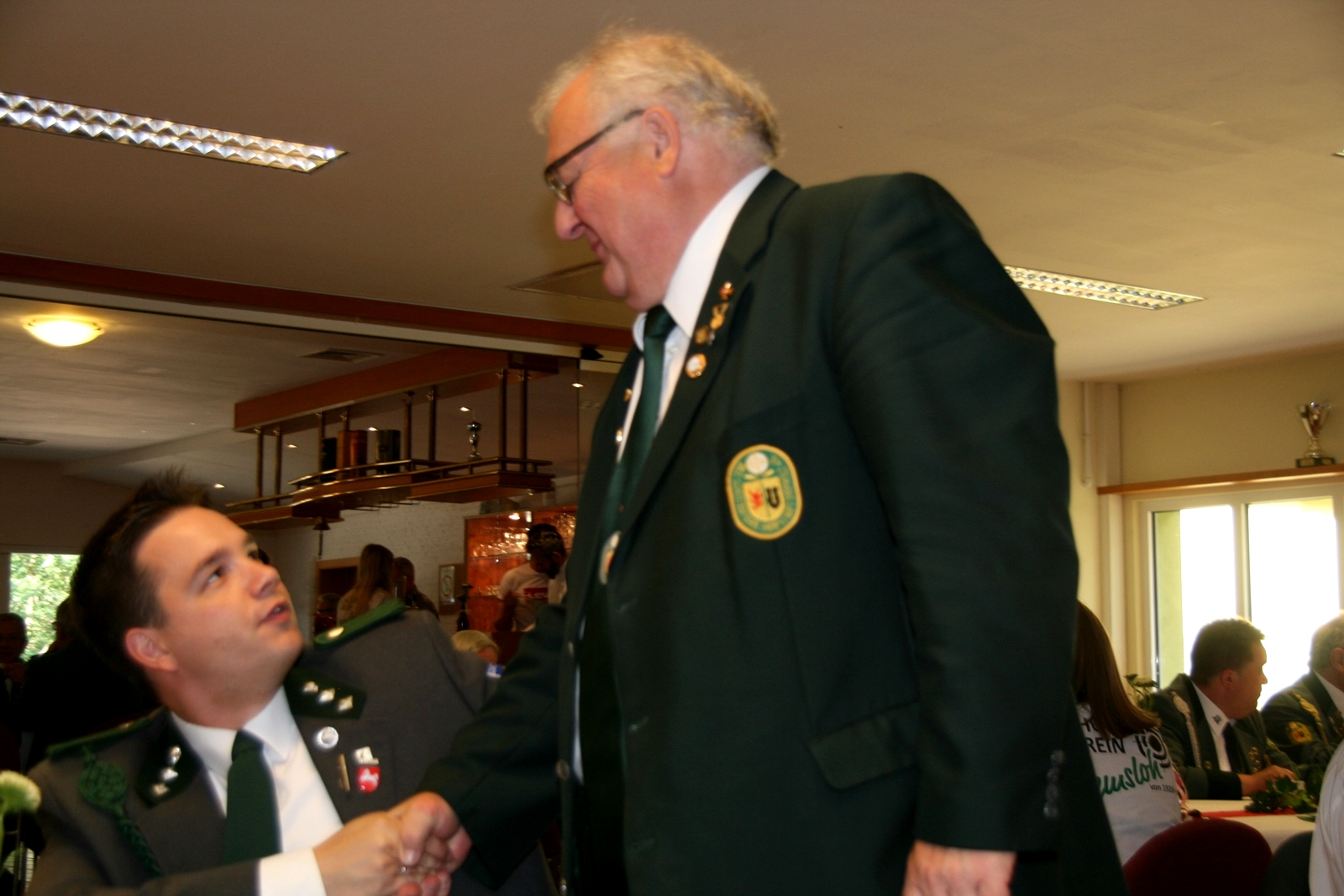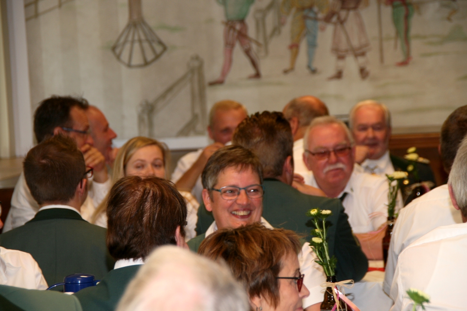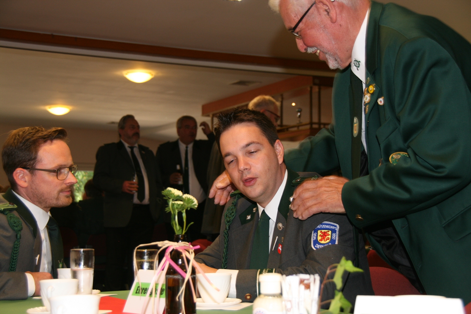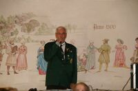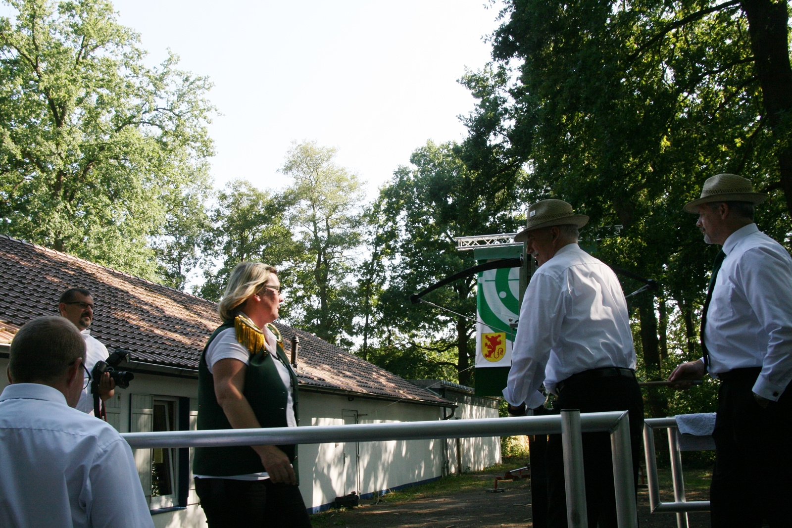 Kurz darauf war es geschehen: Königin Ulrike Büscher vom SV Stemshorn hatte den "Rest“ (Rumpf) weggeputzt! Sie ist nun die Jubiläumsmajestät des KV I, sie erhielt von Präsident Manfred Rüffer den „gefallenen“ Rumpf und dazu den Jubiläumsorden.