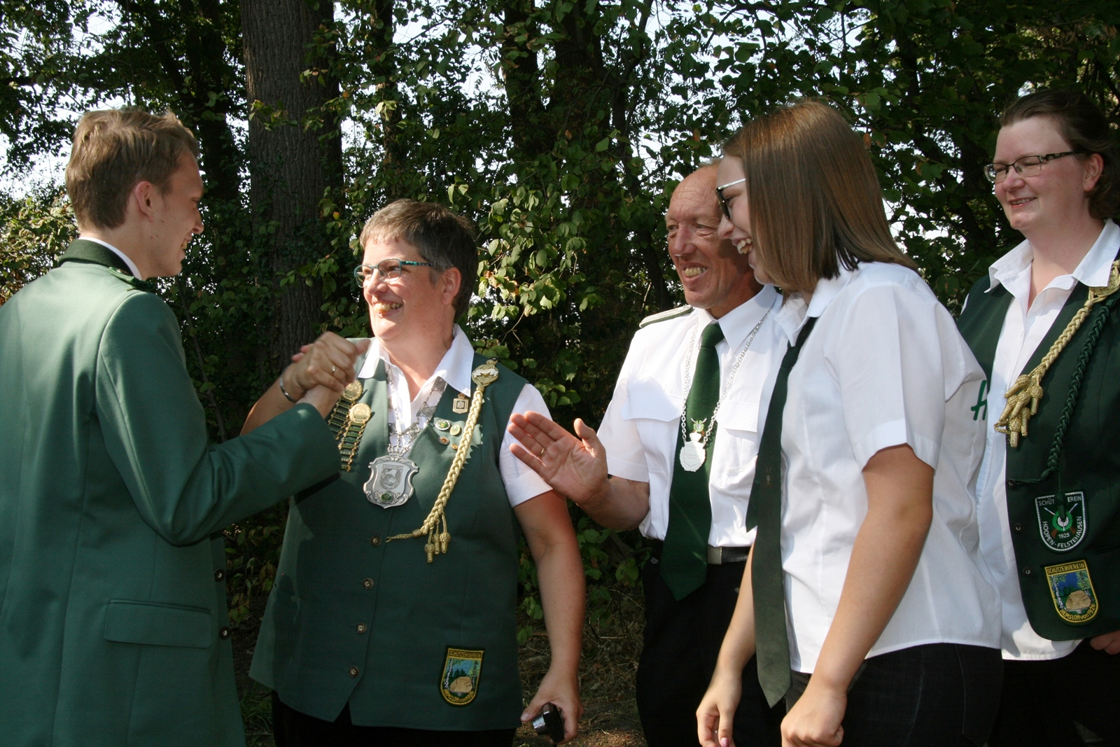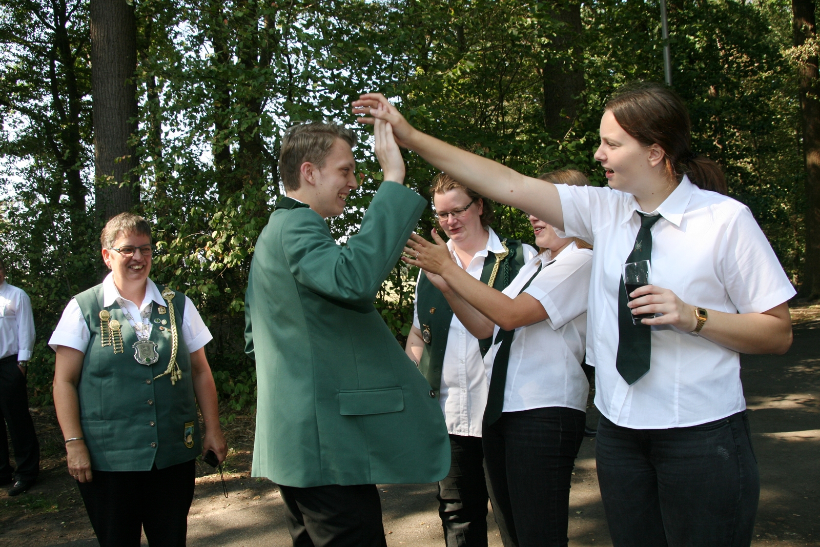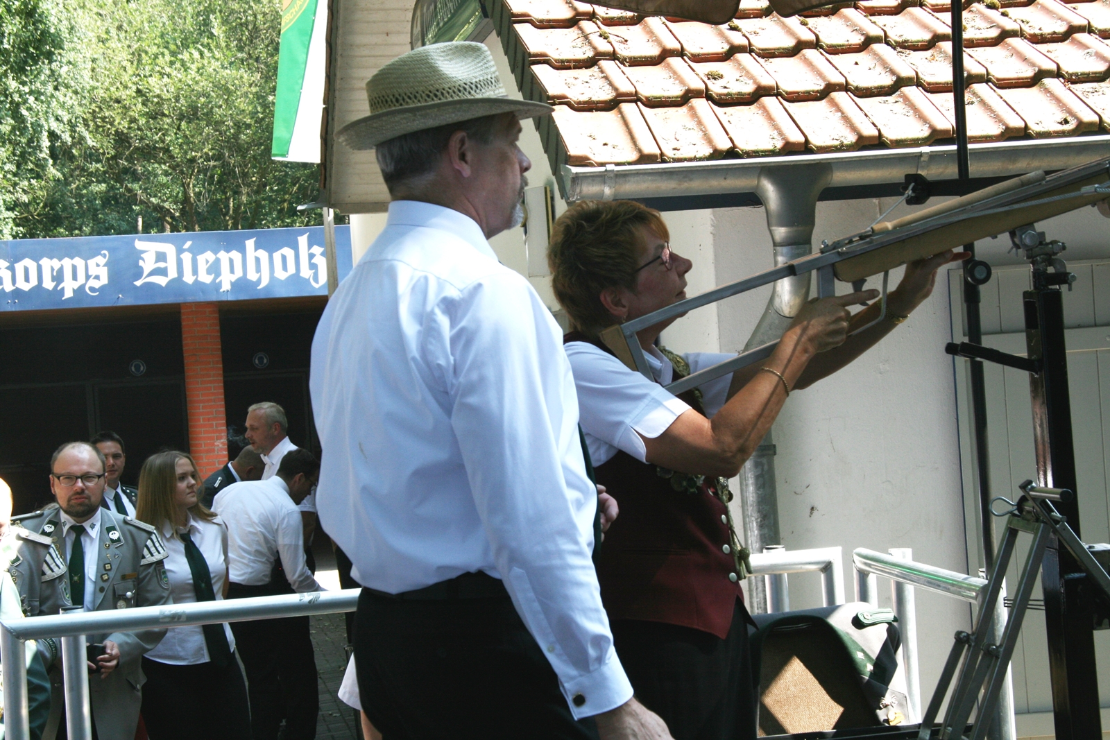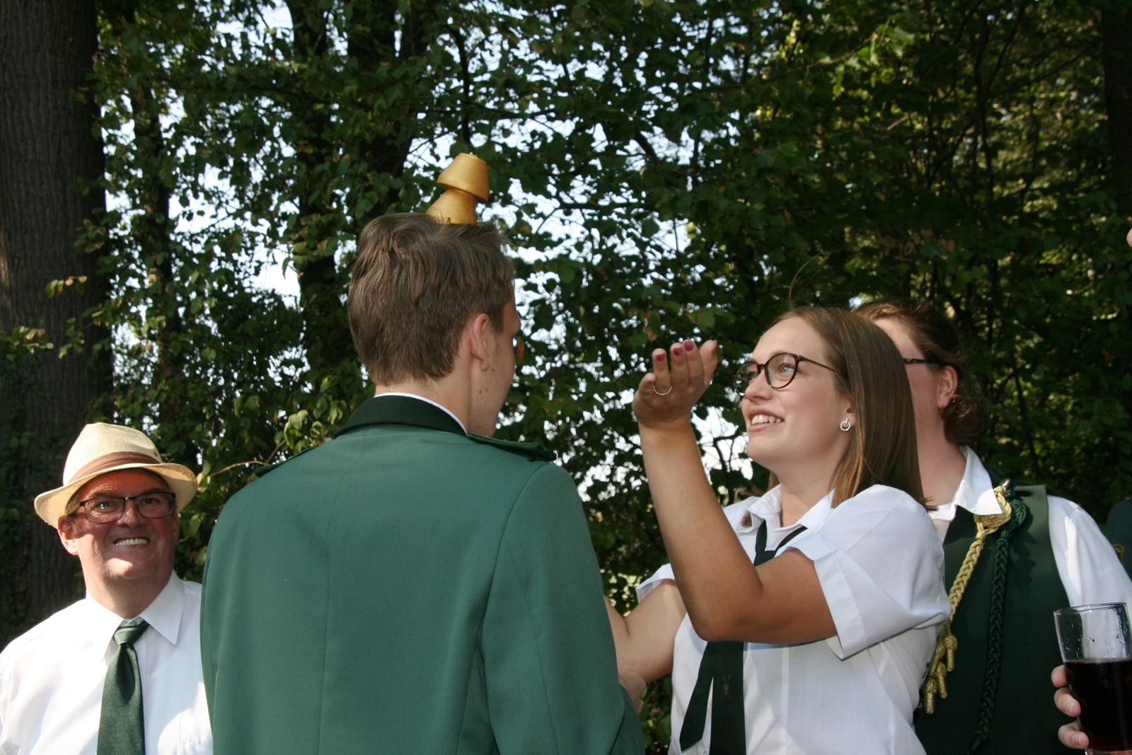 Nach der Kaffeetafel begann das "Adlerschießen". Mit viel Spaß auch bei den Zuschauern und auch "etwas" Ergeiz bei den jeweiligen Schützen, denn erst mal war das "Fussvolk" dabei - ging es ja vorweg für sie um "Zepter" (Friedel Kelkenberg), "Stoß" (Klaus Bollhorst), "Apfel" (Sven Mohrmann), "Flügel rechts (Iris Evers) und links" (Jonas Sudmann) und "Krone" (Tom Tatgenhorst).