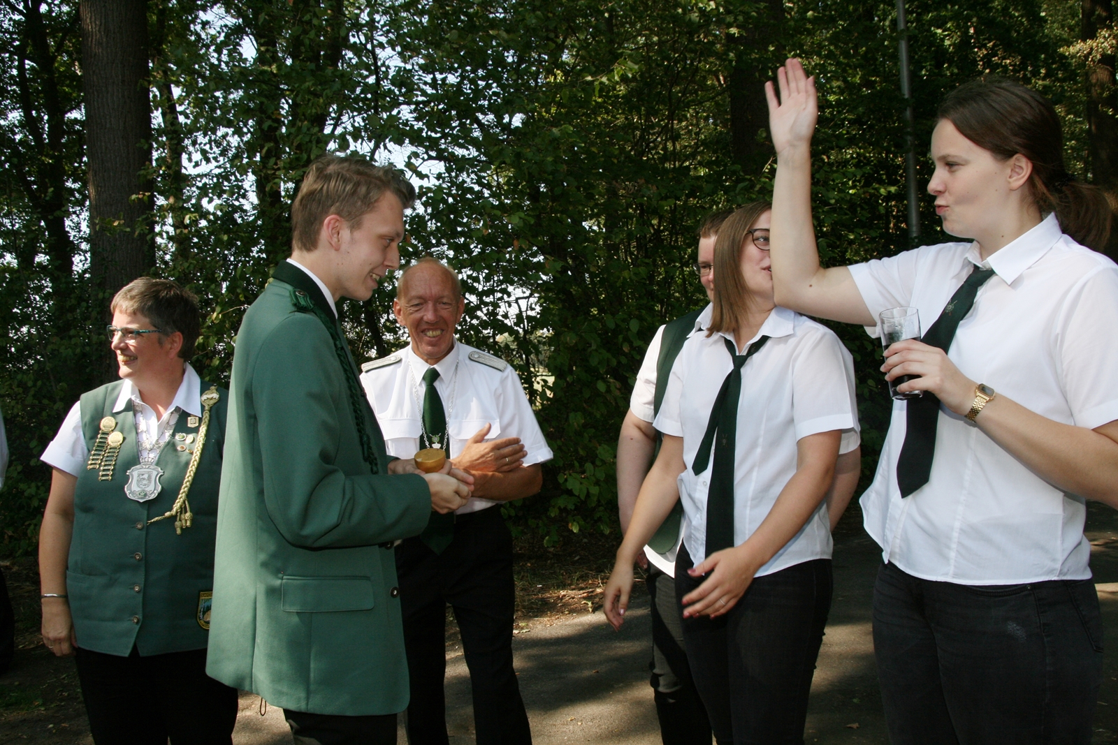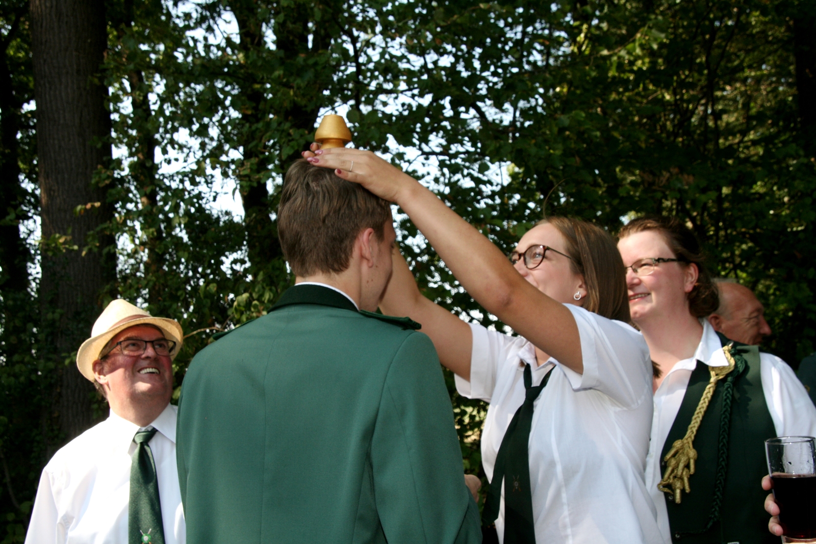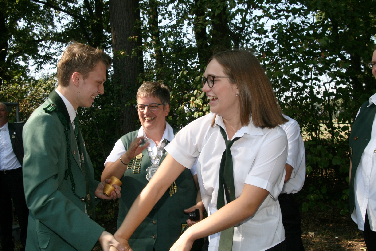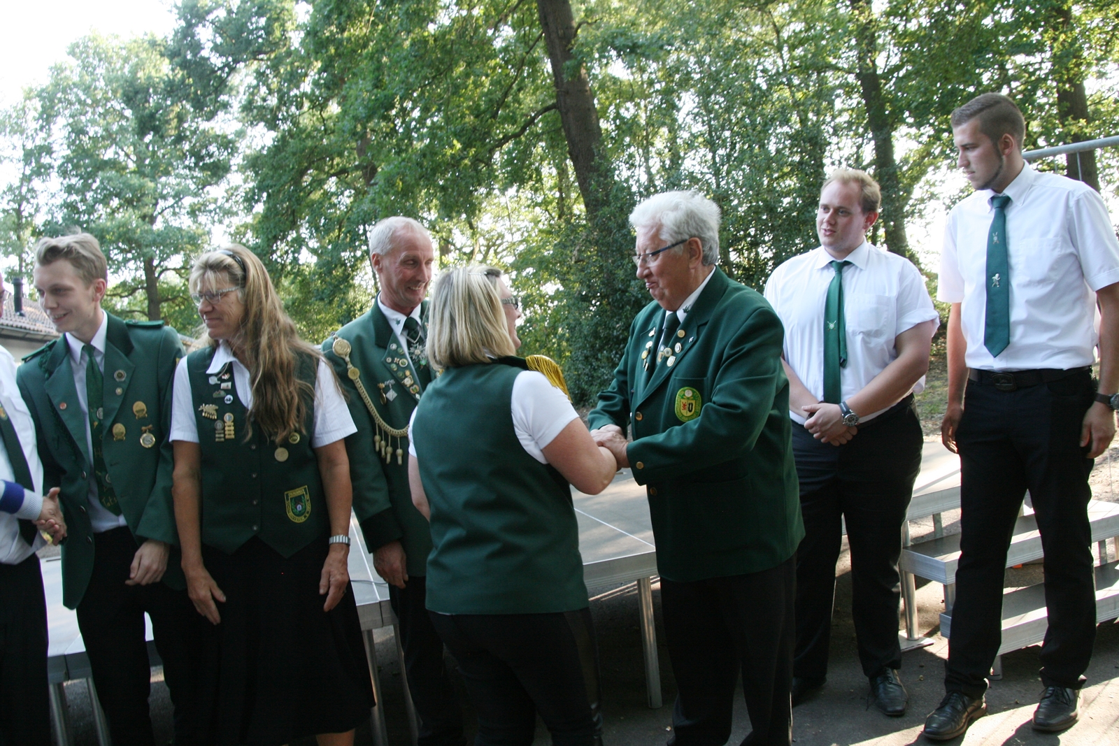 Nach der Kaffeetafel begann das "Adlerschießen". Mit viel Spaß auch bei den Zuschauern und auch "etwas" Ergeiz bei den jeweiligen Schützen, denn erst mal war das "Fussvolk" dabei - ging es ja vorweg für sie um "Zepter" (Friedel Kelkenberg), "Stoß" (Klaus Bollhorst), "Apfel" (Sven Mohrmann), "Flügel rechts (Iris Evers) und links" (Jonas Sudmann) und "Krone" (Tom Tatgenhorst).