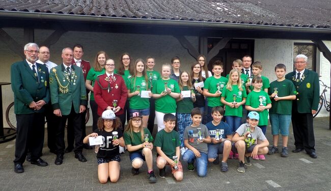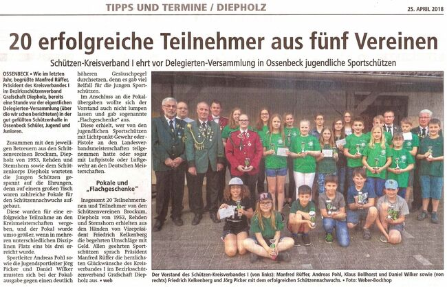 Bereits eine Stunde vor der eigentlichen Delegierten-Versammlung begrüßte Präsident Manfred Rüffer vom Kreisverband I des Bezirksschützenverbandes Grafschaft Diepholz in der gut gefüllten Schützenhalle in Ossenbeck Schüler, Jugend und Junioren. Zusammen mit den jeweiligen Betreuern aus den Schützenvereinen Brockum, Diepholz 53, Rehden und Stemshorn sowie dem Schützenkorps Diepholz warteten alle gespannt auf die Ehrungen, denn auf einem großen Tisch waren zahlreiche Pokale für den Schützennachwuchs aufgebaut. Diese wurden für eine erfolgreiche Teilnahme an den Kreismeisterschaften vergeben. Sportleiter Andreas Pohl sowie die Jugendsportleiter Jörg Picker und Daniel Wilker mussten sich bei der Pokalausgabe gegen einen deutlich höheren Geräuschpegel durchsetzen, denn es gab viel Beifall für die jungen Sportschützen und diese waren zu Recht stolz auf ihre Leistungen.