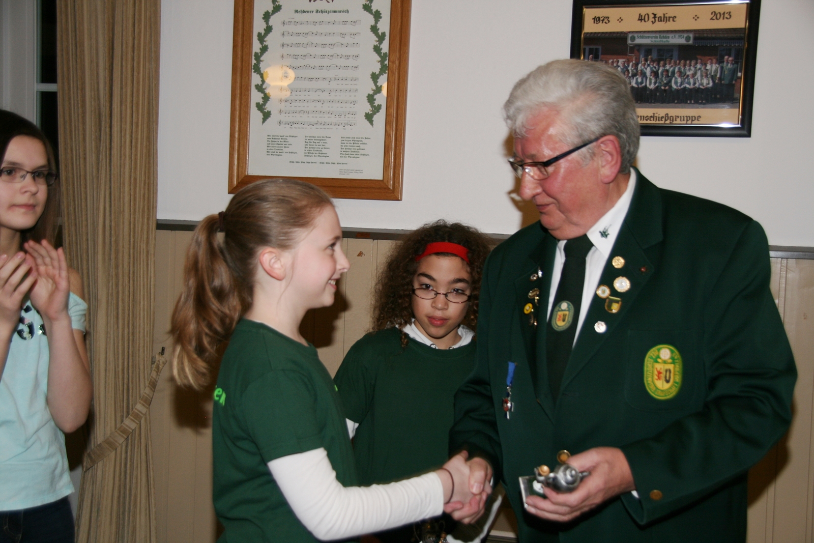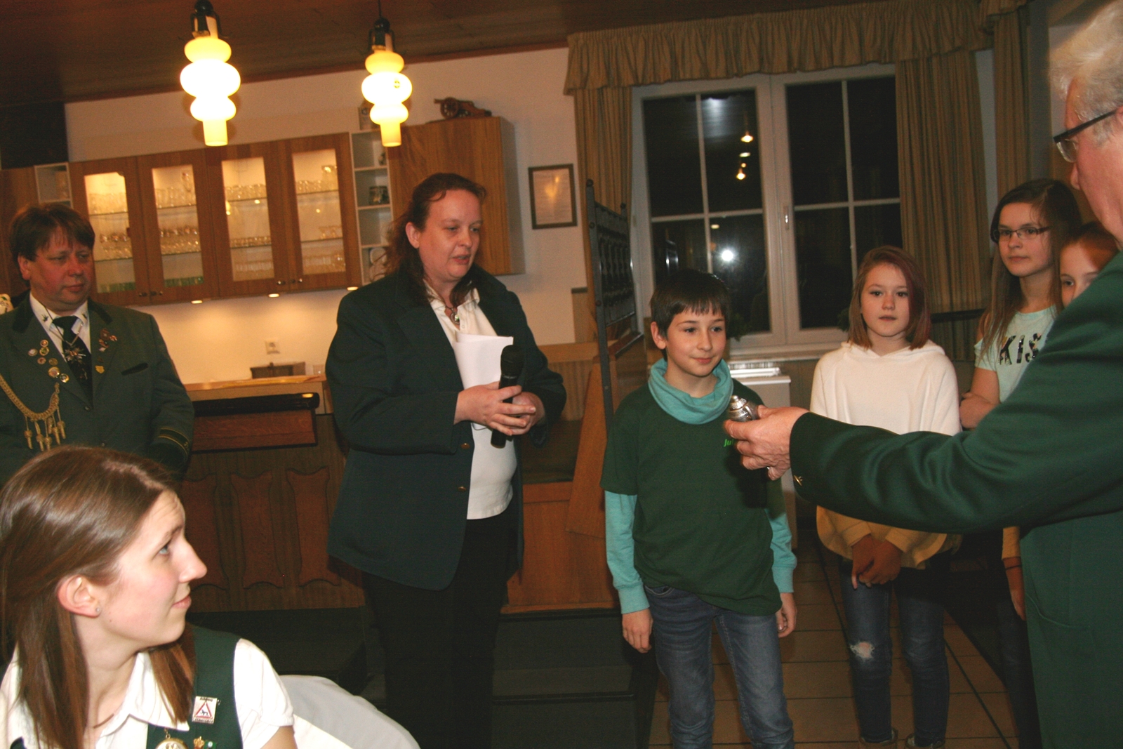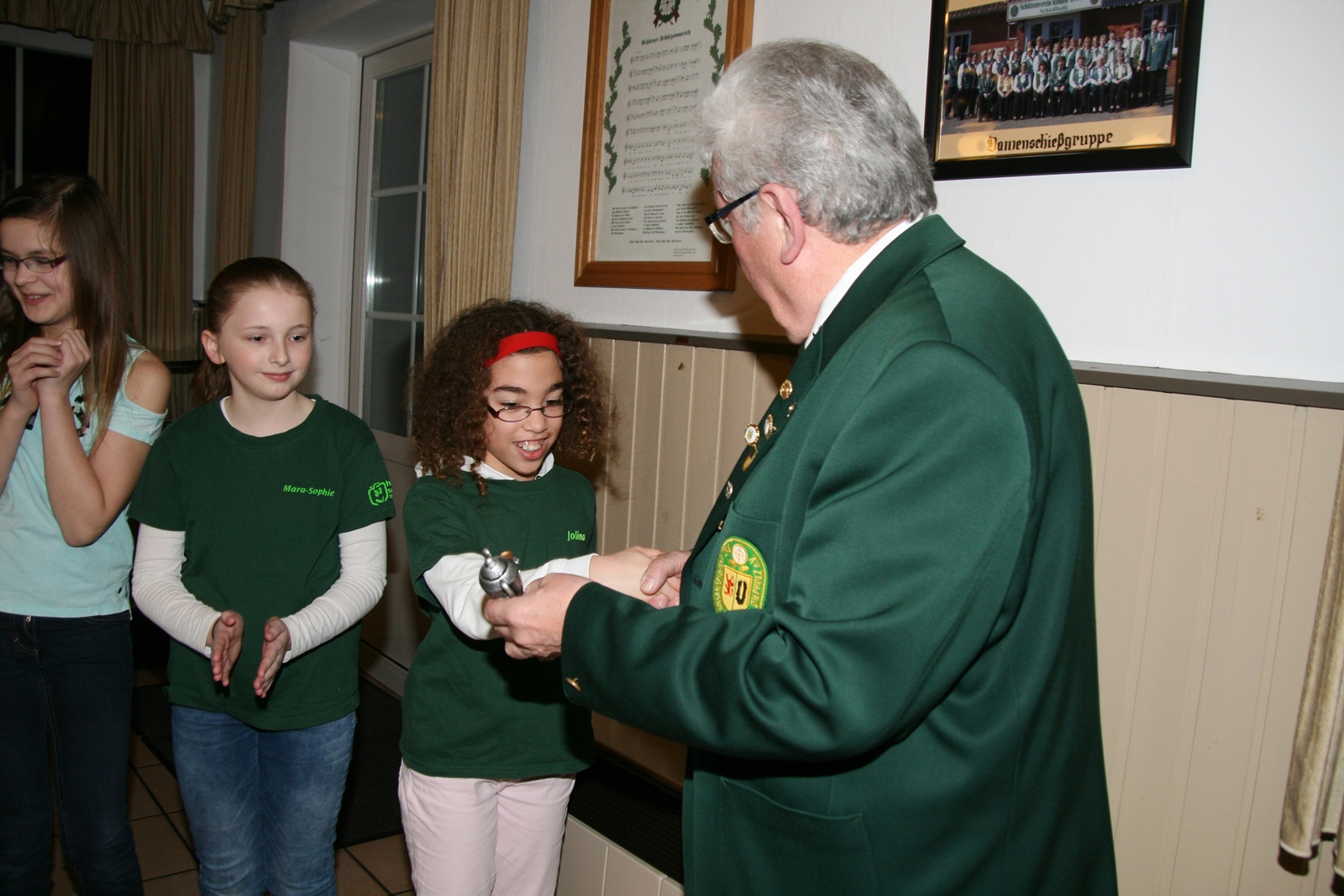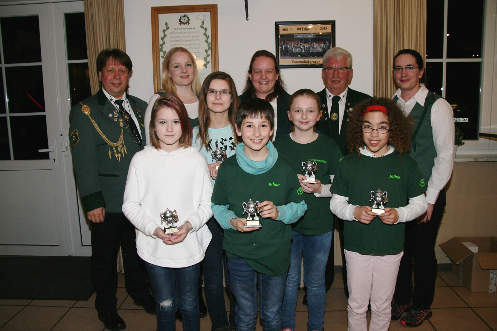 Britta Löhmann bat sodann die fünf jungen Sportschützen zu sich. Sie zählte unter viel Beifall die tollen Ergebnisse der Lichtpunktschützen auf, Friedel Kelkenberg waltete dabei seines „Amtes“ und überreichte ihnen die Erinnerungspokale mit guten Wünschen für die Zukunft und stets ein „Gut Schuß“!