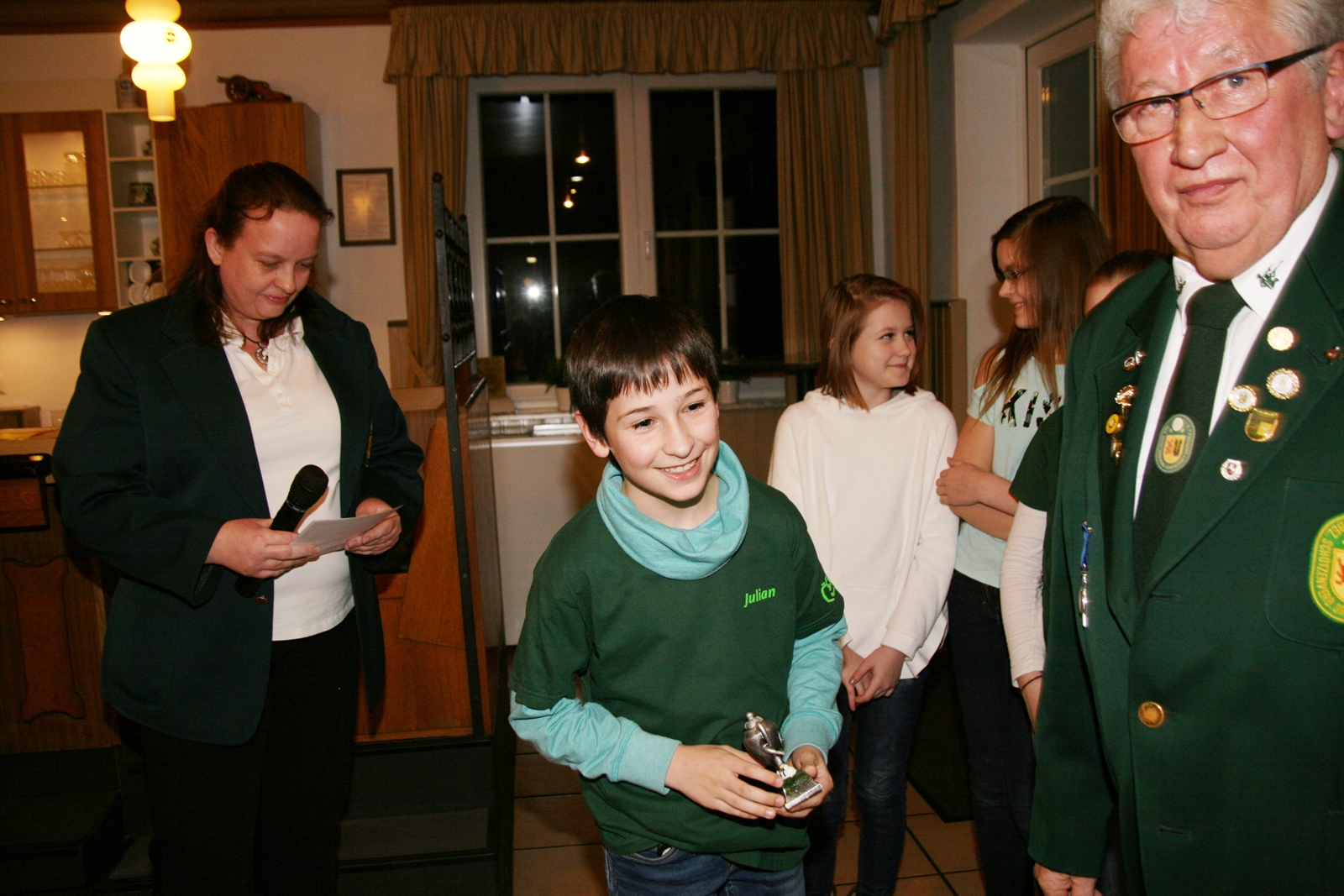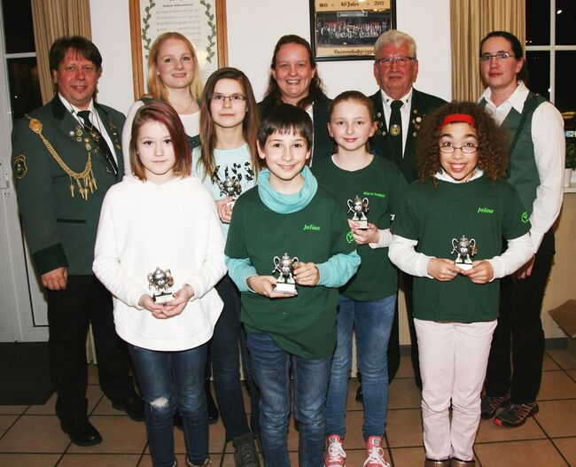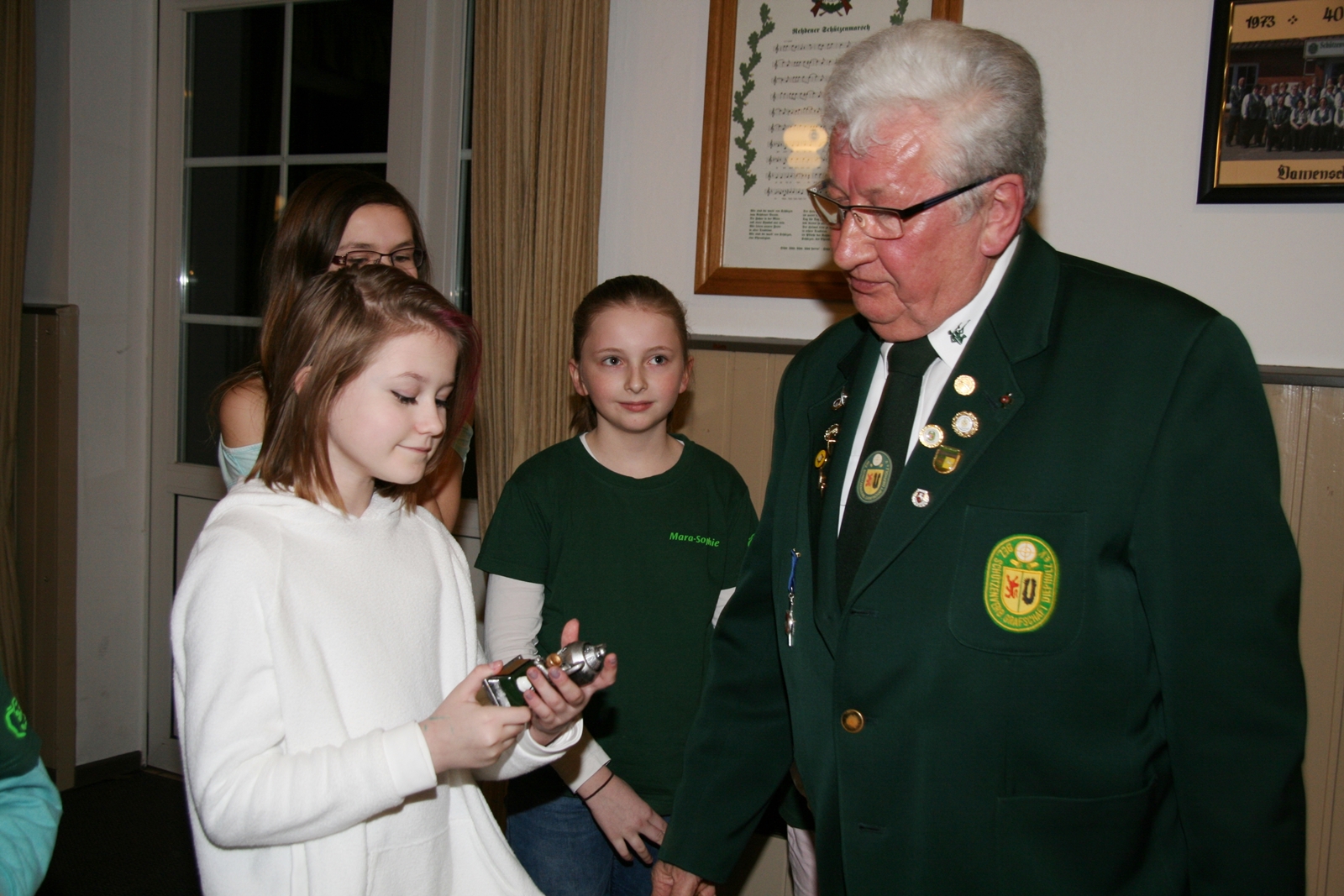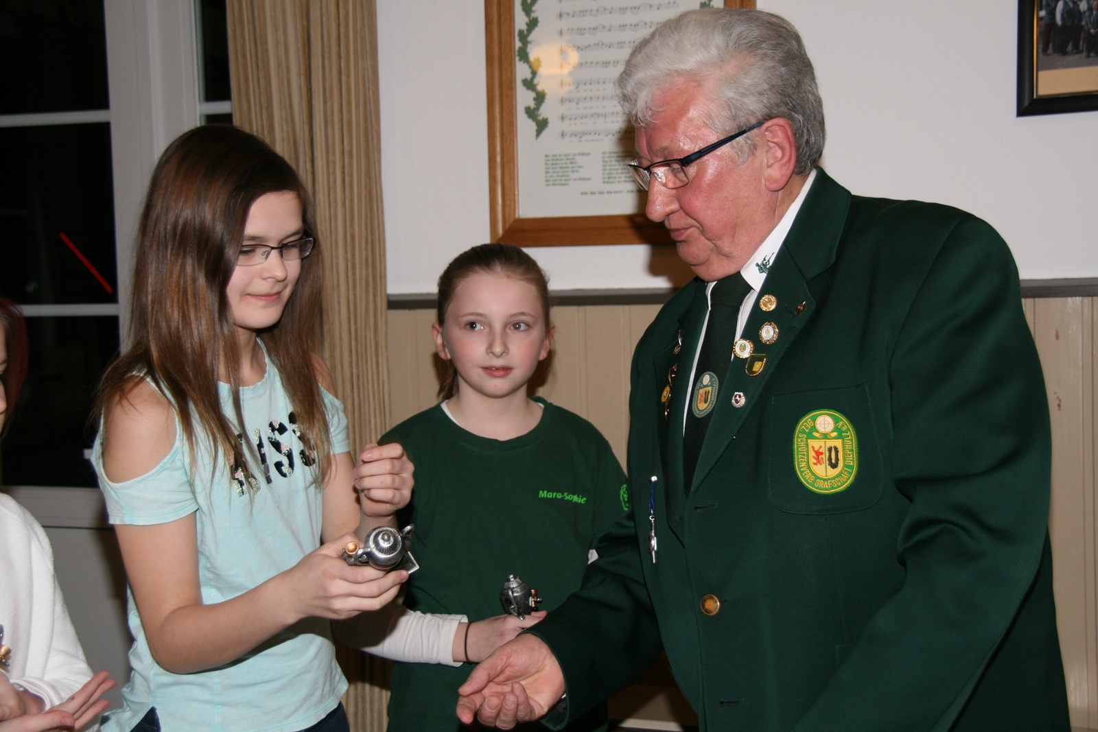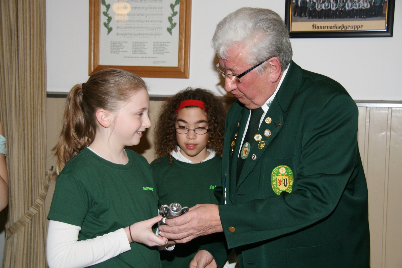 Britta Löhmann bat sodann die fünf jungen Sportschützen zu sich. Sie zählte unter viel Beifall die tollen Ergebnisse der Lichtpunktschützen auf, Friedel Kelkenberg waltete dabei seines „Amtes“ und überreichte ihnen die Erinnerungspokale mit guten Wünschen für die Zukunft und stets ein „Gut Schuß“!