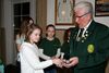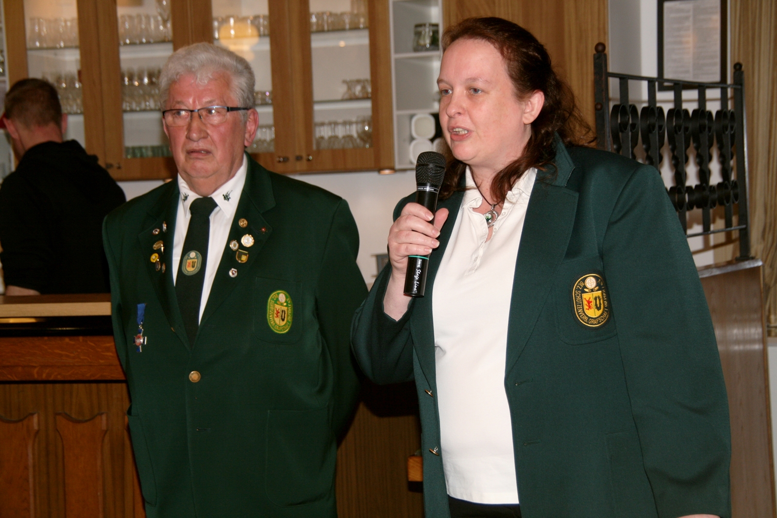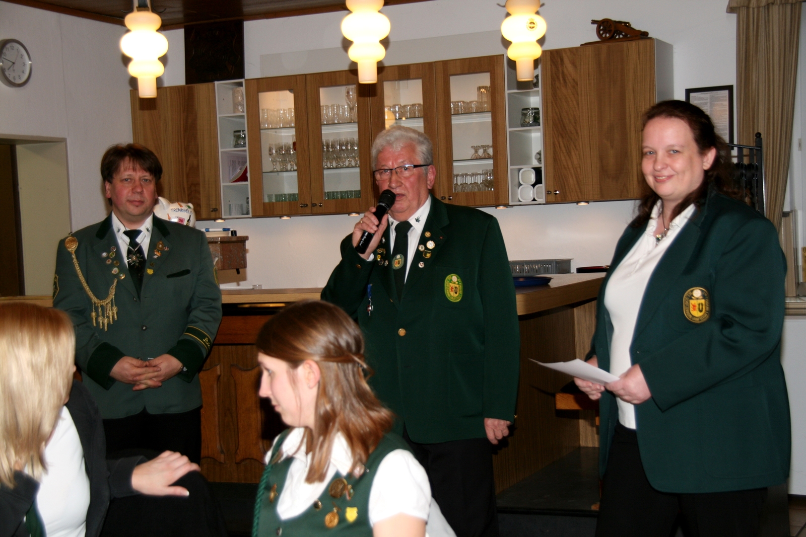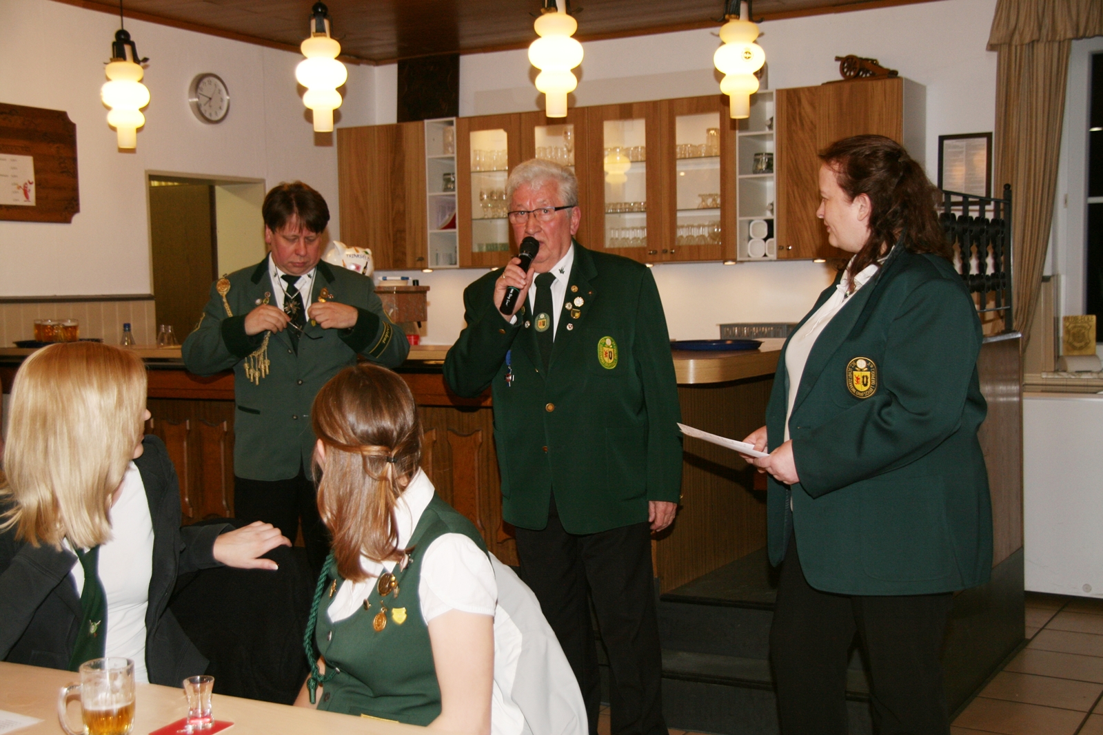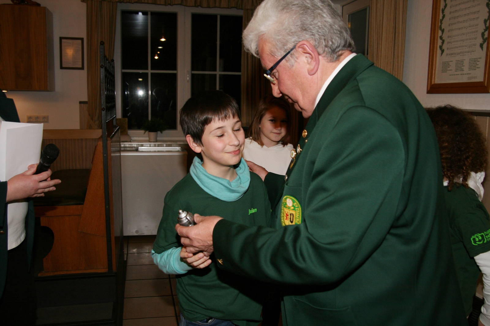 Britta Löhmann bat sodann die fünf jungen Sportschützen zu sich. Sie zählte unter viel Beifall die tollen Ergebnisse der Lichtpunktschützen auf, Friedel Kelkenberg waltete dabei seines „Amtes“ und überreichte ihnen die Erinnerungspokale mit guten Wünschen für die Zukunft und stets ein „Gut Schuß“!