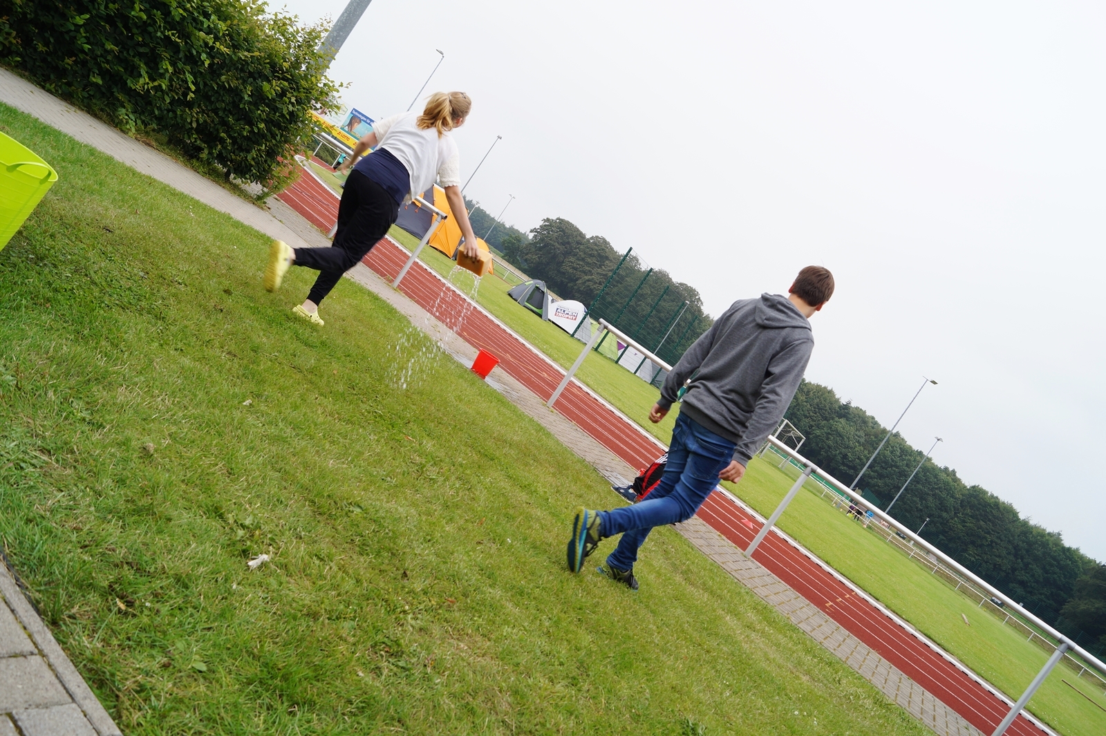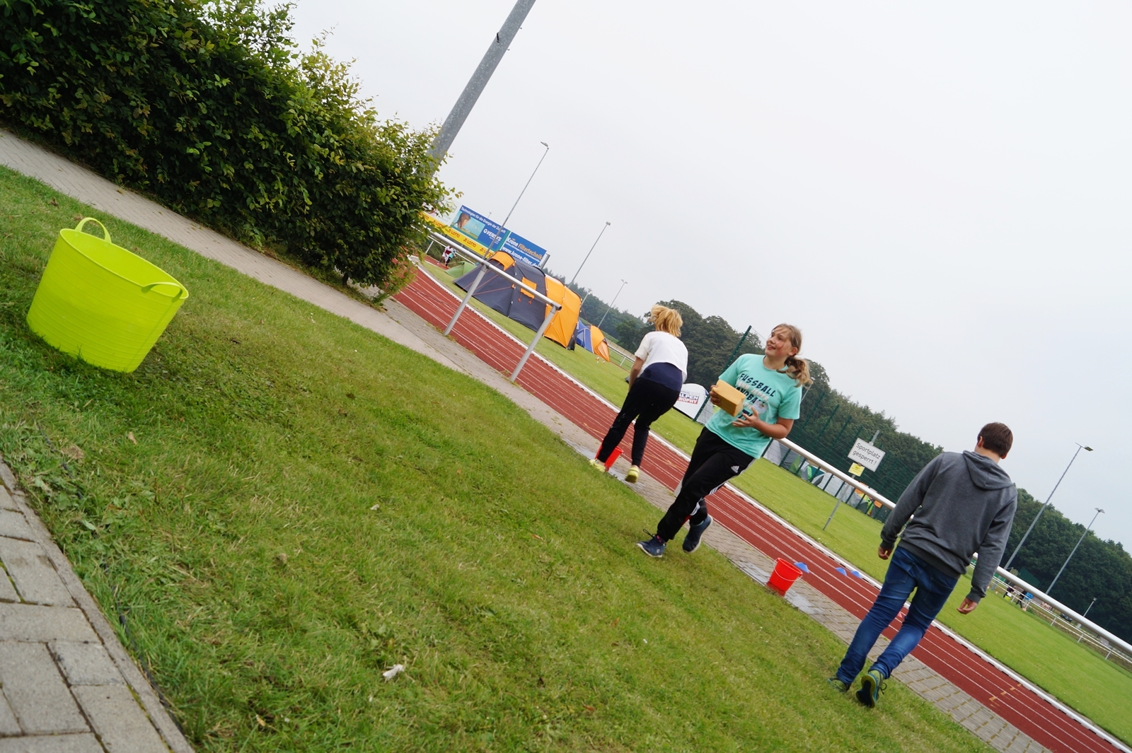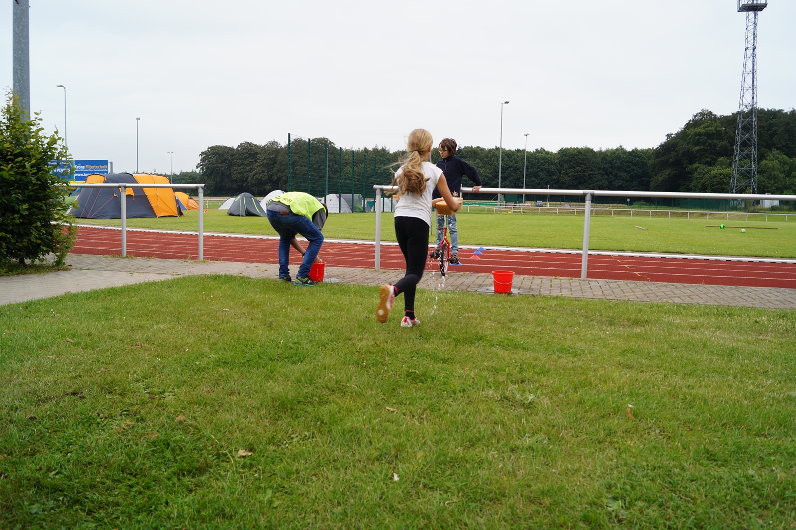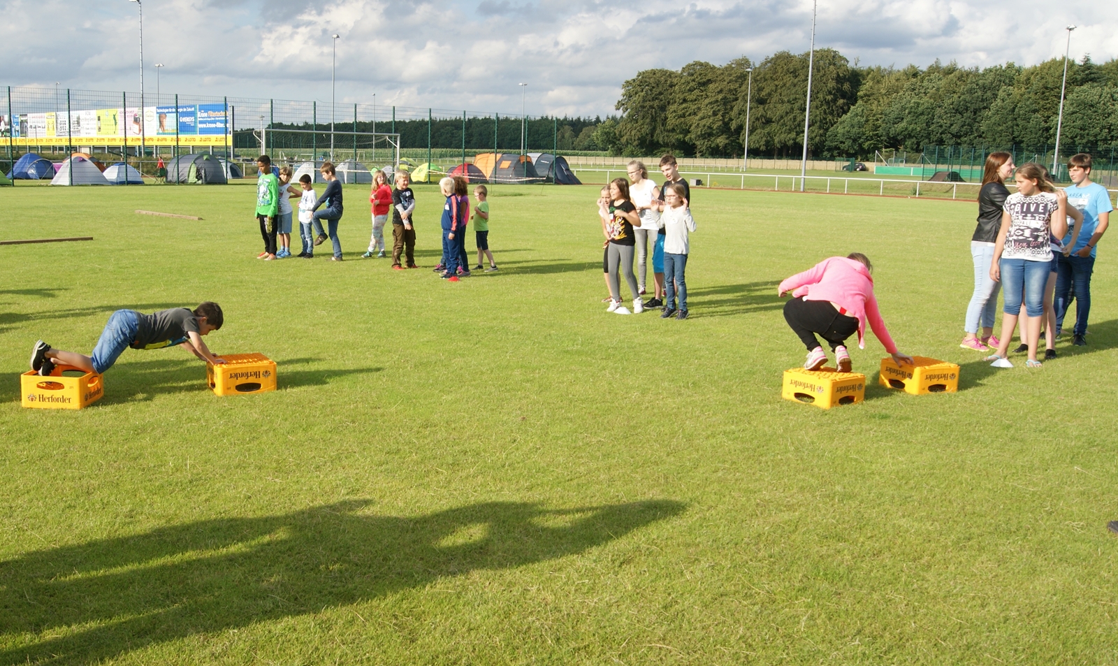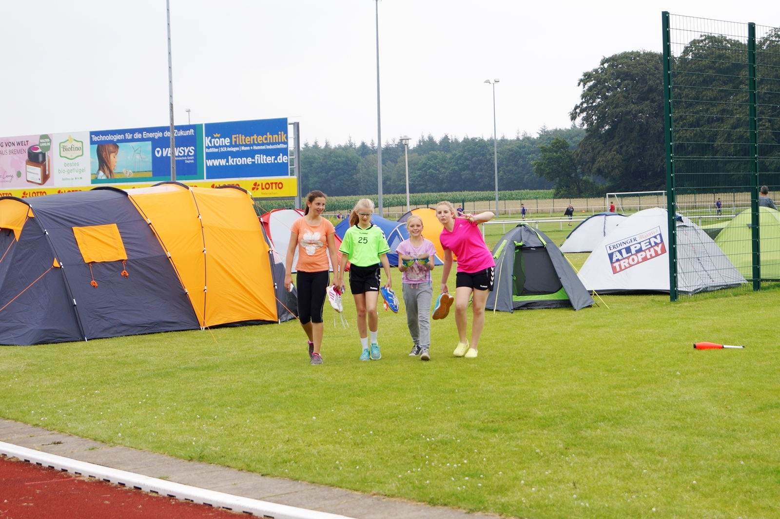 Auch der Staffellauf am nächsten Tag hatte es in sich, da im Rund des Stadions an sechs Stationen verschiedene Aufgaben bewältigt werden mussten wie Sackhüpfen oder Hindernisse. Die Siegerehrung am Abend ergab, dass „Die Großen“ in der Besetzung Ronja Finkenstädt, Johanna Grewe, Erik Wehrmann, Alexa Thrien und Lisa Reuter gewonnen hatten, aber es wurde nicht bierernst genommen, da für alle Teilnehmer Preise bereitstanden. Zwischendurch konnte aber auch eine Auszeit genommen werden, wobei das Spielmobil des Landkreises Diepholz wertvolle Dienste leistete. Hatte Petrus sich bis dahin von seiner guten Seite gezeigt, so ließ er in der Nacht auf Sonntag einen heftigen Regenschauer runtergehen, der einige Zelte unter Wasser setzte und die Bewohner veranlasste, ihre Schlafsäcke in der Sporthalle aufzuschlagen.