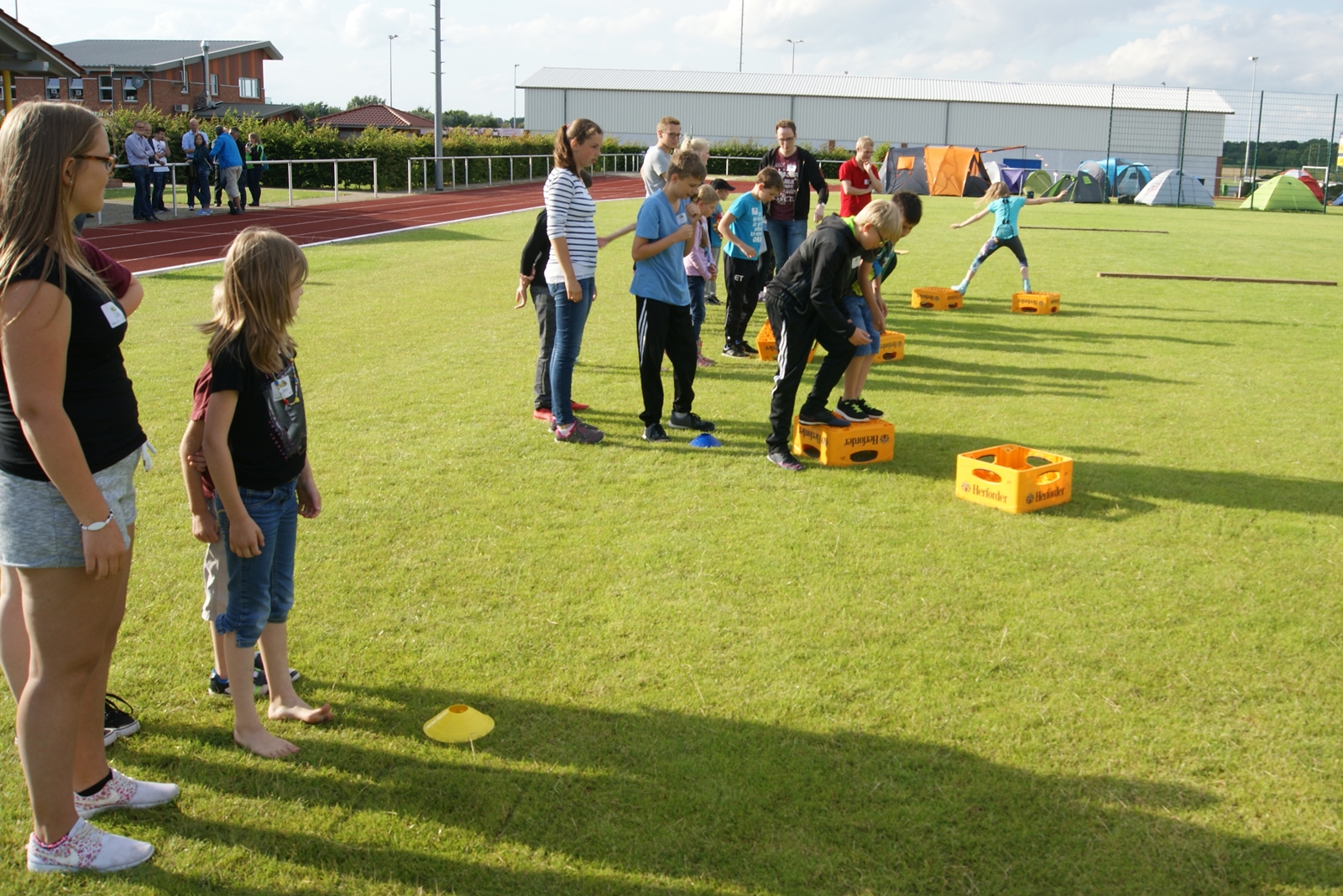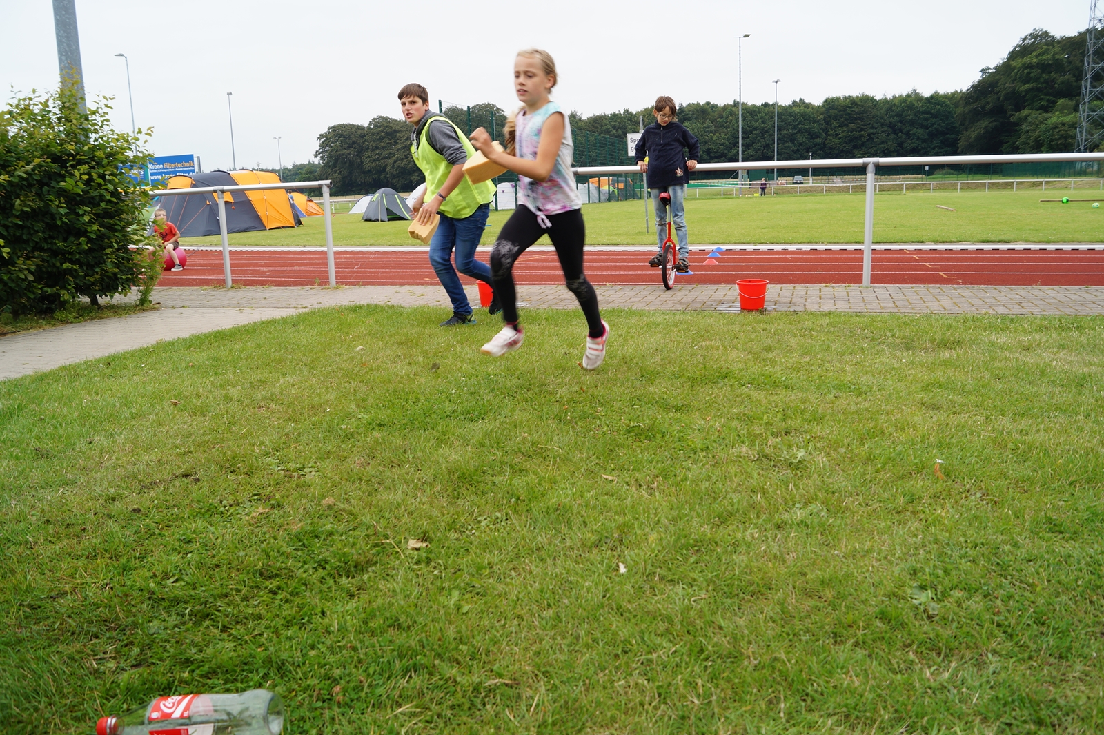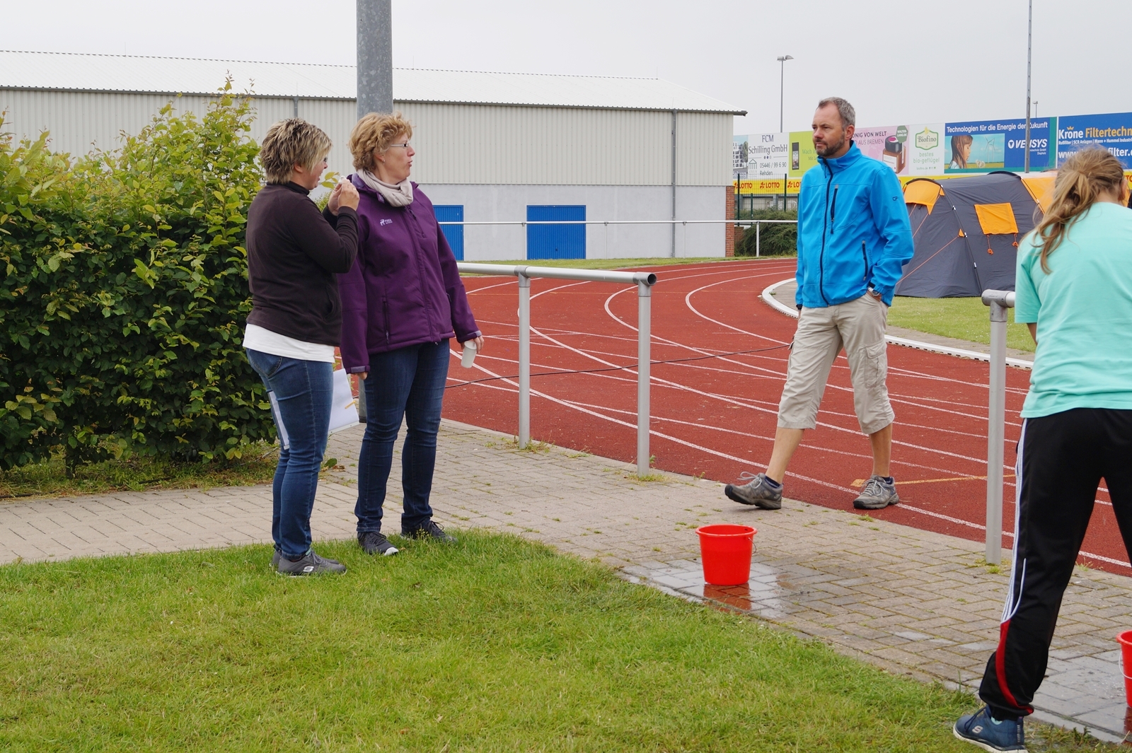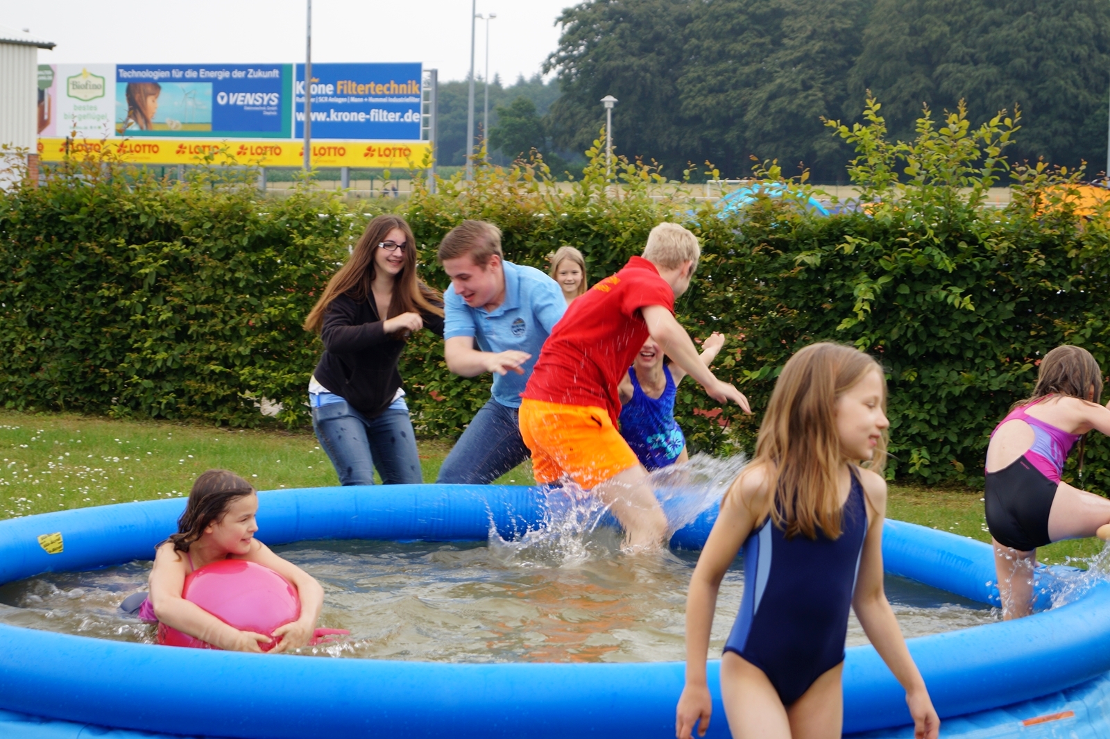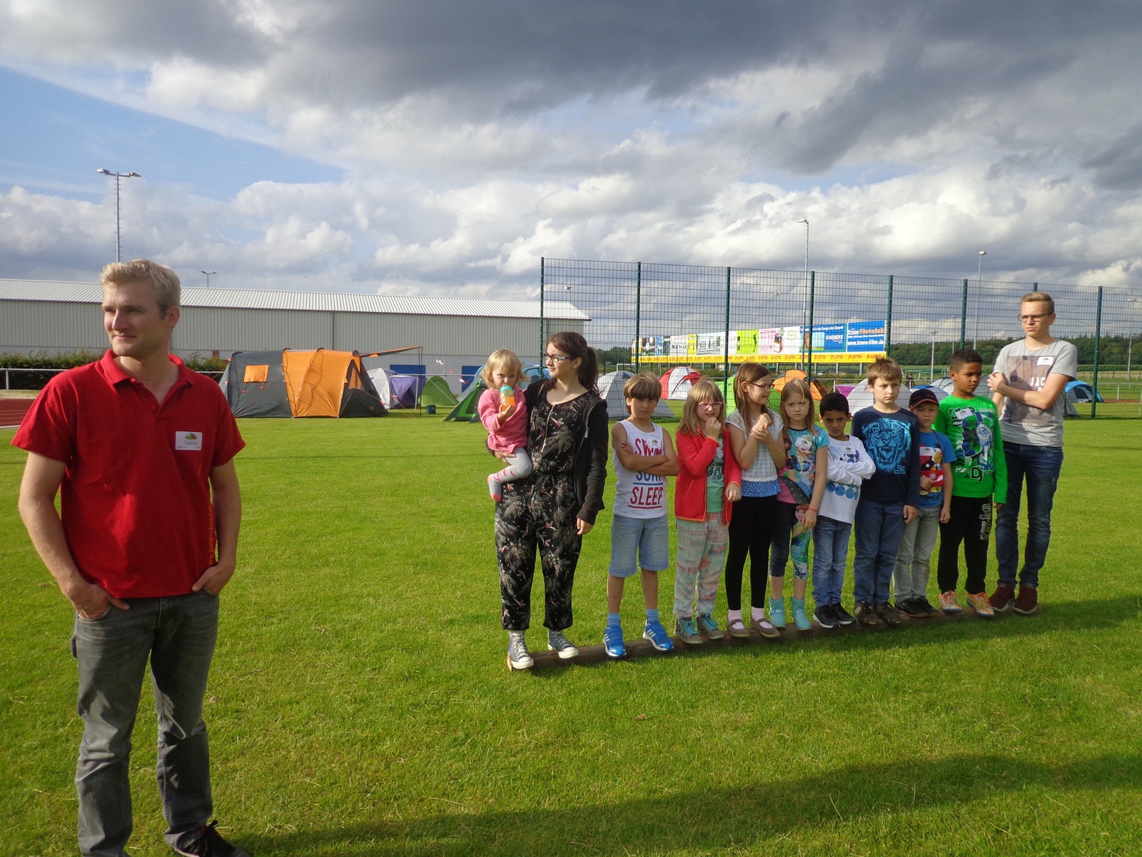 Auch der Staffellauf am nächsten Tag hatte es in sich, da im Rund des Stadions an sechs Stationen verschiedene Aufgaben bewältigt werden mussten wie Sackhüpfen oder Hindernisse. Die Siegerehrung am Abend ergab, dass „Die Großen“ in der Besetzung Ronja Finkenstädt, Johanna Grewe, Erik Wehrmann, Alexa Thrien und Lisa Reuter gewonnen hatten, aber es wurde nicht bierernst genommen, da für alle Teilnehmer Preise bereitstanden. Zwischendurch konnte aber auch eine Auszeit genommen werden, wobei das Spielmobil des Landkreises Diepholz wertvolle Dienste leistete. Hatte Petrus sich bis dahin von seiner guten Seite gezeigt, so ließ er in der Nacht auf Sonntag einen heftigen Regenschauer runtergehen, der einige Zelte unter Wasser setzte und die Bewohner veranlasste, ihre Schlafsäcke in der Sporthalle aufzuschlagen.