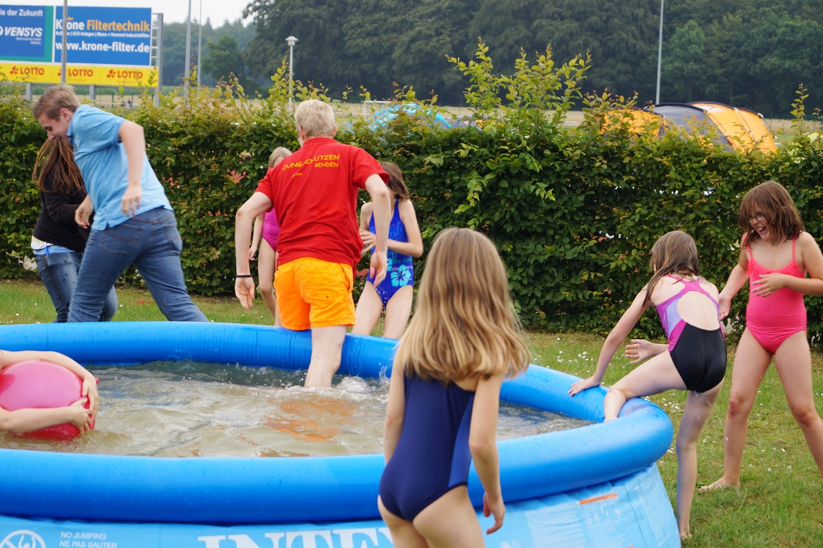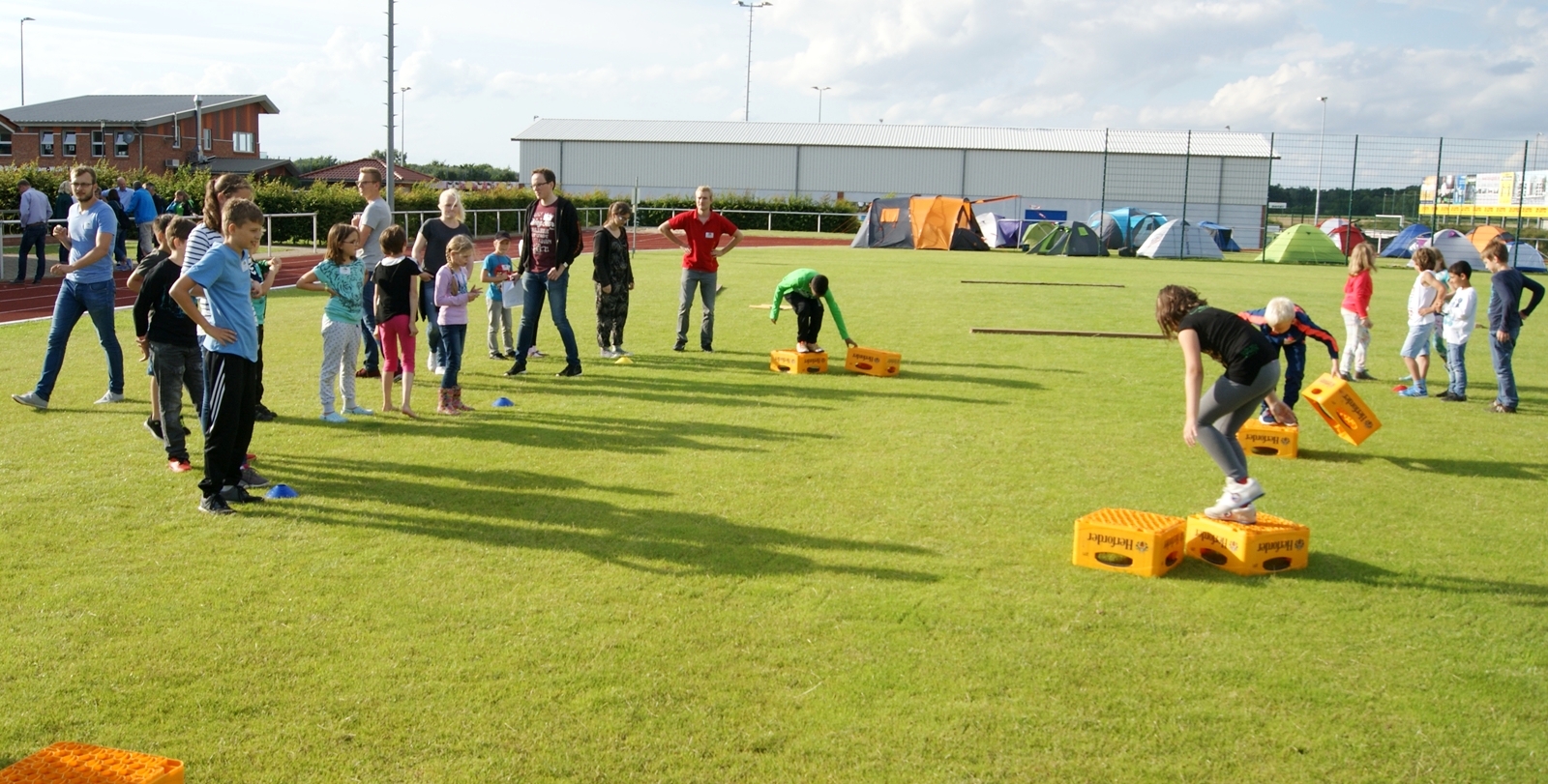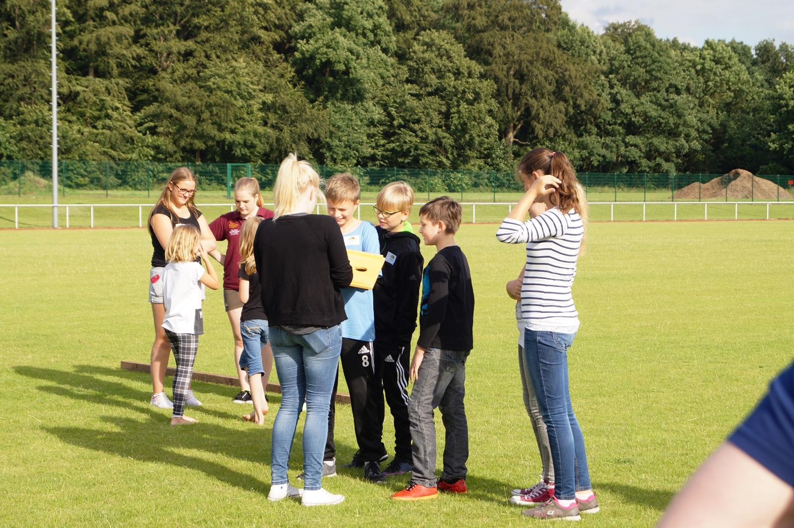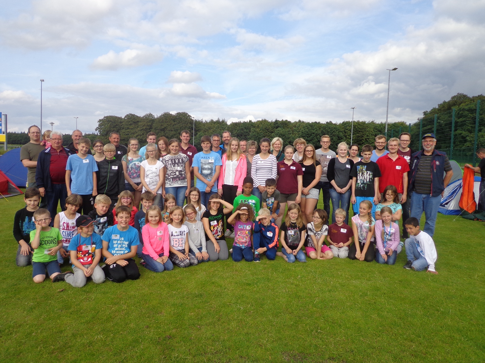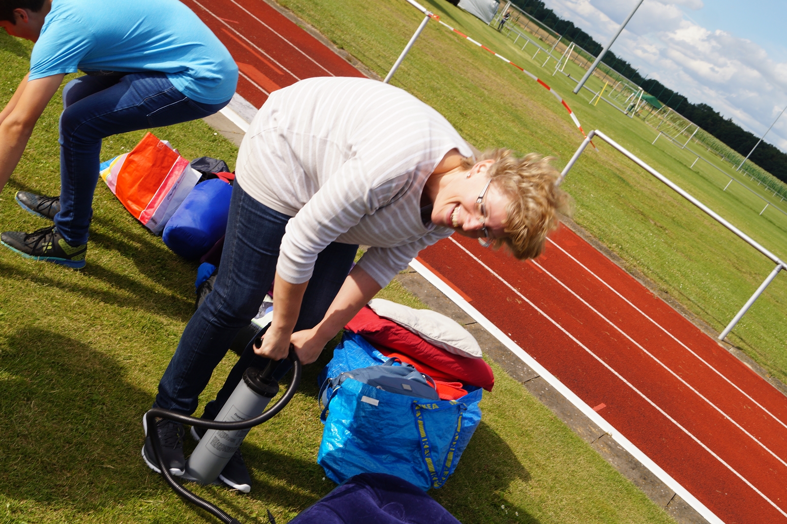 Auch der Staffellauf am nächsten Tag hatte es in sich, da im Rund des Stadions an sechs Stationen verschiedene Aufgaben bewältigt werden mussten wie Sackhüpfen oder Hindernisse. Die Siegerehrung am Abend ergab, dass „Die Großen“ in der Besetzung Ronja Finkenstädt, Johanna Grewe, Erik Wehrmann, Alexa Thrien und Lisa Reuter gewonnen hatten, aber es wurde nicht bierernst genommen, da für alle Teilnehmer Preise bereitstanden. Zwischendurch konnte aber auch eine Auszeit genommen werden, wobei das Spielmobil des Landkreises Diepholz wertvolle Dienste leistete. Hatte Petrus sich bis dahin von seiner guten Seite gezeigt, so ließ er in der Nacht auf Sonntag einen heftigen Regenschauer runtergehen, der einige Zelte unter Wasser setzte und die Bewohner veranlasste, ihre Schlafsäcke in der Sporthalle aufzuschlagen.