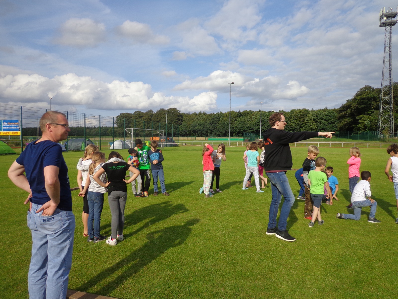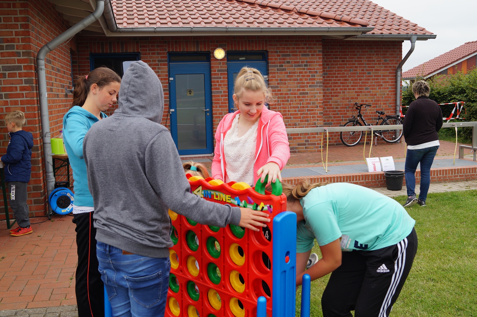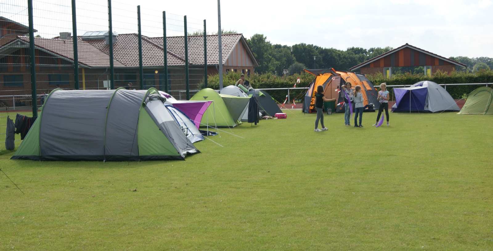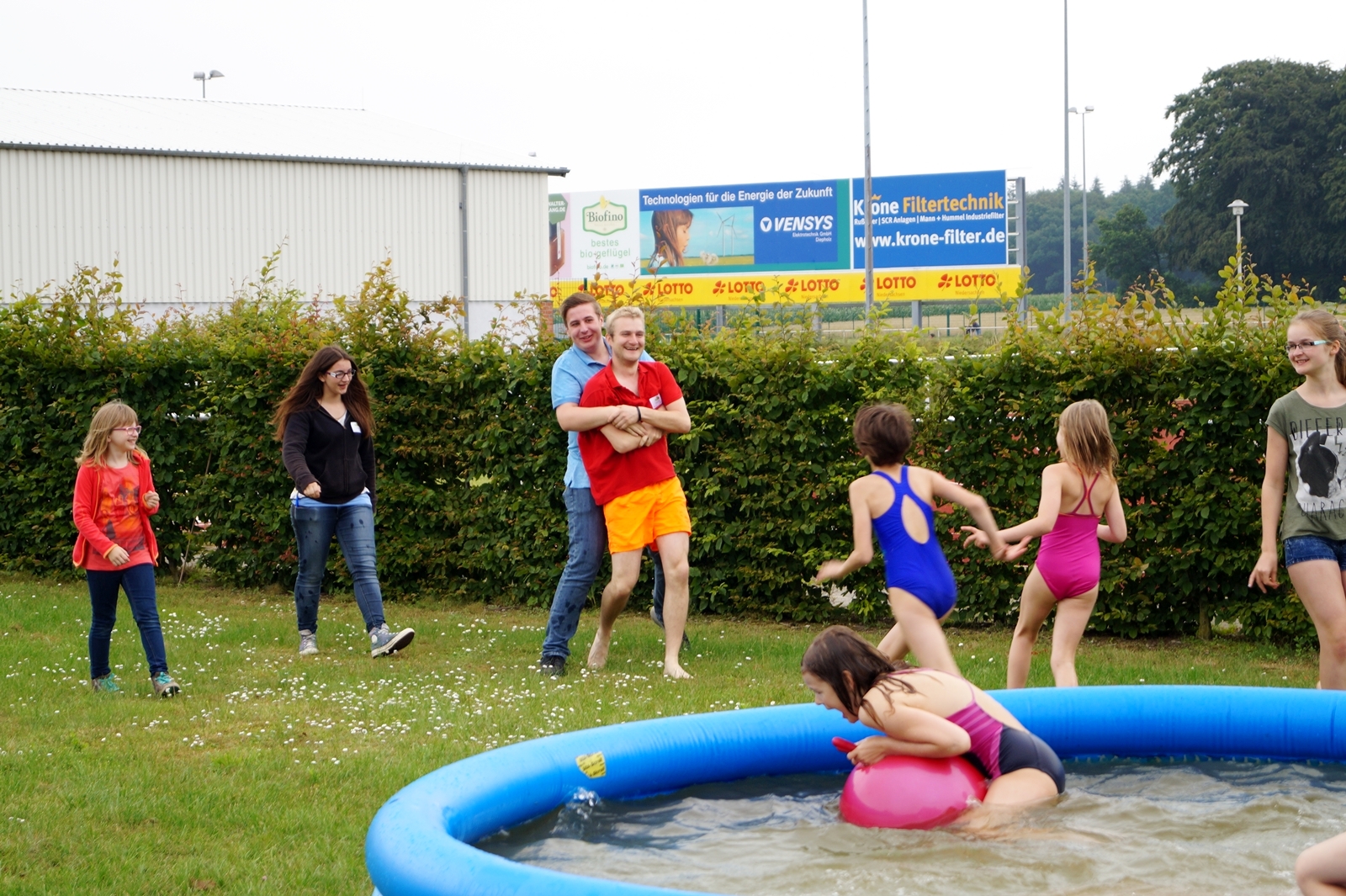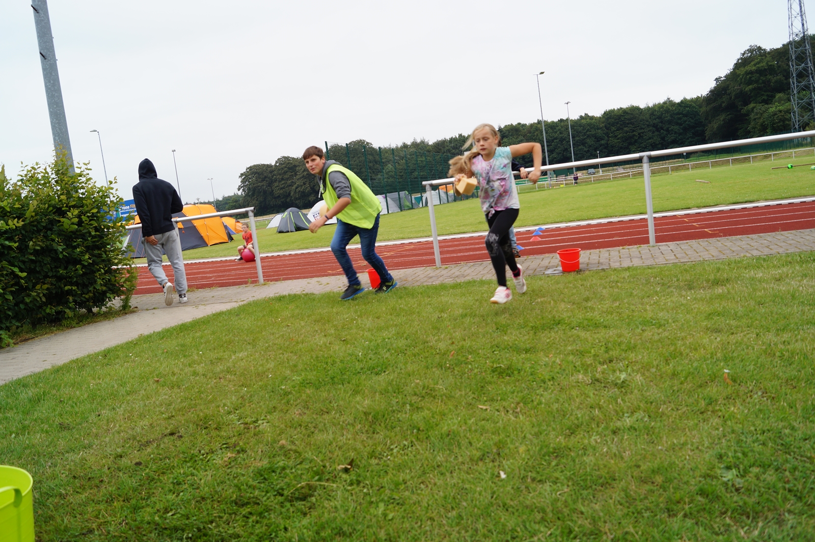 Auch der Staffellauf am nächsten Tag hatte es in sich, da im Rund des Stadions an sechs Stationen verschiedene Aufgaben bewältigt werden mussten wie Sackhüpfen oder Hindernisse. Die Siegerehrung am Abend ergab, dass „Die Großen“ in der Besetzung Ronja Finkenstädt, Johanna Grewe, Erik Wehrmann, Alexa Thrien und Lisa Reuter gewonnen hatten, aber es wurde nicht bierernst genommen, da für alle Teilnehmer Preise bereitstanden. Zwischendurch konnte aber auch eine Auszeit genommen werden, wobei das Spielmobil des Landkreises Diepholz wertvolle Dienste leistete. Hatte Petrus sich bis dahin von seiner guten Seite gezeigt, so ließ er in der Nacht auf Sonntag einen heftigen Regenschauer runtergehen, der einige Zelte unter Wasser setzte und die Bewohner veranlasste, ihre Schlafsäcke in der Sporthalle aufzuschlagen.