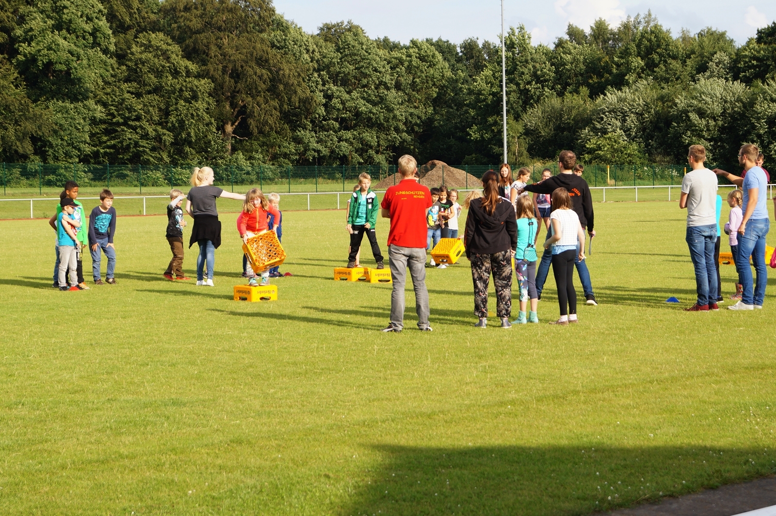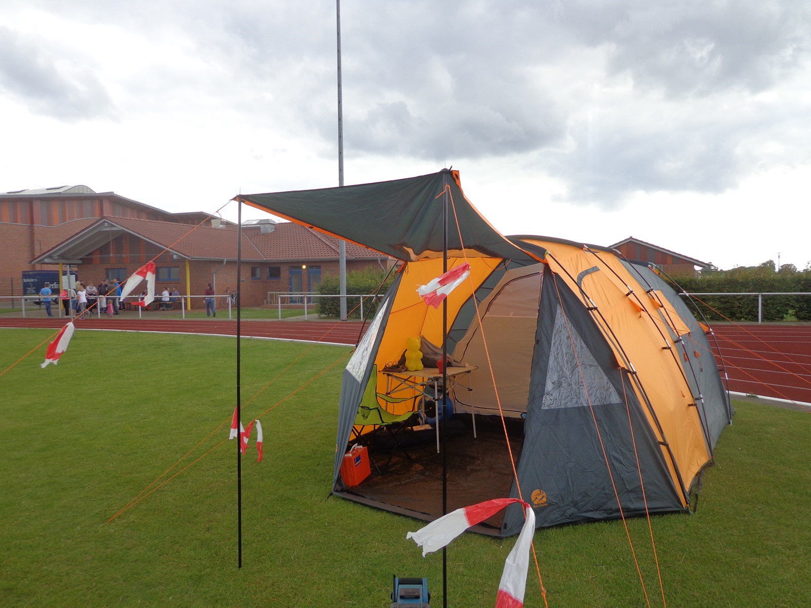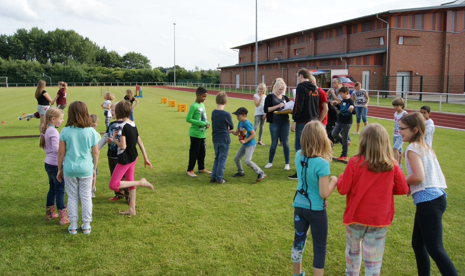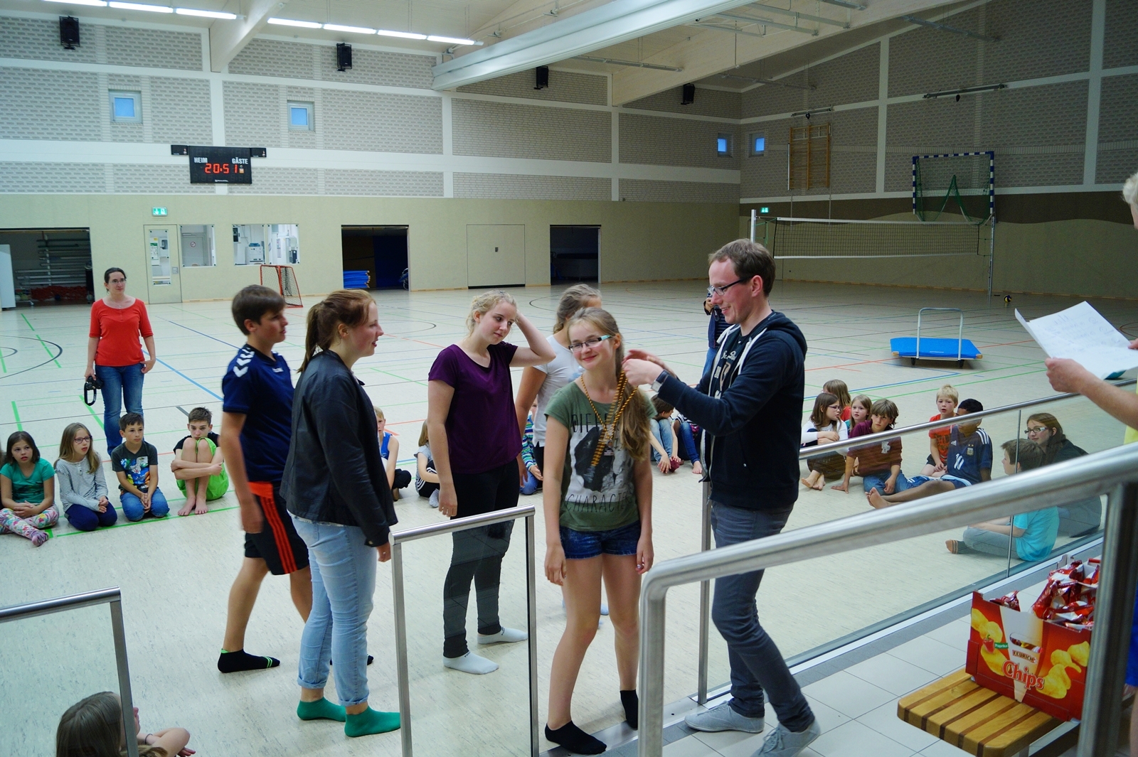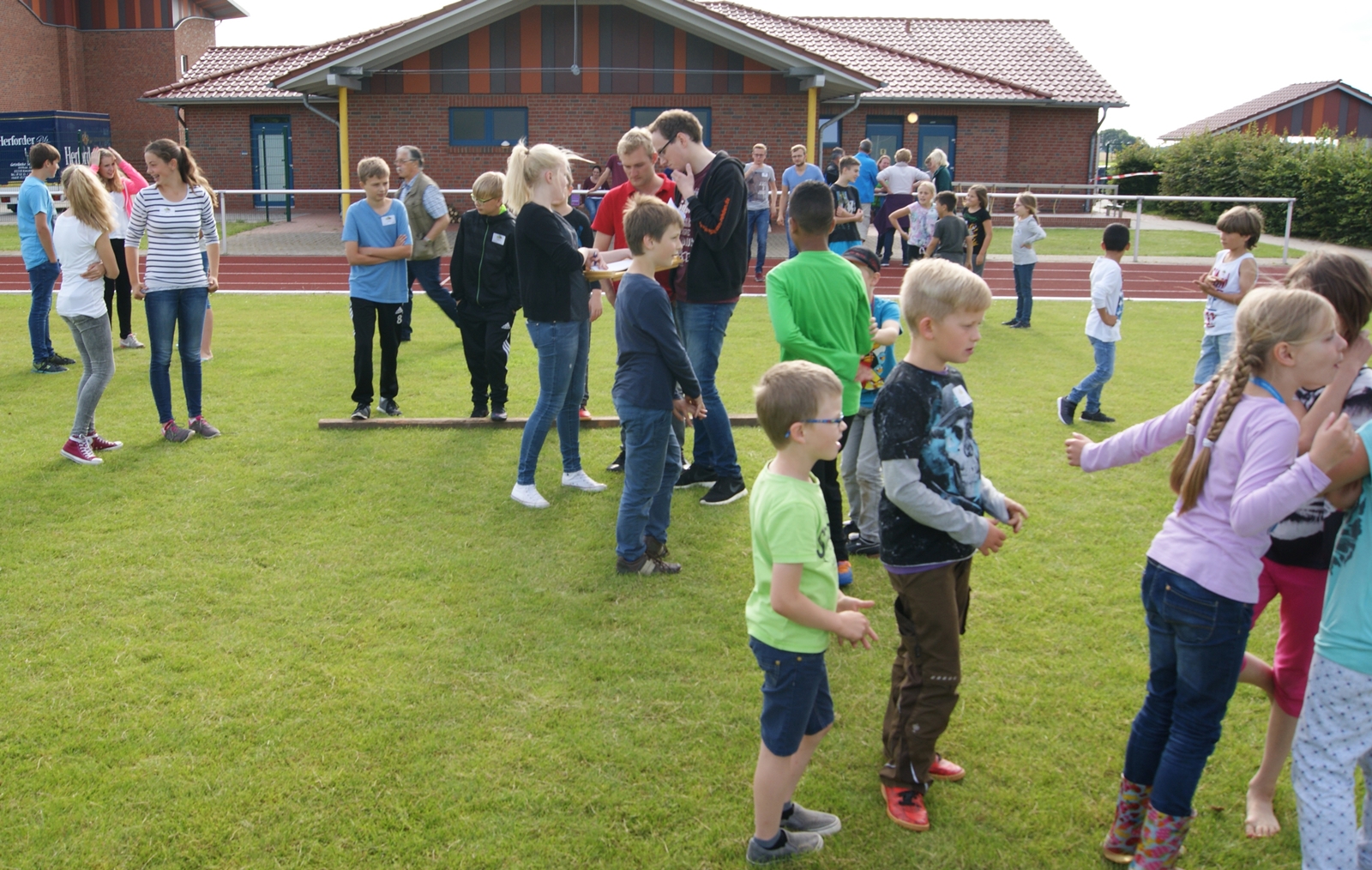 Auch der Staffellauf am nächsten Tag hatte es in sich, da im Rund des Stadions an sechs Stationen verschiedene Aufgaben bewältigt werden mussten wie Sackhüpfen oder Hindernisse. Die Siegerehrung am Abend ergab, dass „Die Großen“ in der Besetzung Ronja Finkenstädt, Johanna Grewe, Erik Wehrmann, Alexa Thrien und Lisa Reuter gewonnen hatten, aber es wurde nicht bierernst genommen, da für alle Teilnehmer Preise bereitstanden. Zwischendurch konnte aber auch eine Auszeit genommen werden, wobei das Spielmobil des Landkreises Diepholz wertvolle Dienste leistete. Hatte Petrus sich bis dahin von seiner guten Seite gezeigt, so ließ er in der Nacht auf Sonntag einen heftigen Regenschauer runtergehen, der einige Zelte unter Wasser setzte und die Bewohner veranlasste, ihre Schlafsäcke in der Sporthalle aufzuschlagen.