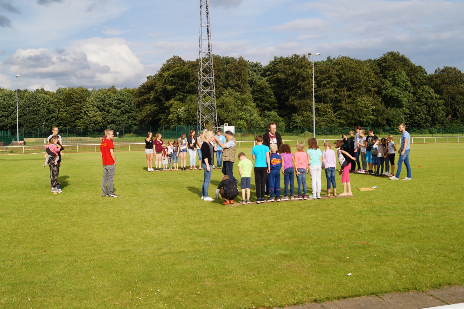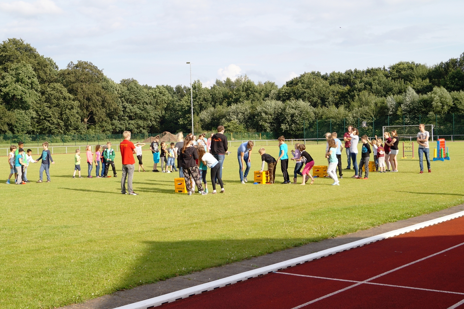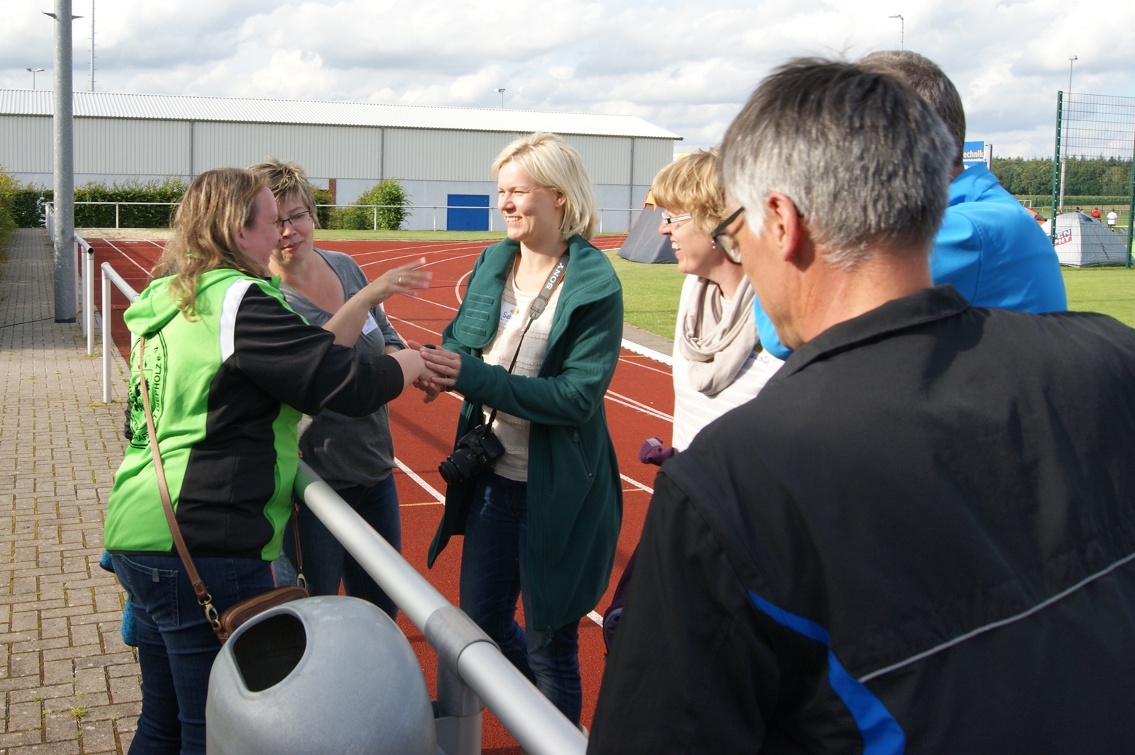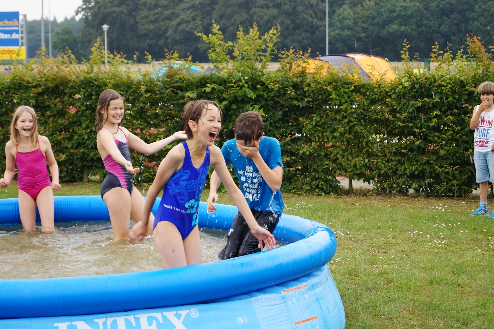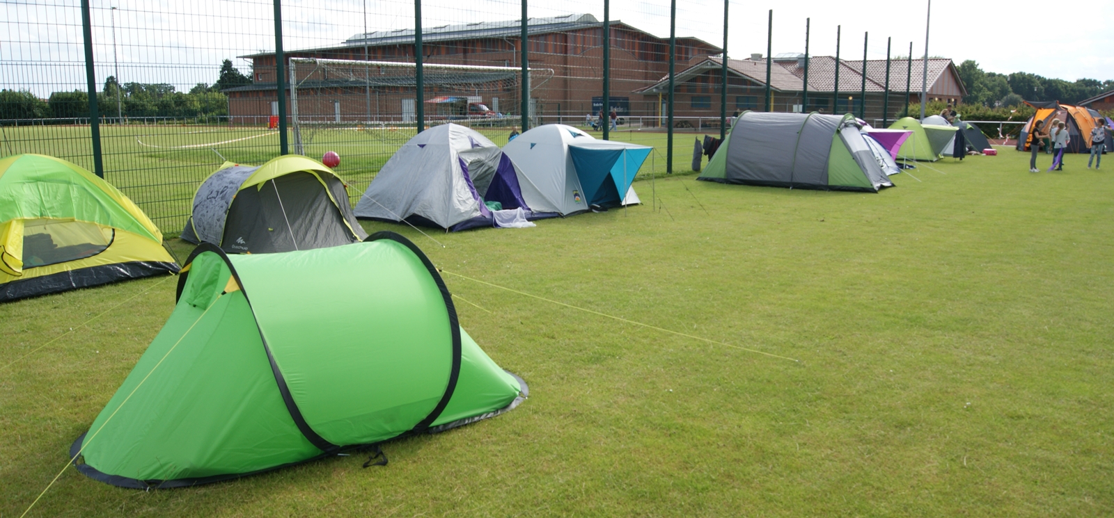 Auch der Staffellauf am nächsten Tag hatte es in sich, da im Rund des Stadions an sechs Stationen verschiedene Aufgaben bewältigt werden mussten wie Sackhüpfen oder Hindernisse. Die Siegerehrung am Abend ergab, dass „Die Großen“ in der Besetzung Ronja Finkenstädt, Johanna Grewe, Erik Wehrmann, Alexa Thrien und Lisa Reuter gewonnen hatten, aber es wurde nicht bierernst genommen, da für alle Teilnehmer Preise bereitstanden. Zwischendurch konnte aber auch eine Auszeit genommen werden, wobei das Spielmobil des Landkreises Diepholz wertvolle Dienste leistete. Hatte Petrus sich bis dahin von seiner guten Seite gezeigt, so ließ er in der Nacht auf Sonntag einen heftigen Regenschauer runtergehen, der einige Zelte unter Wasser setzte und die Bewohner veranlasste, ihre Schlafsäcke in der Sporthalle aufzuschlagen.