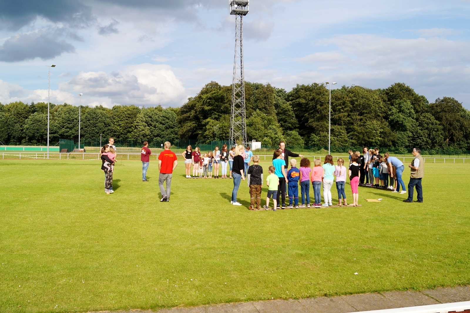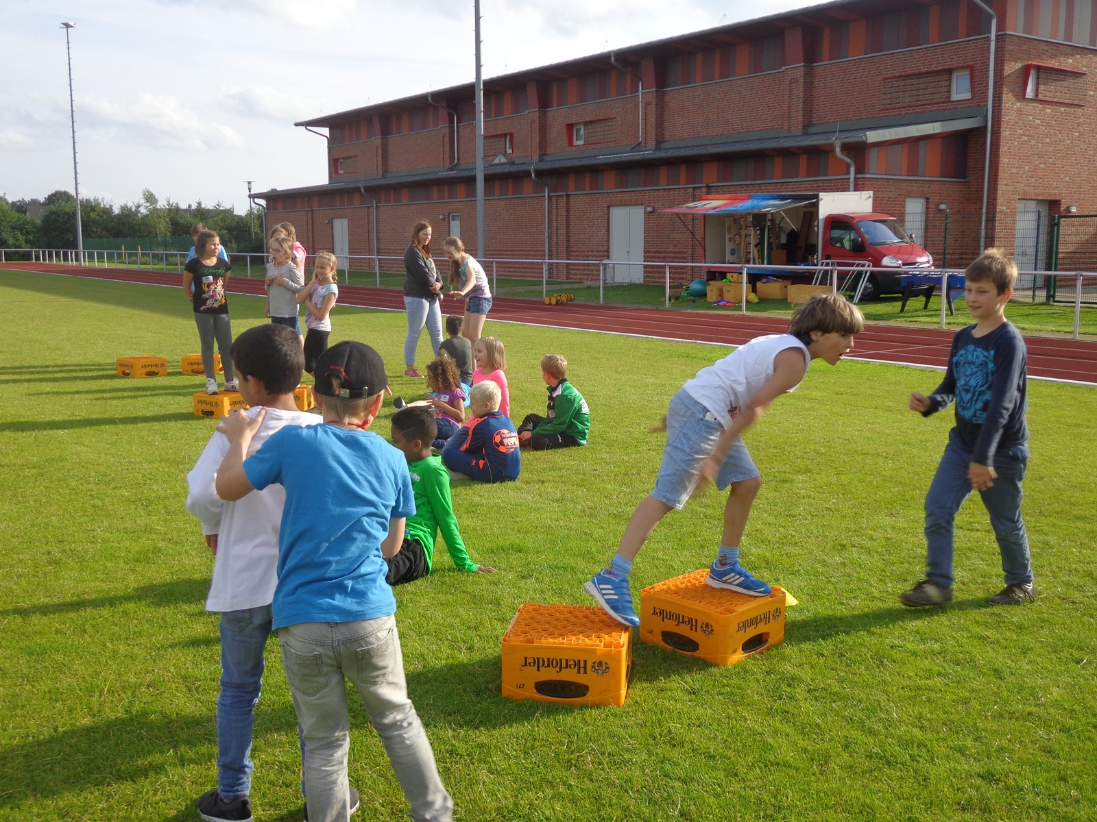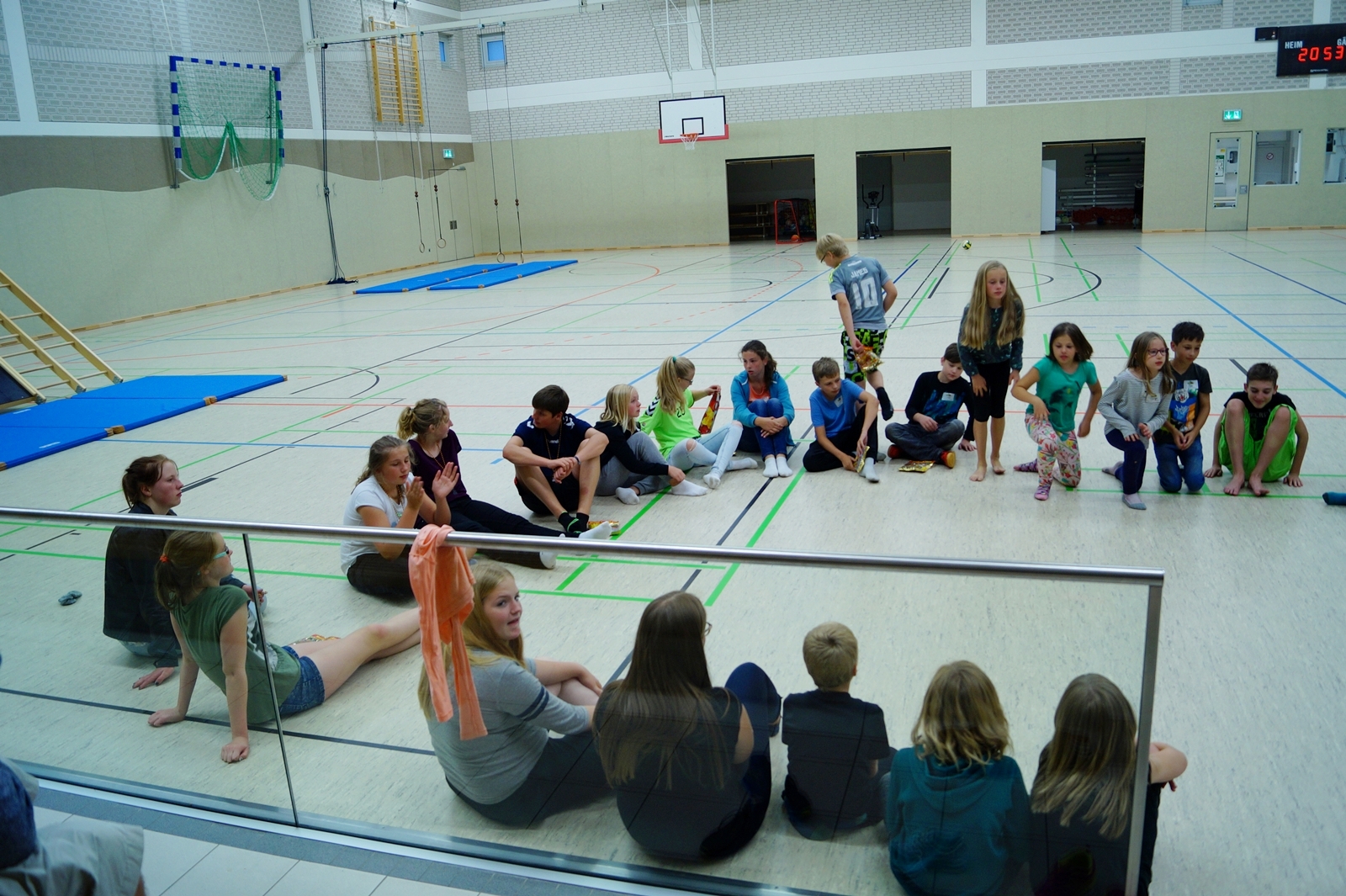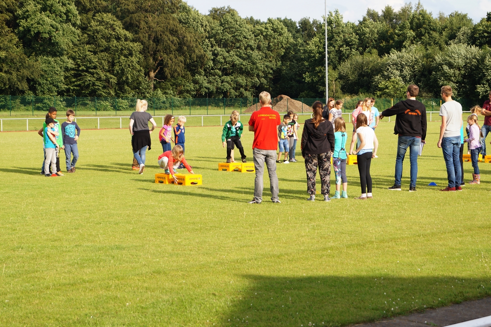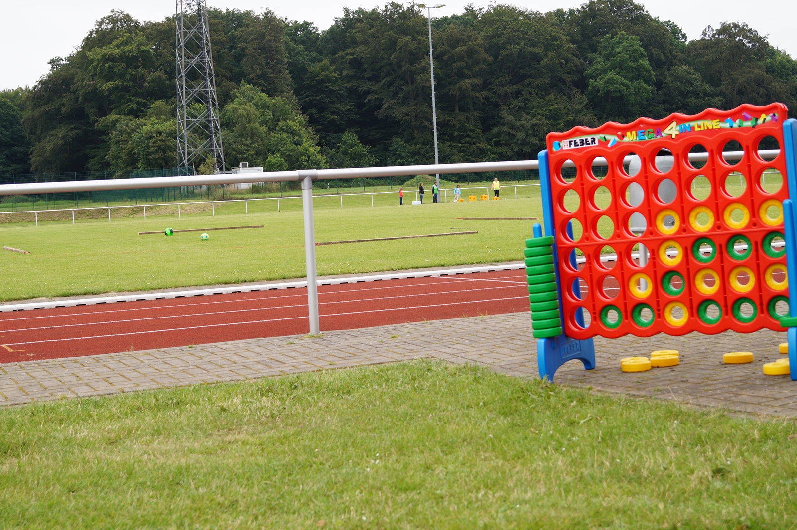 Auch der Staffellauf am nächsten Tag hatte es in sich, da im Rund des Stadions an sechs Stationen verschiedene Aufgaben bewältigt werden mussten wie Sackhüpfen oder Hindernisse. Die Siegerehrung am Abend ergab, dass „Die Großen“ in der Besetzung Ronja Finkenstädt, Johanna Grewe, Erik Wehrmann, Alexa Thrien und Lisa Reuter gewonnen hatten, aber es wurde nicht bierernst genommen, da für alle Teilnehmer Preise bereitstanden. Zwischendurch konnte aber auch eine Auszeit genommen werden, wobei das Spielmobil des Landkreises Diepholz wertvolle Dienste leistete. Hatte Petrus sich bis dahin von seiner guten Seite gezeigt, so ließ er in der Nacht auf Sonntag einen heftigen Regenschauer runtergehen, der einige Zelte unter Wasser setzte und die Bewohner veranlasste, ihre Schlafsäcke in der Sporthalle aufzuschlagen.
