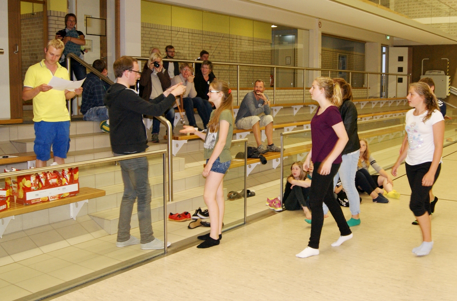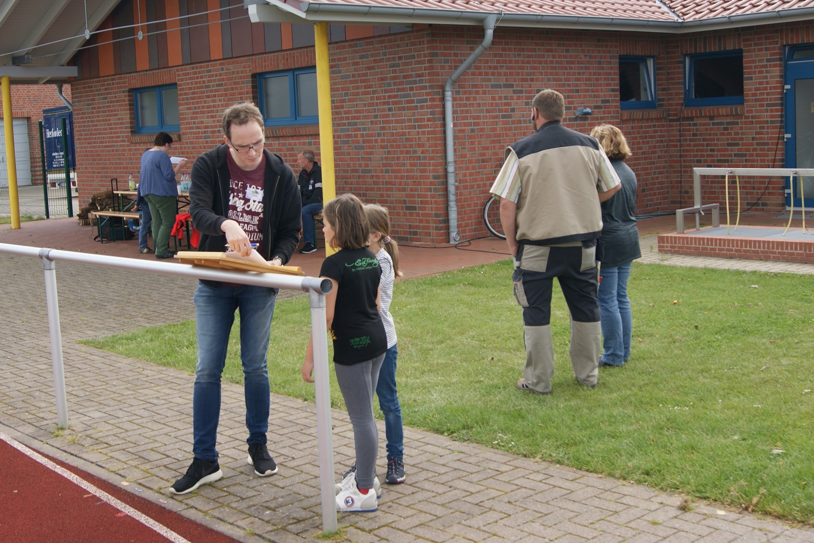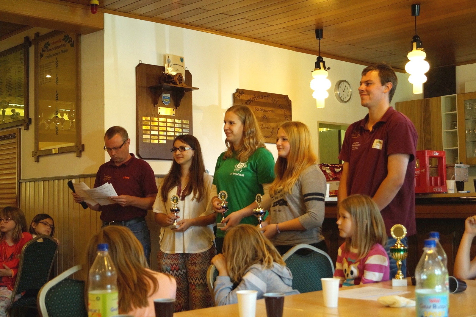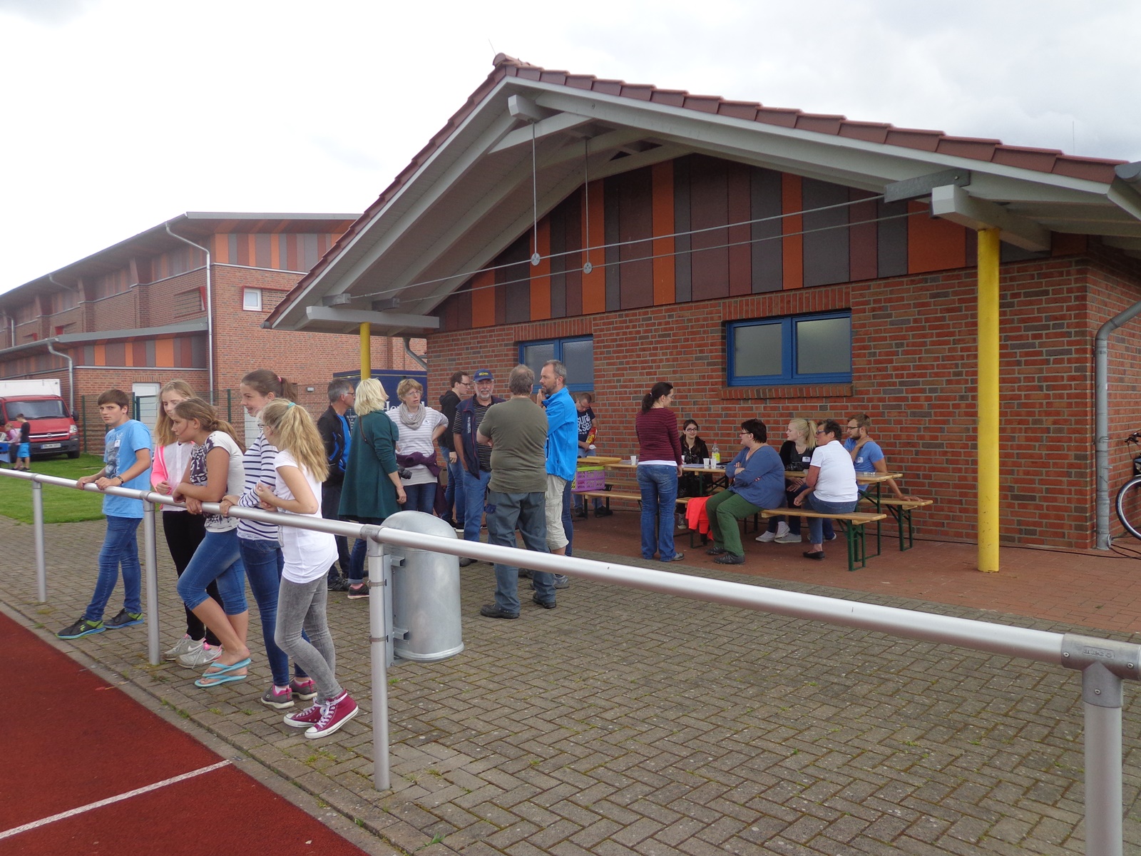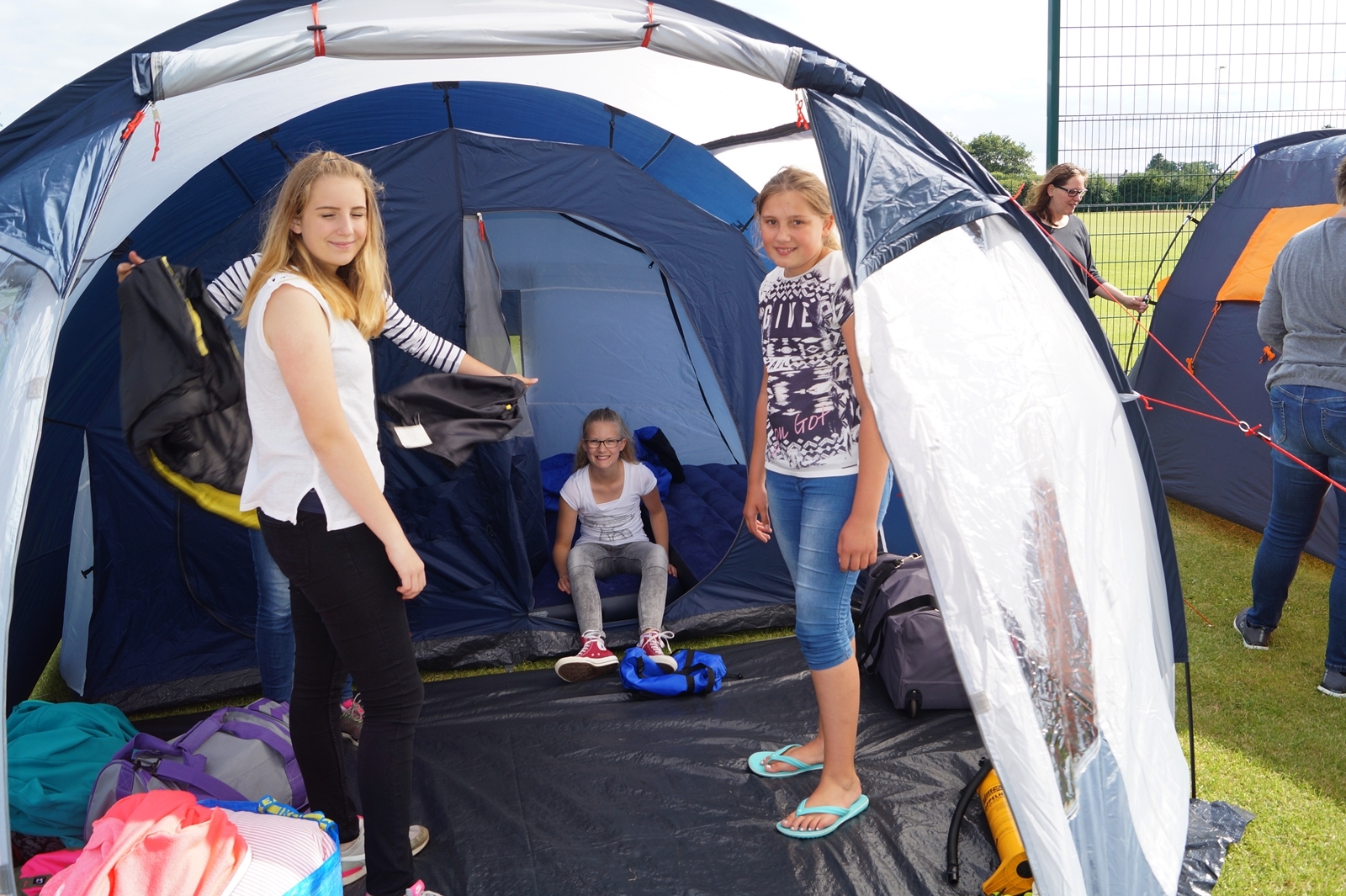 Auch der Staffellauf am nächsten Tag hatte es in sich, da im Rund des Stadions an sechs Stationen verschiedene Aufgaben bewältigt werden mussten wie Sackhüpfen oder Hindernisse. Die Siegerehrung am Abend ergab, dass „Die Großen“ in der Besetzung Ronja Finkenstädt, Johanna Grewe, Erik Wehrmann, Alexa Thrien und Lisa Reuter gewonnen hatten, aber es wurde nicht bierernst genommen, da für alle Teilnehmer Preise bereitstanden. Zwischendurch konnte aber auch eine Auszeit genommen werden, wobei das Spielmobil des Landkreises Diepholz wertvolle Dienste leistete. Hatte Petrus sich bis dahin von seiner guten Seite gezeigt, so ließ er in der Nacht auf Sonntag einen heftigen Regenschauer runtergehen, der einige Zelte unter Wasser setzte und die Bewohner veranlasste, ihre Schlafsäcke in der Sporthalle aufzuschlagen.