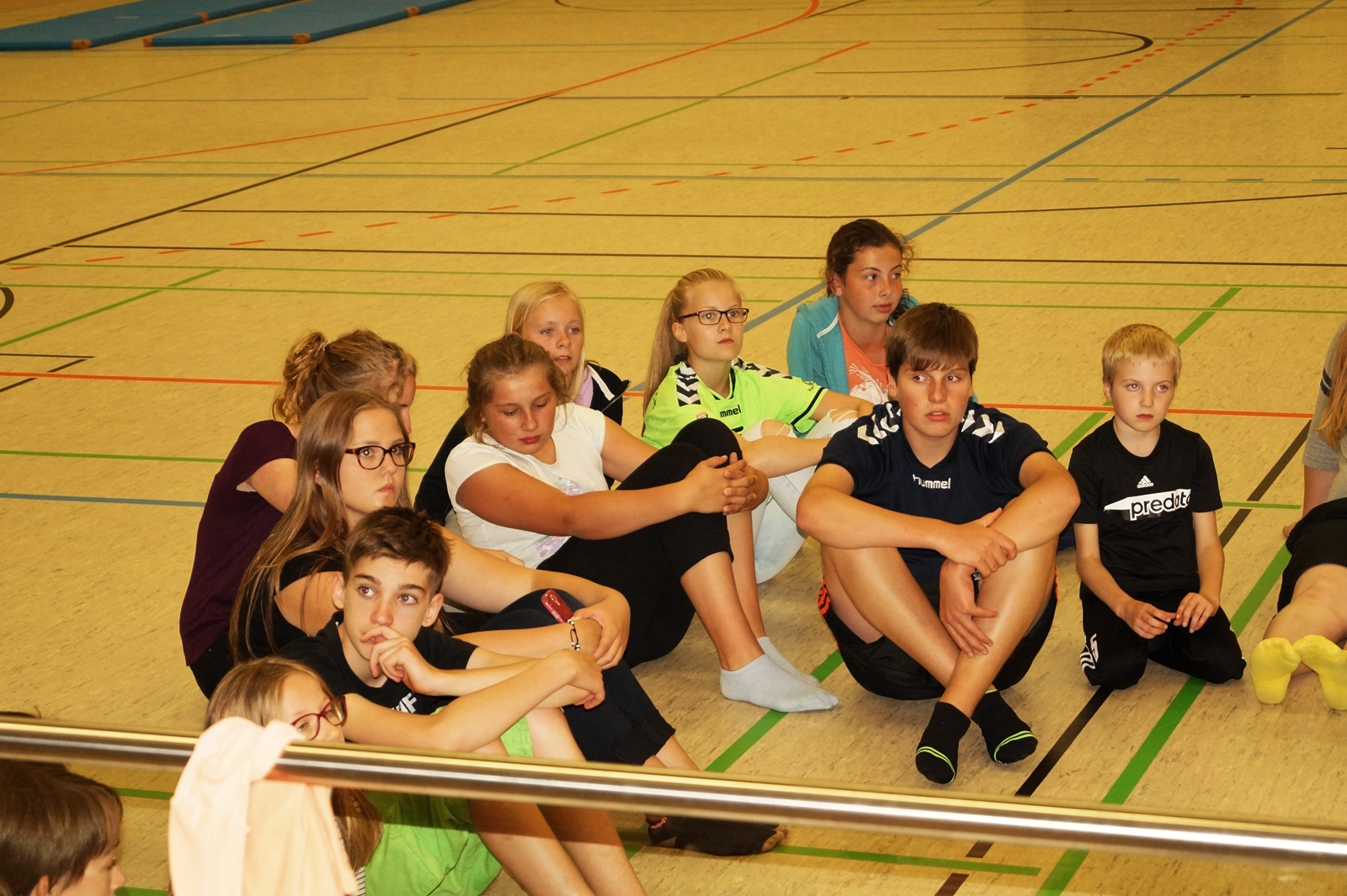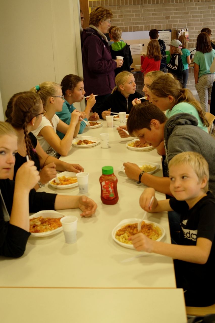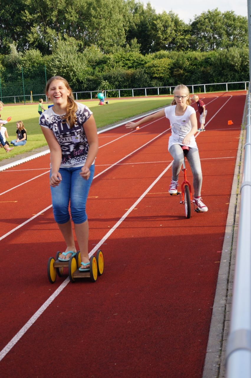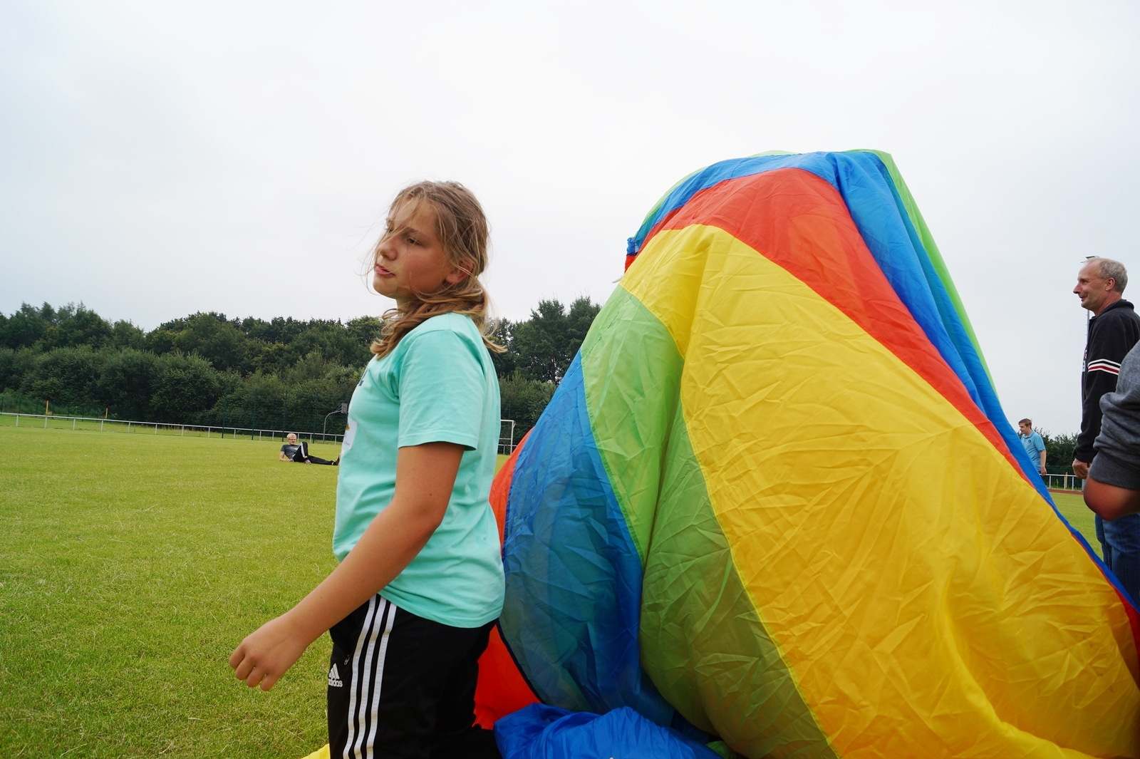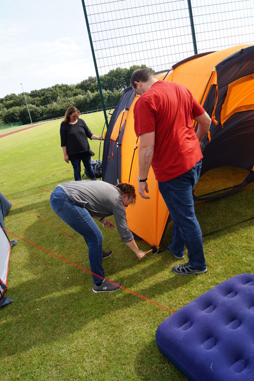 Auch der Staffellauf am nächsten Tag hatte es in sich, da im Rund des Stadions an sechs Stationen verschiedene Aufgaben bewältigt werden mussten wie Sackhüpfen oder Hindernisse. Die Siegerehrung am Abend ergab, dass „Die Großen“ in der Besetzung Ronja Finkenstädt, Johanna Grewe, Erik Wehrmann, Alexa Thrien und Lisa Reuter gewonnen hatten, aber es wurde nicht bierernst genommen, da für alle Teilnehmer Preise bereitstanden. Zwischendurch konnte aber auch eine Auszeit genommen werden, wobei das Spielmobil des Landkreises Diepholz wertvolle Dienste leistete. Hatte Petrus sich bis dahin von seiner guten Seite gezeigt, so ließ er in der Nacht auf Sonntag einen heftigen Regenschauer runtergehen, der einige Zelte unter Wasser setzte und die Bewohner veranlasste, ihre Schlafsäcke in der Sporthalle aufzuschlagen.