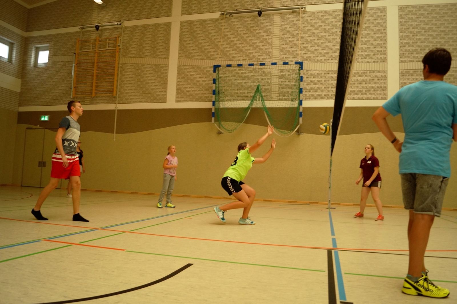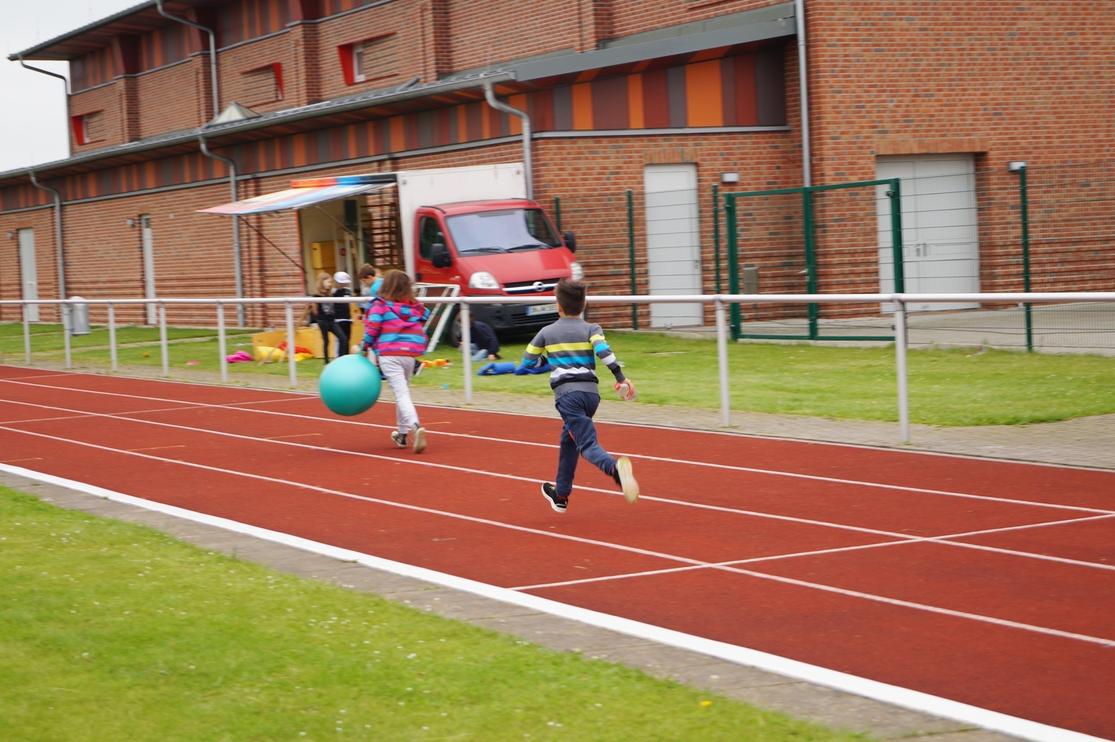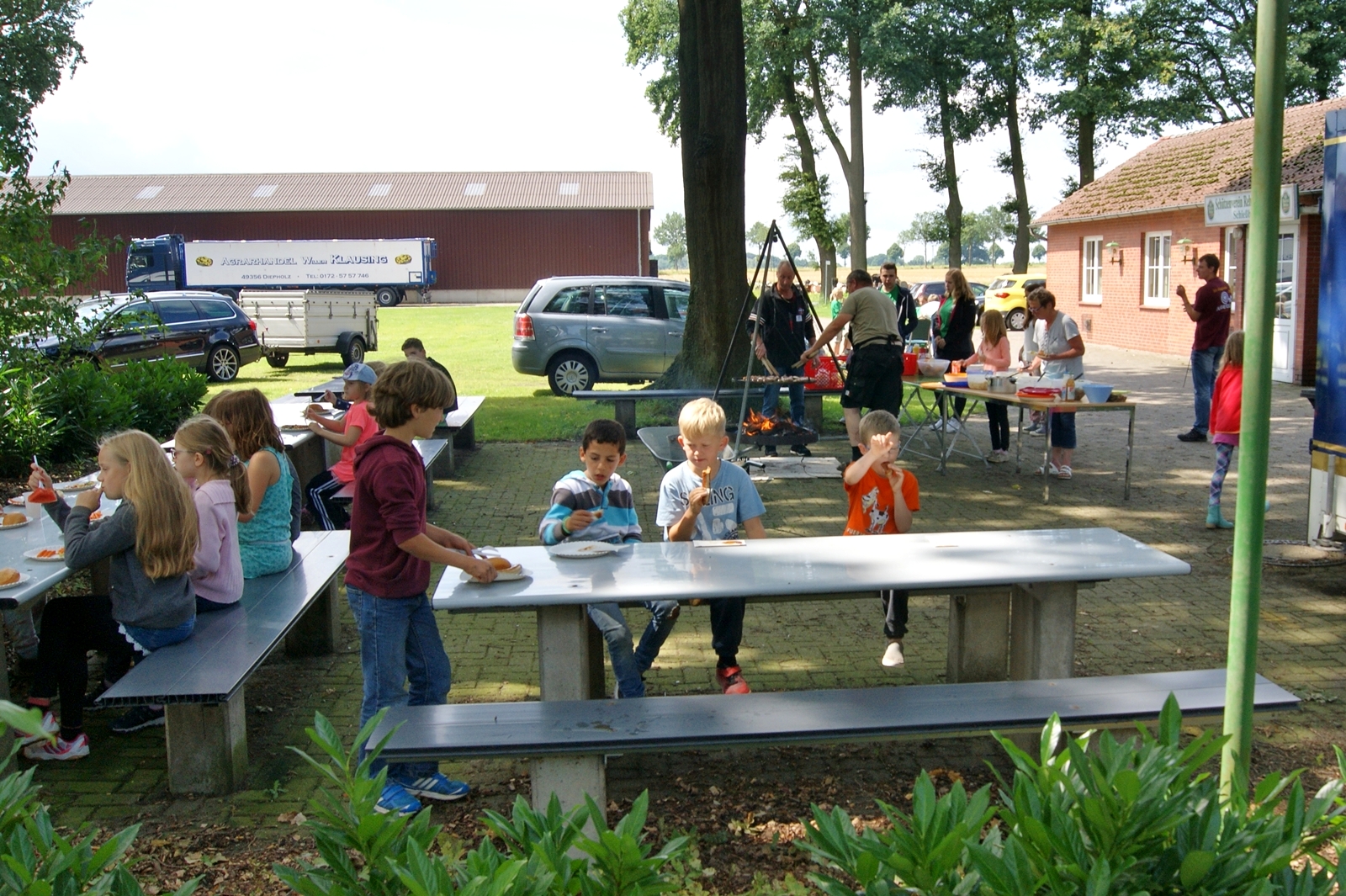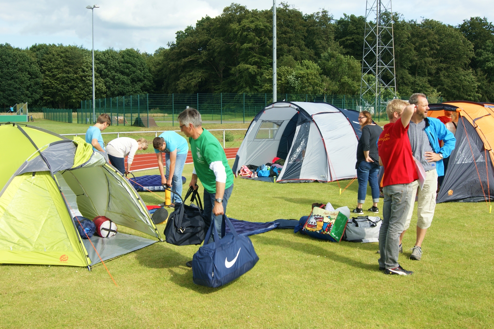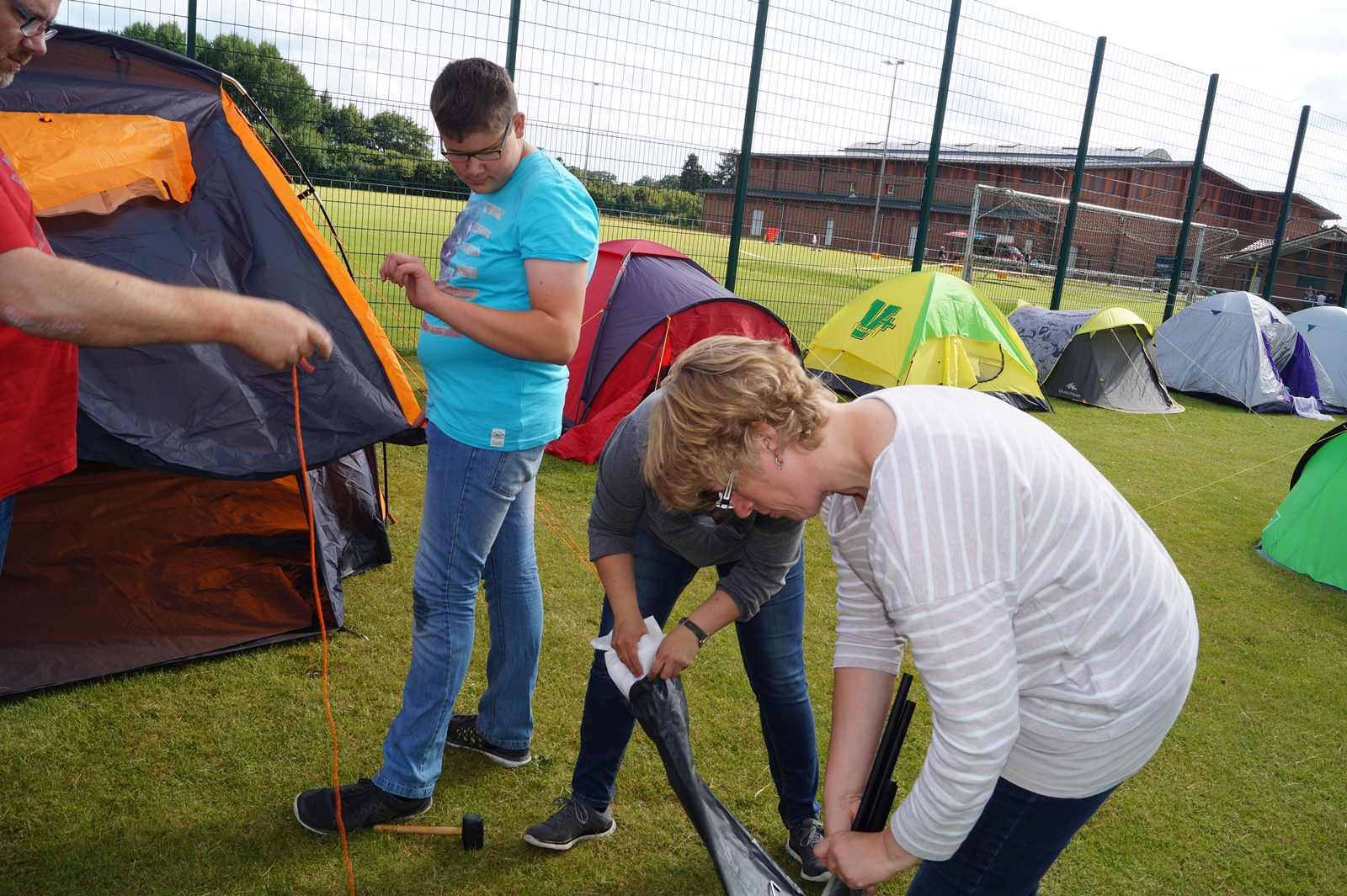 Auch der Staffellauf am nächsten Tag hatte es in sich, da im Rund des Stadions an sechs Stationen verschiedene Aufgaben bewältigt werden mussten wie Sackhüpfen oder Hindernisse. Die Siegerehrung am Abend ergab, dass „Die Großen“ in der Besetzung Ronja Finkenstädt, Johanna Grewe, Erik Wehrmann, Alexa Thrien und Lisa Reuter gewonnen hatten, aber es wurde nicht bierernst genommen, da für alle Teilnehmer Preise bereitstanden. Zwischendurch konnte aber auch eine Auszeit genommen werden, wobei das Spielmobil des Landkreises Diepholz wertvolle Dienste leistete. Hatte Petrus sich bis dahin von seiner guten Seite gezeigt, so ließ er in der Nacht auf Sonntag einen heftigen Regenschauer runtergehen, der einige Zelte unter Wasser setzte und die Bewohner veranlasste, ihre Schlafsäcke in der Sporthalle aufzuschlagen.