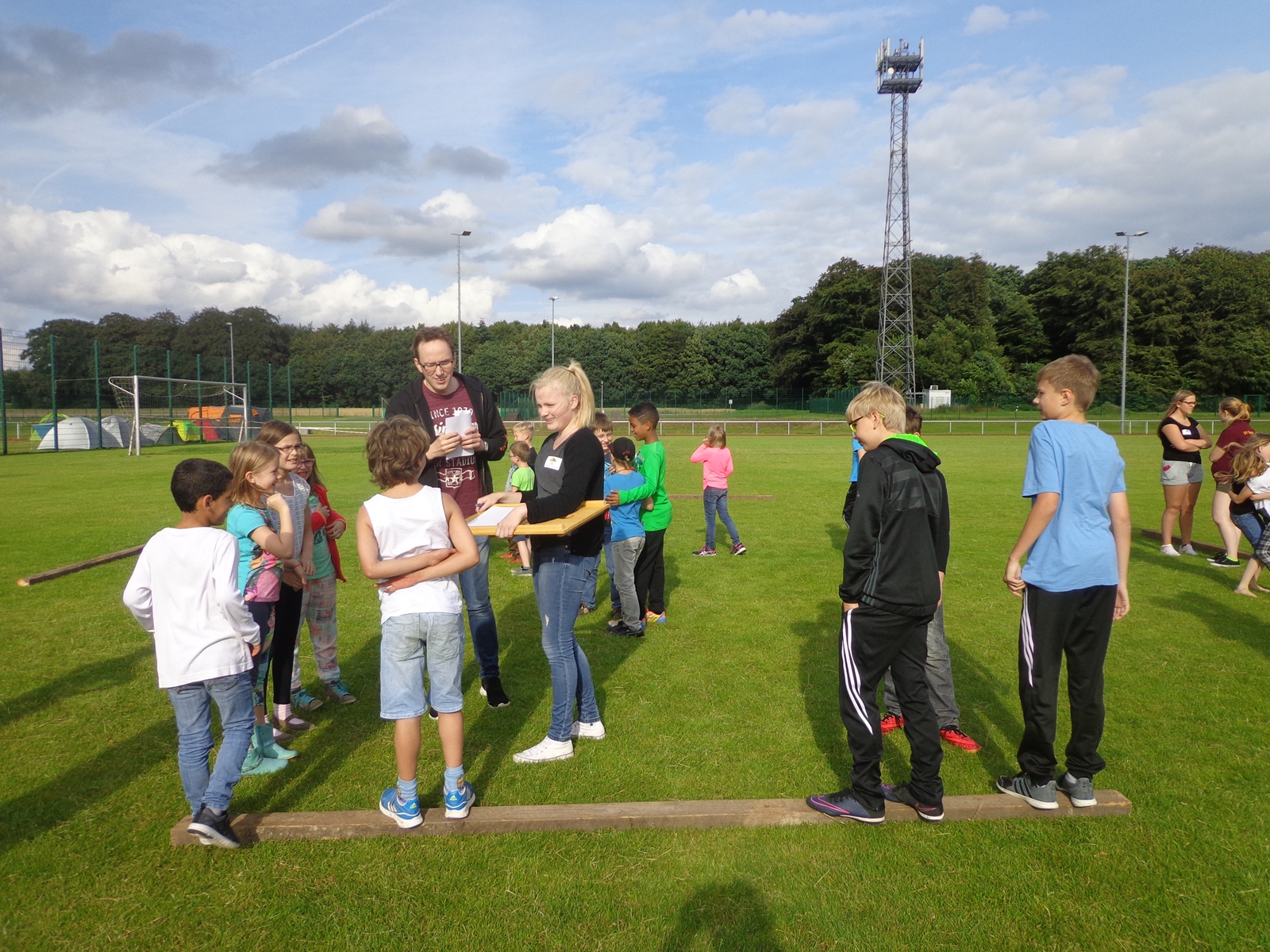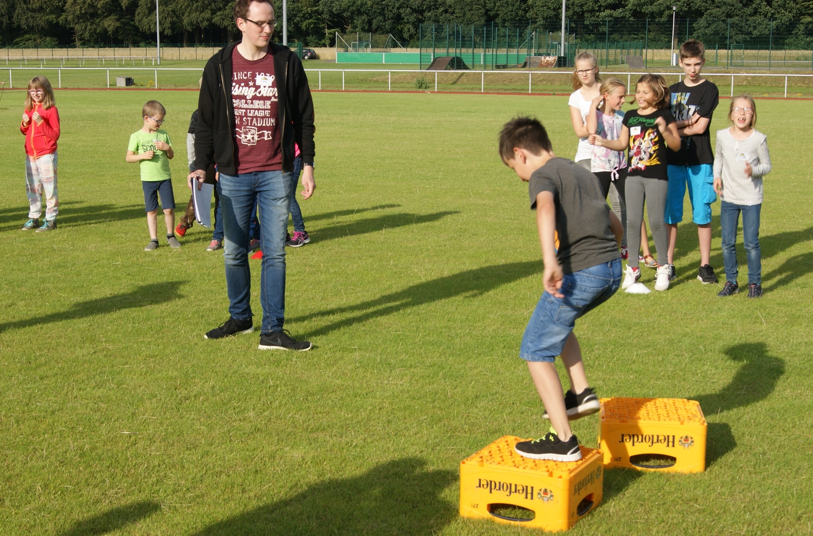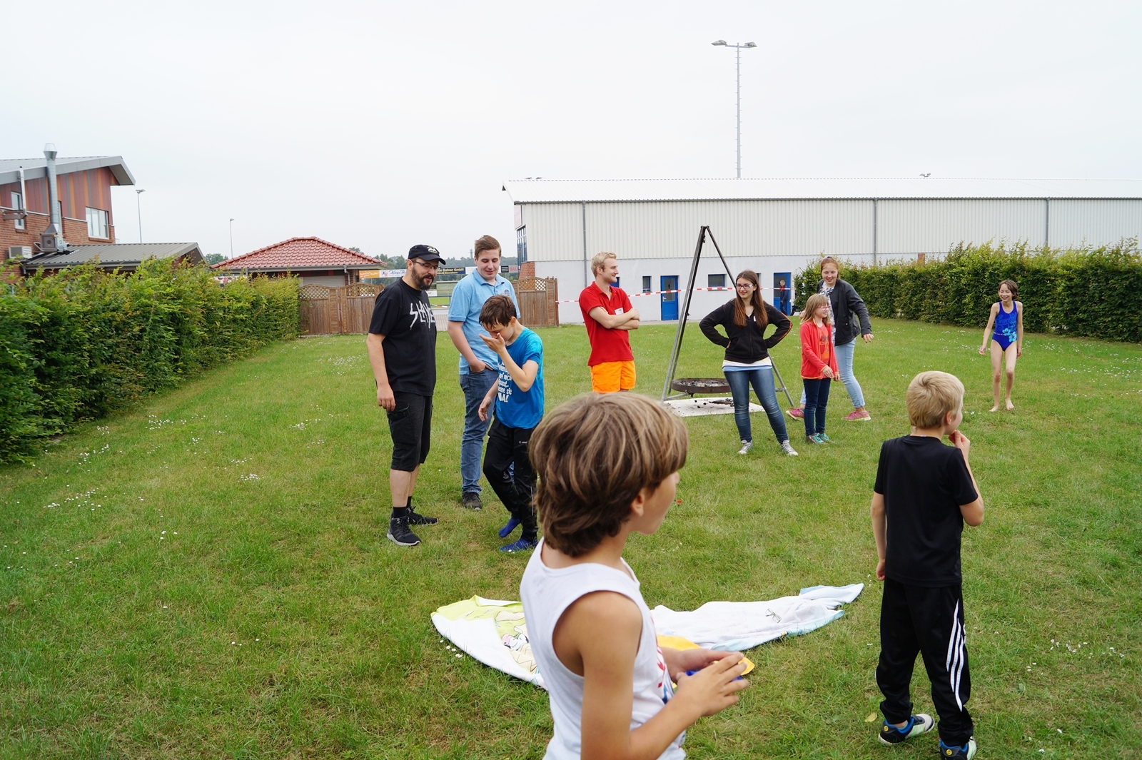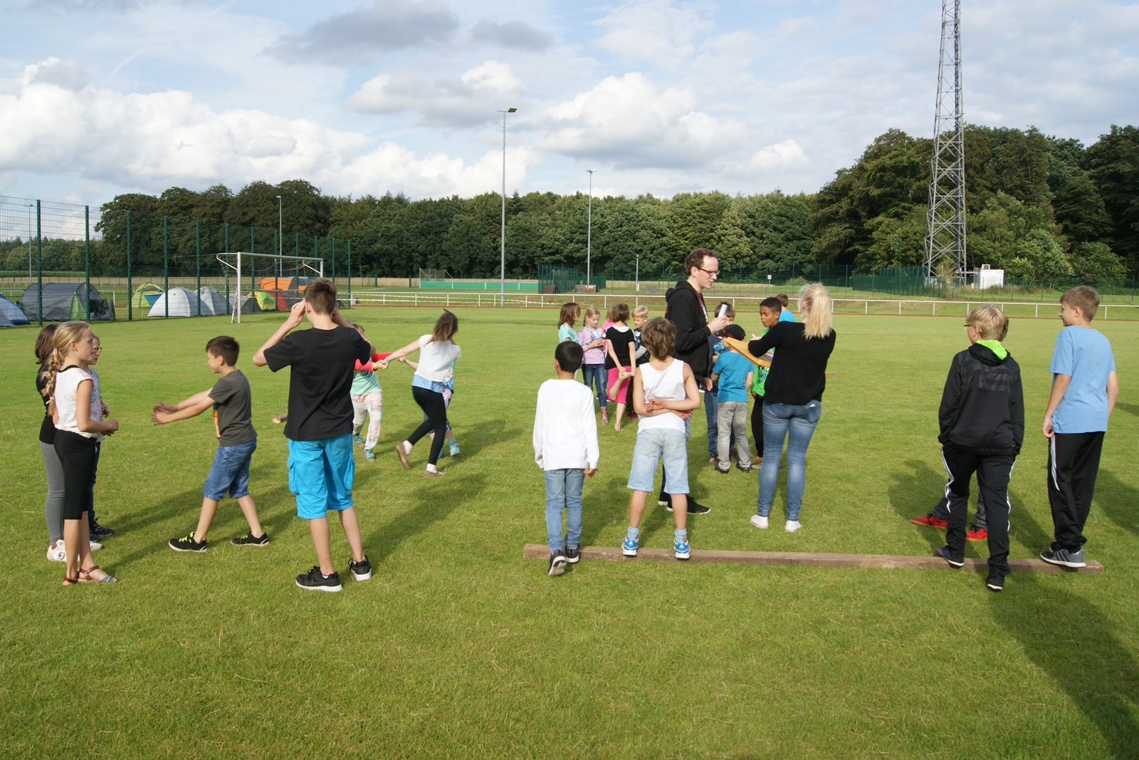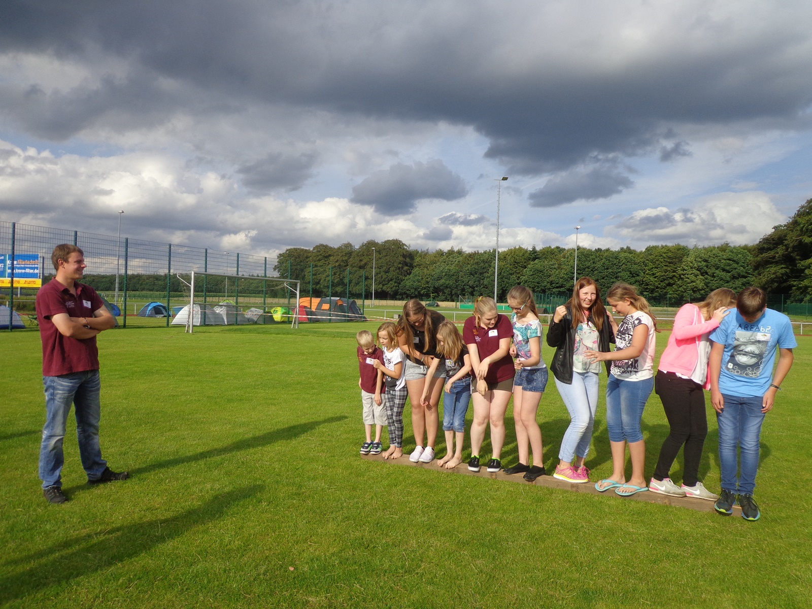 Vor Trinken und Futtern waren aber erstmal Gruppenspiele angesagt, die sich Tobias Winkelmann-Bünte ausgedacht hatte. Insgesamt wurden acht Teams gebildet, die sich mit Namen wie „Blondies“, „Ninjas“ oder „Mondlichter“ mit Begeisterung in verschiedene Aktionen stürzten wie auf dem Balkenbalancieren oder Kisten stapeln.