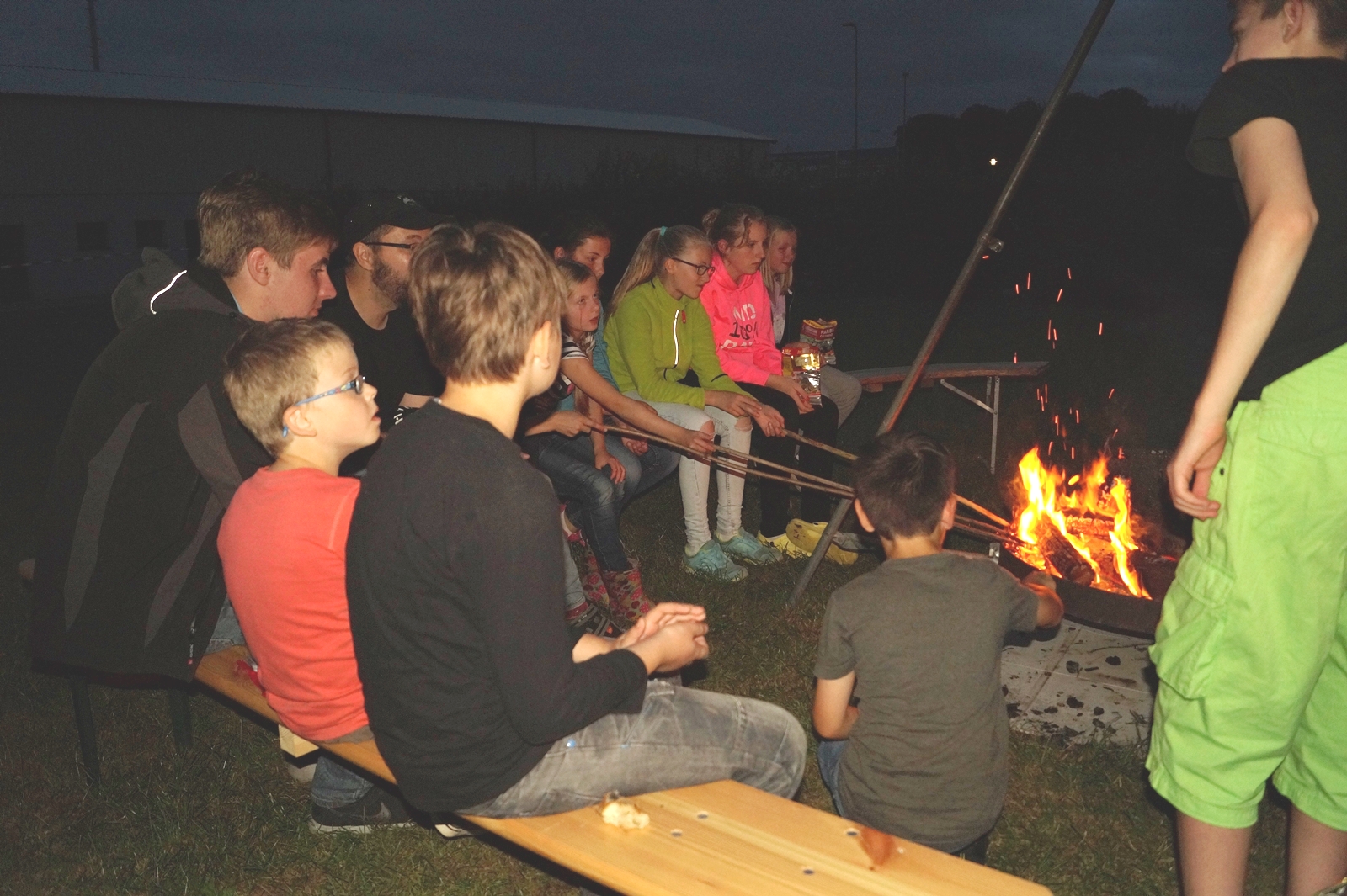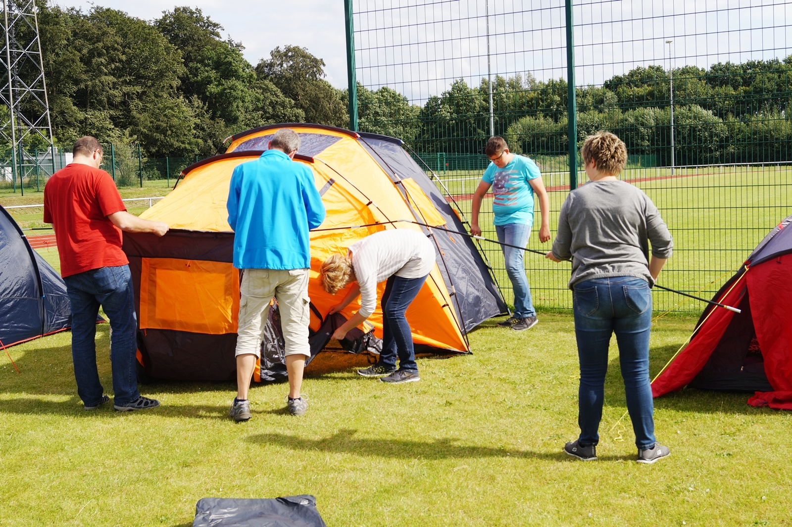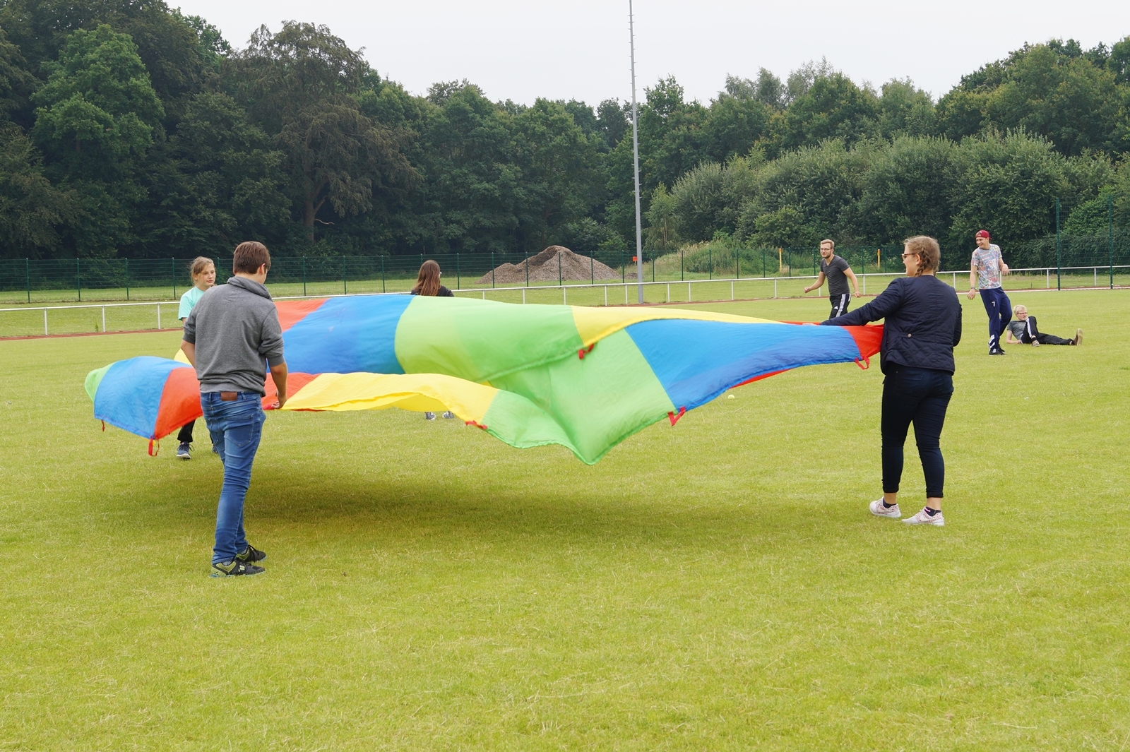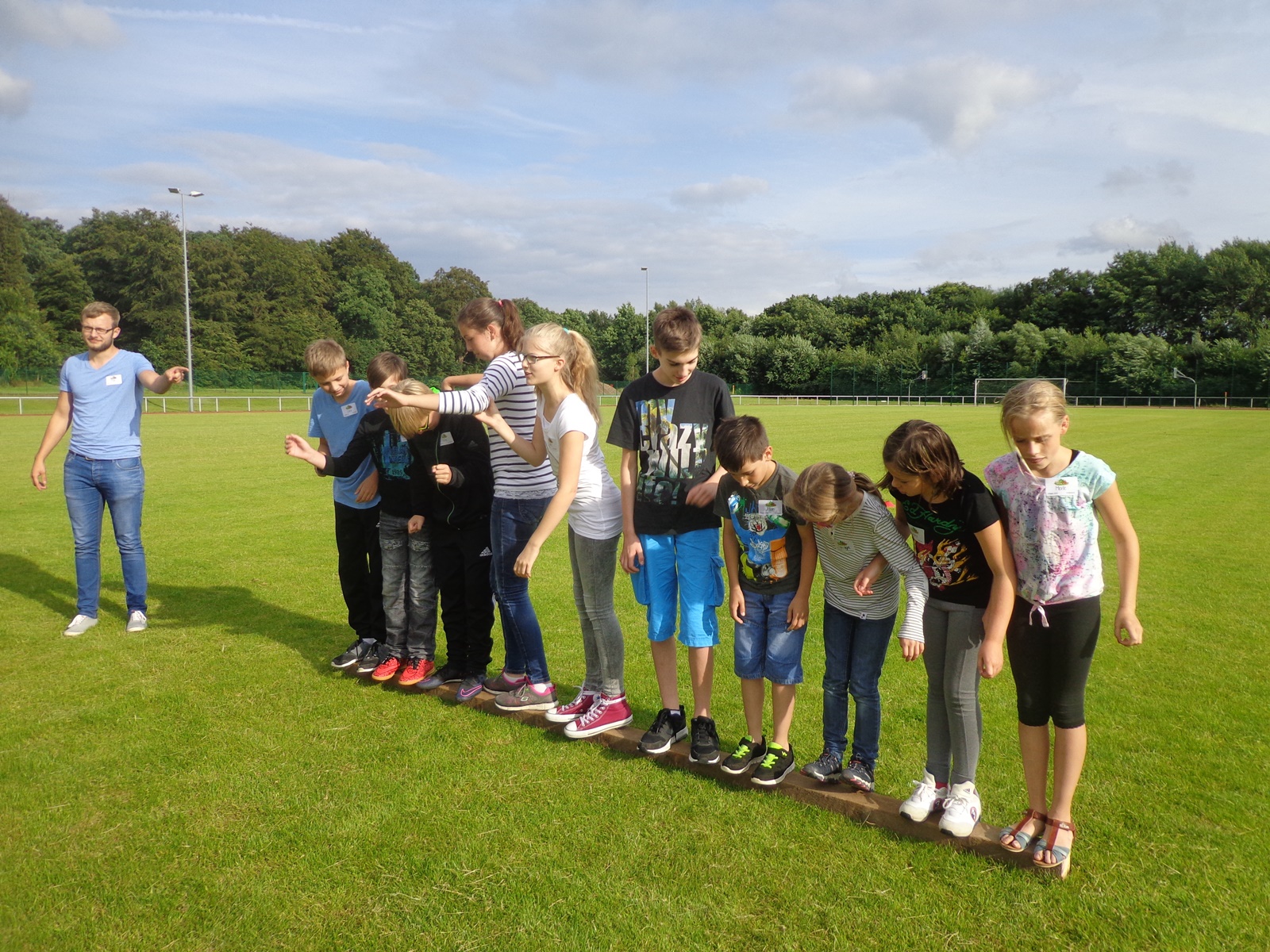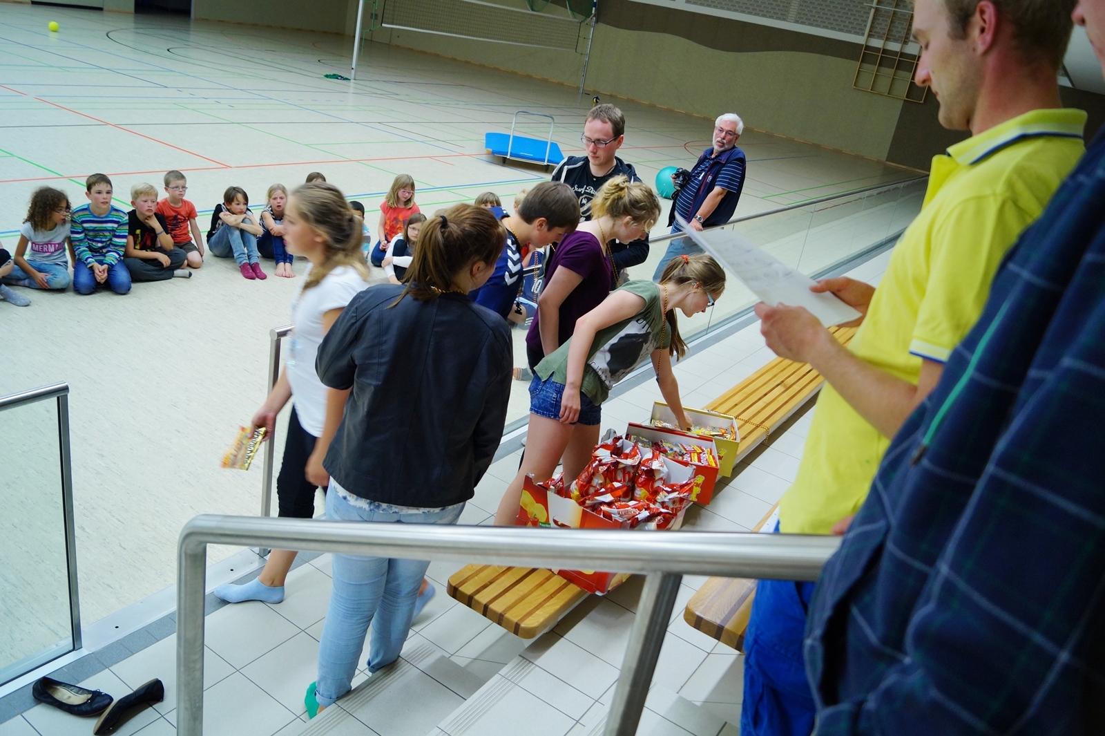 Vor Trinken und Futtern waren aber erstmal Gruppenspiele angesagt, die sich Tobias Winkelmann-Bünte ausgedacht hatte. Insgesamt wurden acht Teams gebildet, die sich mit Namen wie „Blondies“, „Ninjas“ oder „Mondlichter“ mit Begeisterung in verschiedene Aktionen stürzten wie auf dem Balkenbalancieren oder Kisten stapeln.