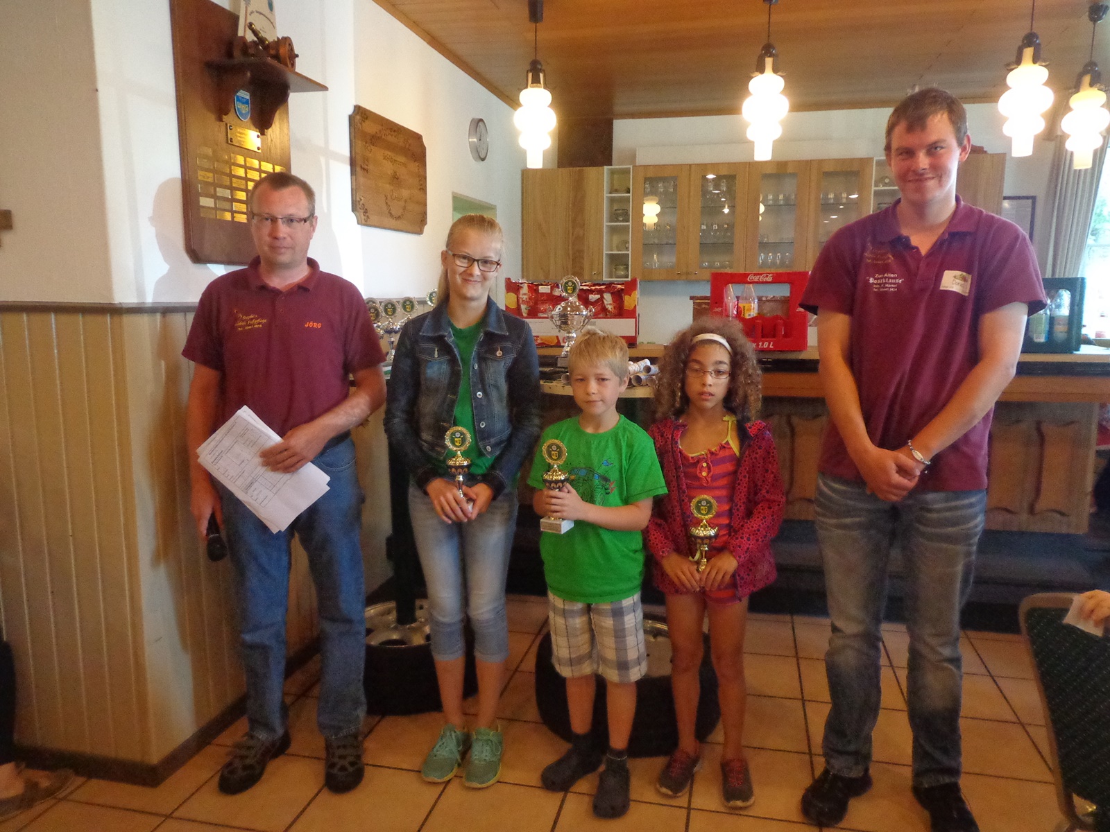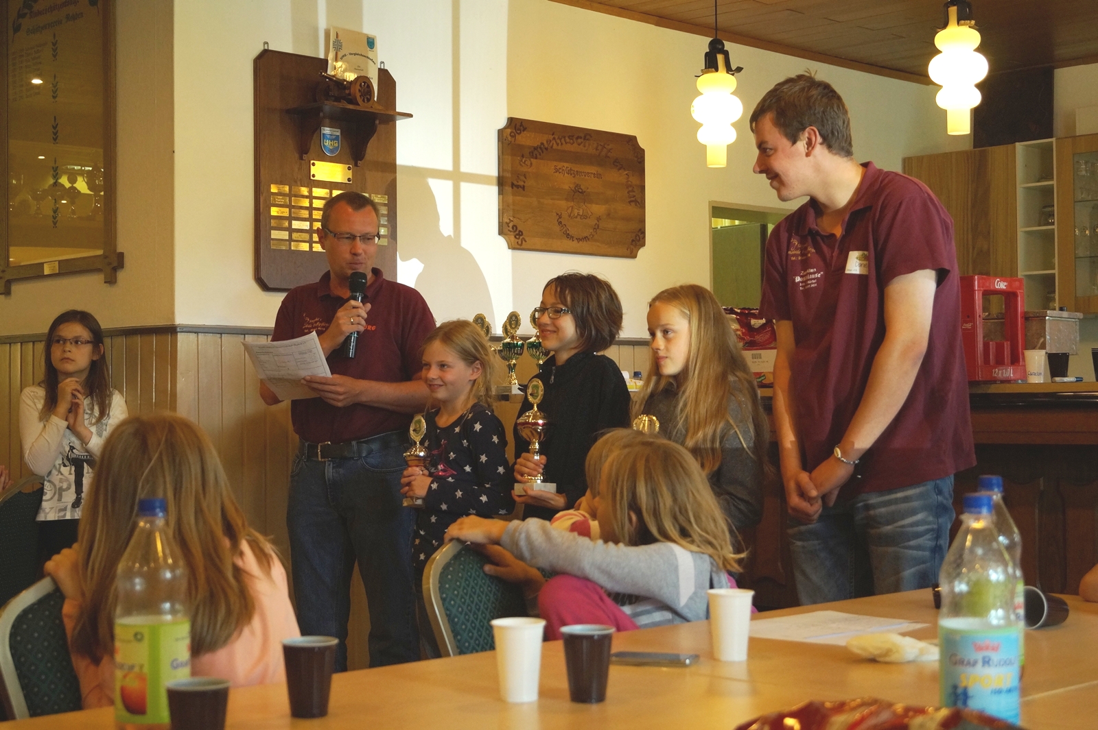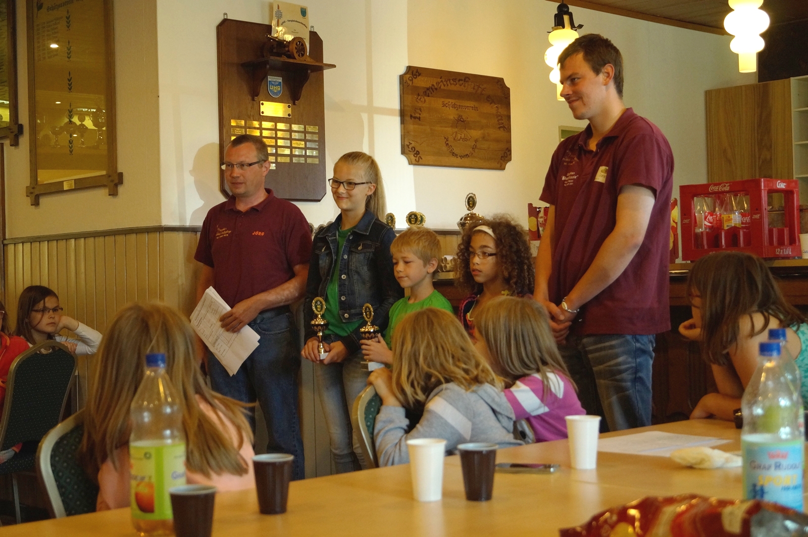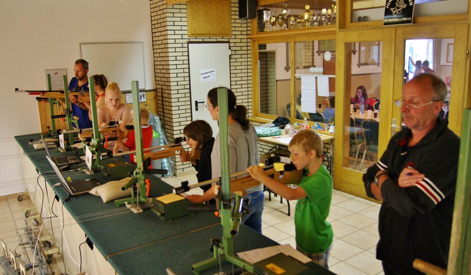Am Sonntagmorgen wurden nach dem Frühstück die Zelte abgebaut, da der „Tag der Jugend“ des KV I in der Schützenhalle in Rehden stattfand, wo eine stattliche Anzahl von Pokalen auf ihre stolzen Besitzer wartete. Die Schießaufsicht hatte alle Hände voll zu tun, um die spannenden Wettbewerbe mit Lichtpunkt- und Luftgewehr abzuwickeln und die Emotionen der Kids in Grenzen zu halten. Nach dem Mittagessen bedankte sich Manfred Rüffer beim ausrichtenden Schützenverein Rehden für die Gastfreundschaft und ausgezeichnete Organisation und gab das Wort weiter an die Jugendsportleiter des KV I, Jörg Picker und Daniel Wilker, die für die Siegerehrung zuständig waren. Die Kinder des Fördervereins schossen mit dem Lichtpunktgewehr, wobei Laura von Zengen vor Merle Mackenstedt und Julie Lippig lag. In der Einzelwertung der Vereine setzte sich Jolina-Marie Tinnemeyer (Rehden) gegen Till-Mathis Tiedemann (Rehden) und Lenie Mattfeld (Brockum) durch.